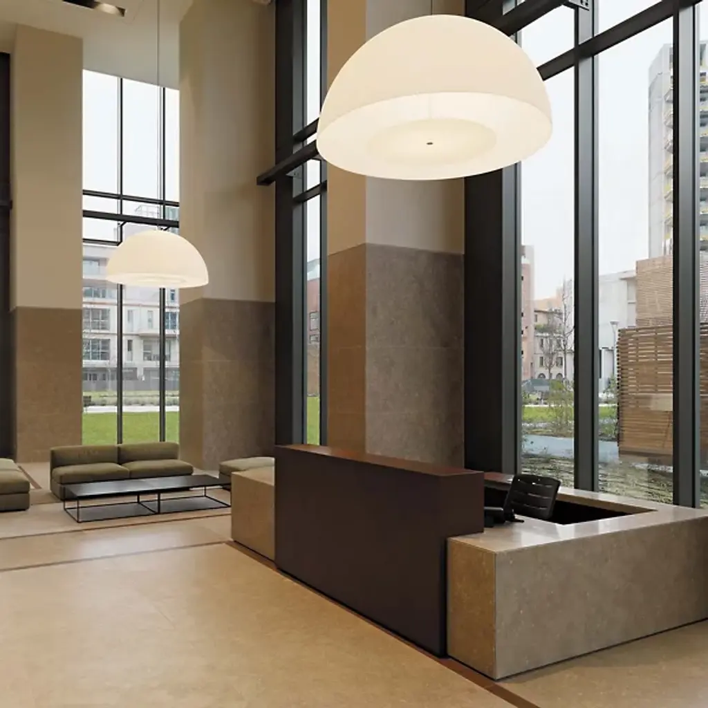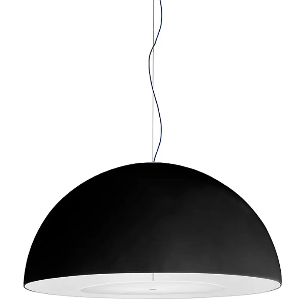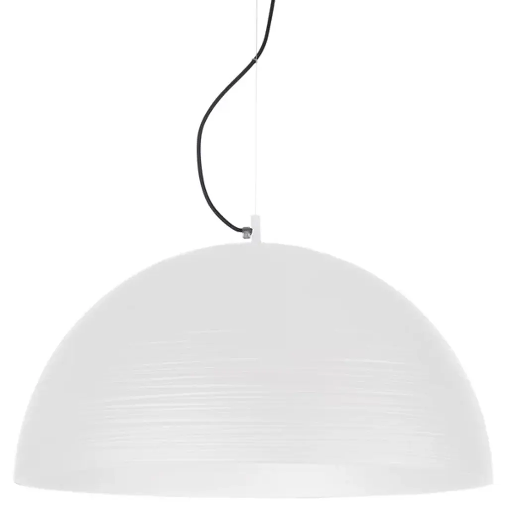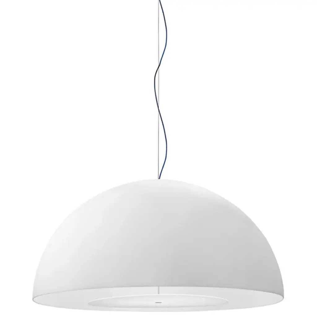 Sophisticated drama. The Avico Pendant by FontanaArte presents a widespread dome-shaped shade that overpowers a space with elegance. Designed by Charles Williams in 2006, this pendant is suspended from a metal canopy and steel cable. Its polyethylene shade boasts a white interior to enhance the bright light from its inner glow. Sending a soft light downward, this fixture creates an intimate and inviting atmosphere while elevating the look of surrounding décor.