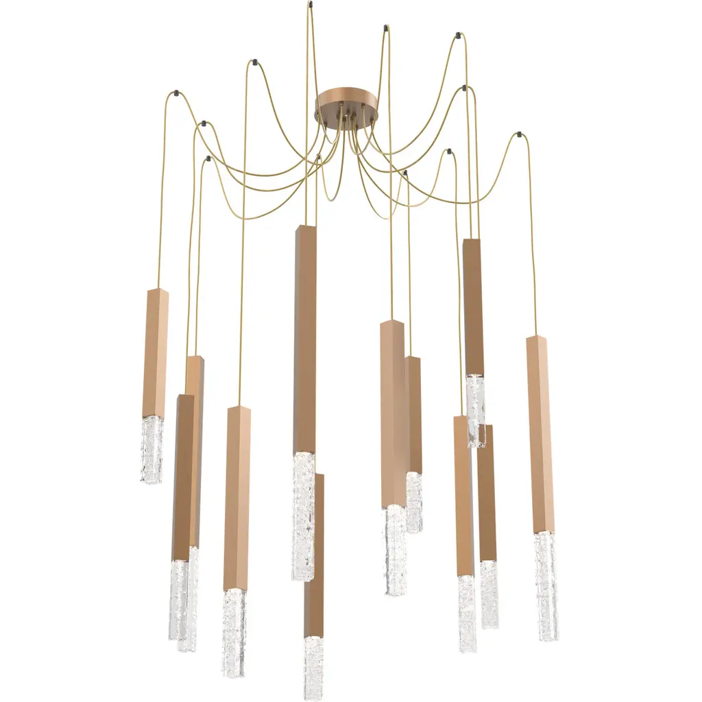 Featuring a standard configuration of our oversized 24, 32 and 40 Axis pendants, this versatile chandelier style enables customization of the placement and height of each pendant. Integrated LED illuminates each artisan cast rod, brilliantly crafted from recycled crystal glass by Hammerton artisans.
