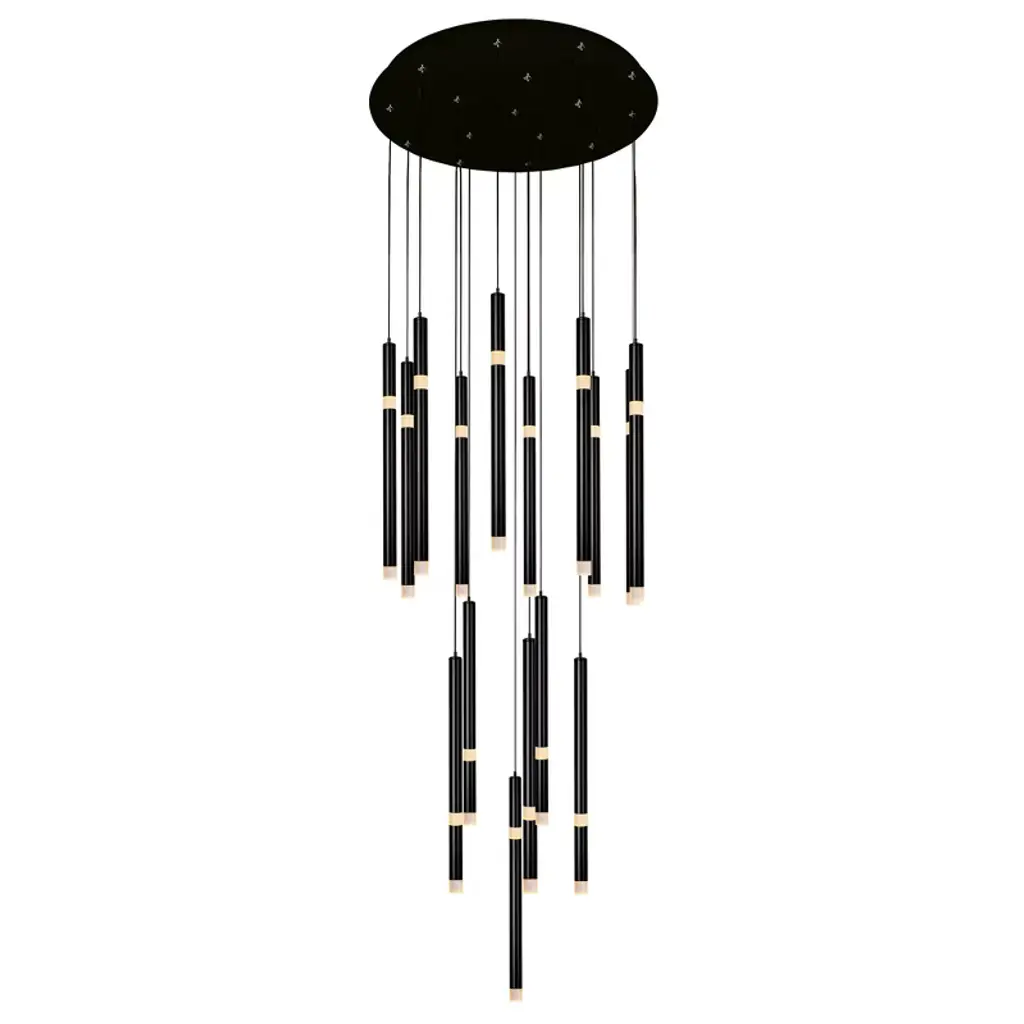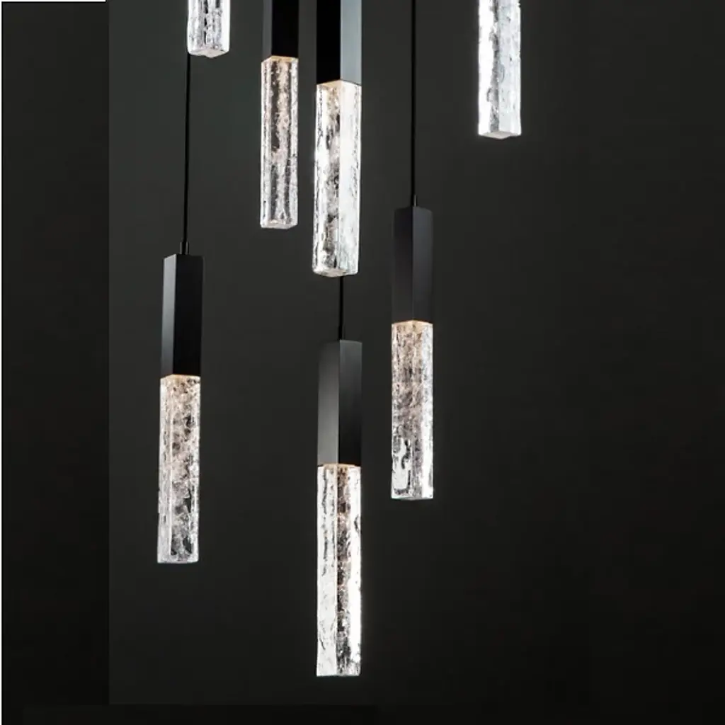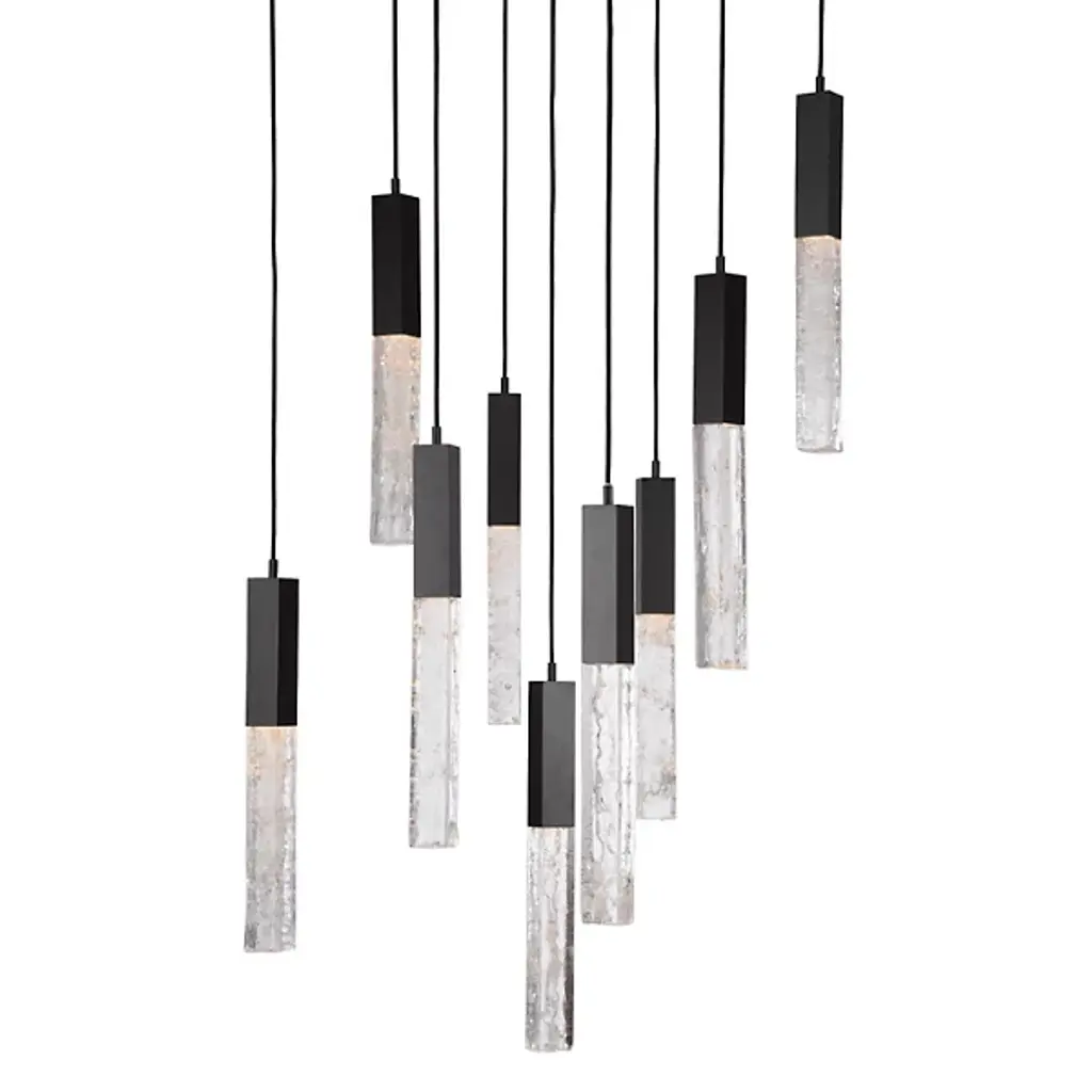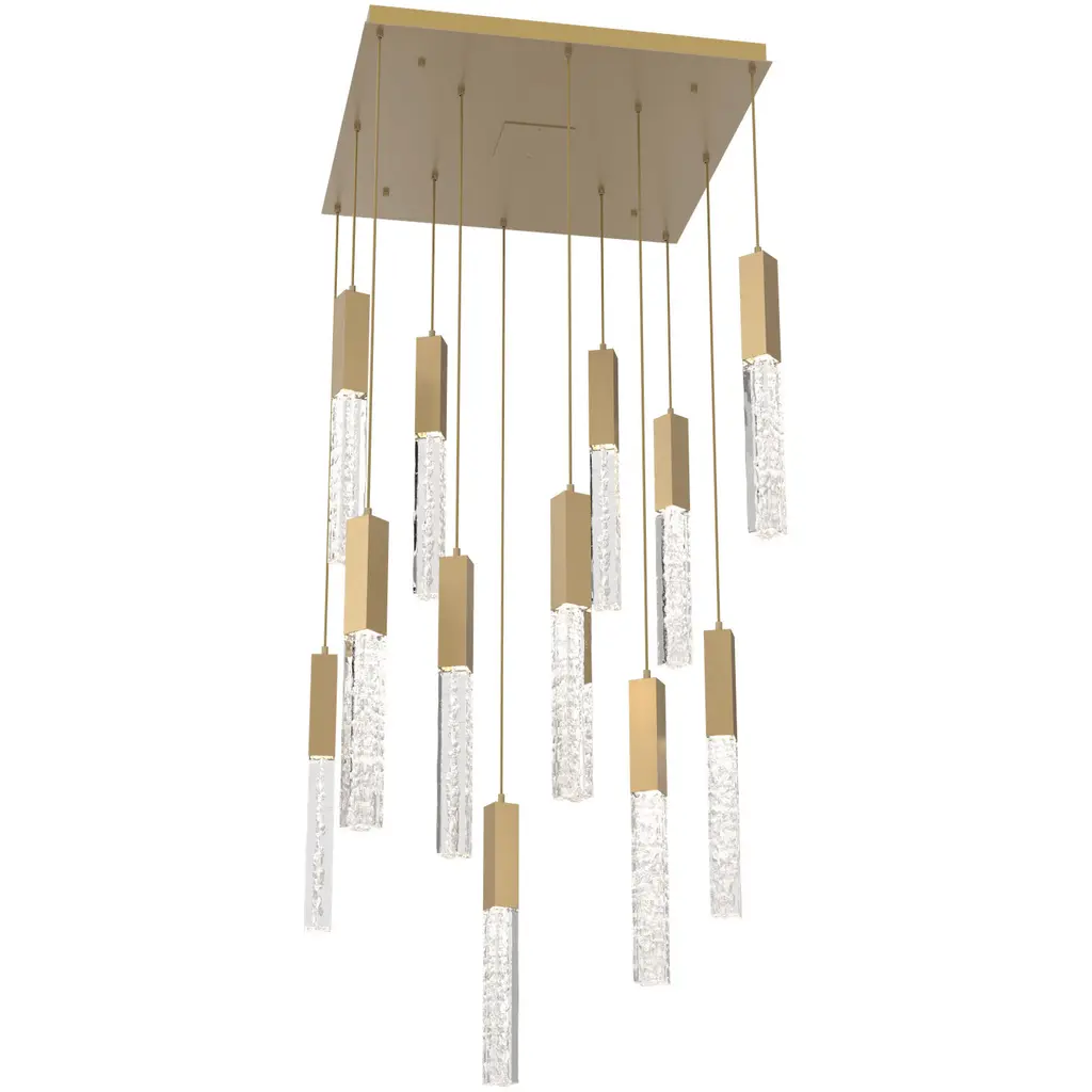 Cool off with the winter-themed stylings of Hammerton Studio's Axis Square Multi-Light LED Pendant. Designed by the seasoned Levi Wilson, this contemporary-minimalist masterpiece drops pendants like icicles from a flat square canopy using thin, but strong cables. Each individual pendant is made of hand-polished metalwork holding an LED behind a long glass diffuser. Made using leftover artisan glass material from other Hammerton glassblowing work, every prism is unique and creates a slightly different pattern when light shines down through it.