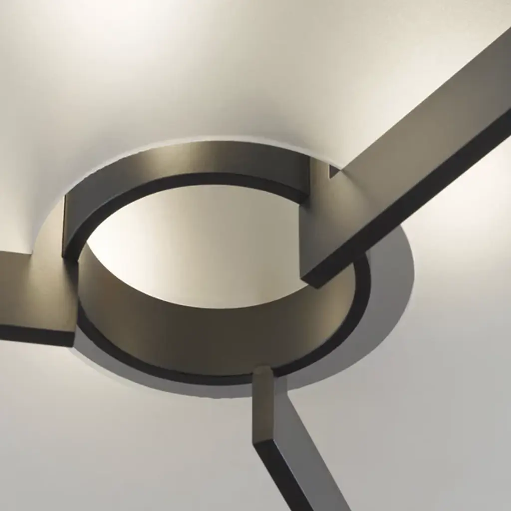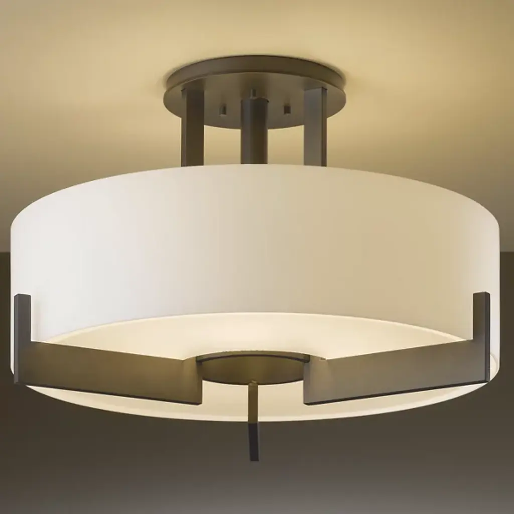 The Axis Medium Semi-Flushmount by Hubbardton Forge features a design that is to its name, with its Pressed Glass shade centered around a wrought Iron "axis." Mixing the elegance of the Glass with the ruggedness of the Iron, this piece sports an aesthetic marked by contrast and in no short supply of style. The fixture's strong organic components make it an excellent addition to soft contemporary spaces that feature stonemasonry, woodwork or other natural elements.