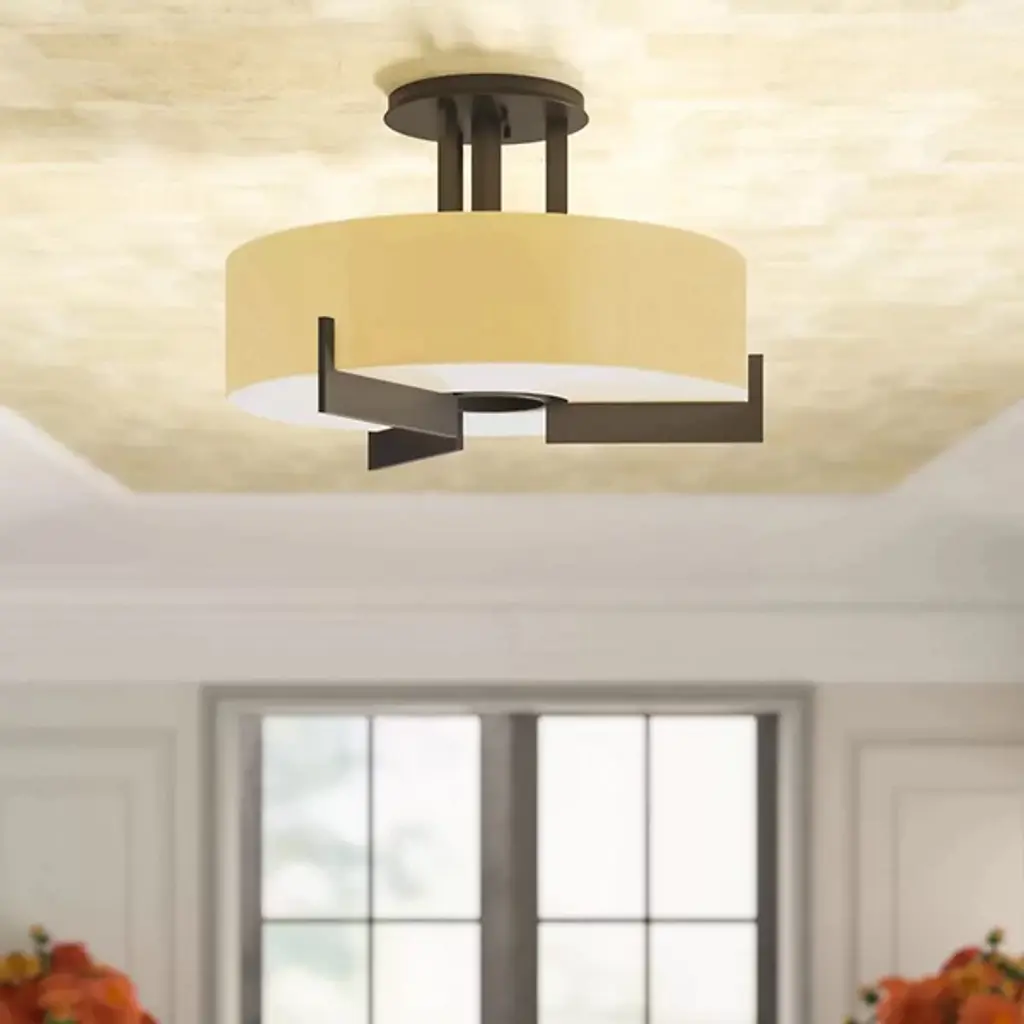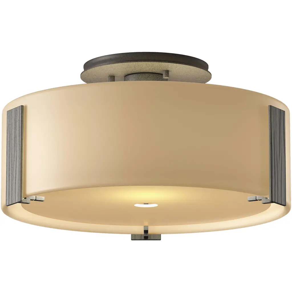 The Axis Medium Semi-Flushmount by Hubbardton Forge features a design that is to its name, with its Pressed Glass shade centered around a wrought Iron "axis." Mixing the elegance of the Glass with the ruggedness of the Iron, this piece sports an aesthetic marked by contrast and in no short supply of style. The fixture's strong organic components make it an excellent addition to soft contemporary spaces that feature stonemasonry, woodwork or other natural elements.