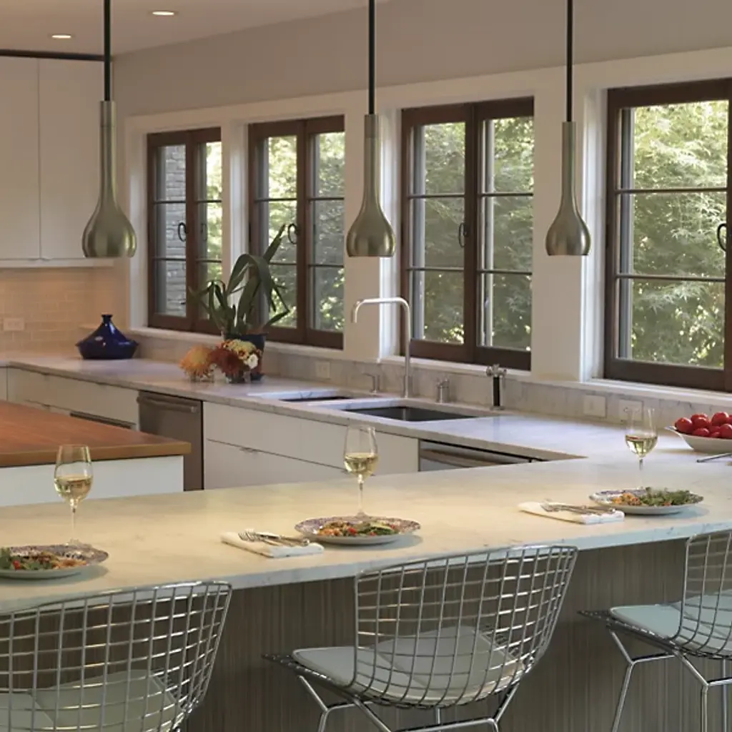 The teardrop shade of the Robert Abbey Axis Mini Pendant provides both a bright wash of downlight and a fluid, metallic accent in modern kitchens or other work spaces. The shade comes in a warm Aged Natural Brass finish with Cocoa Brown accents.