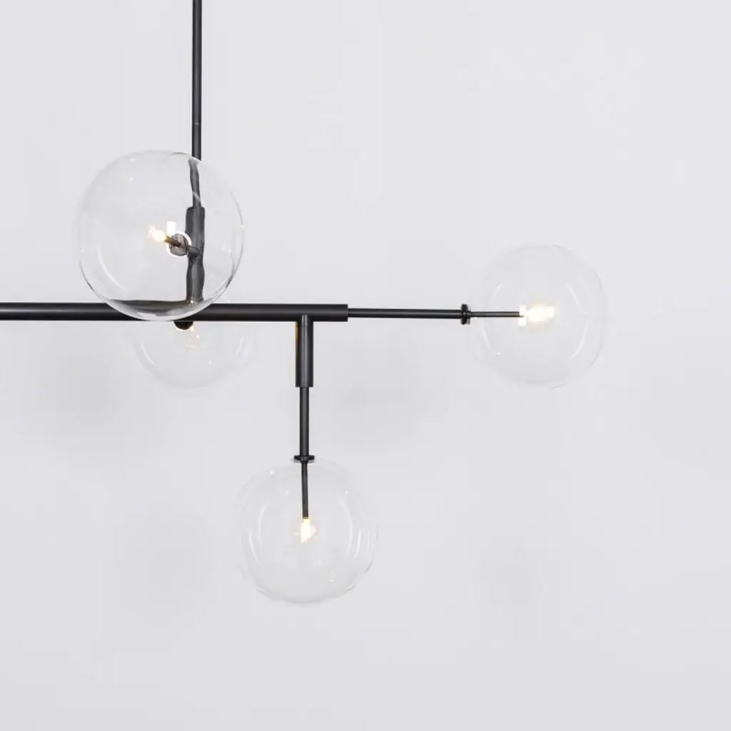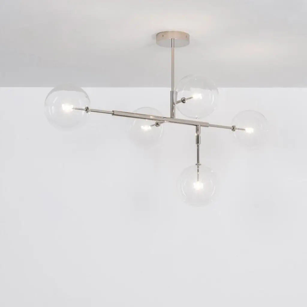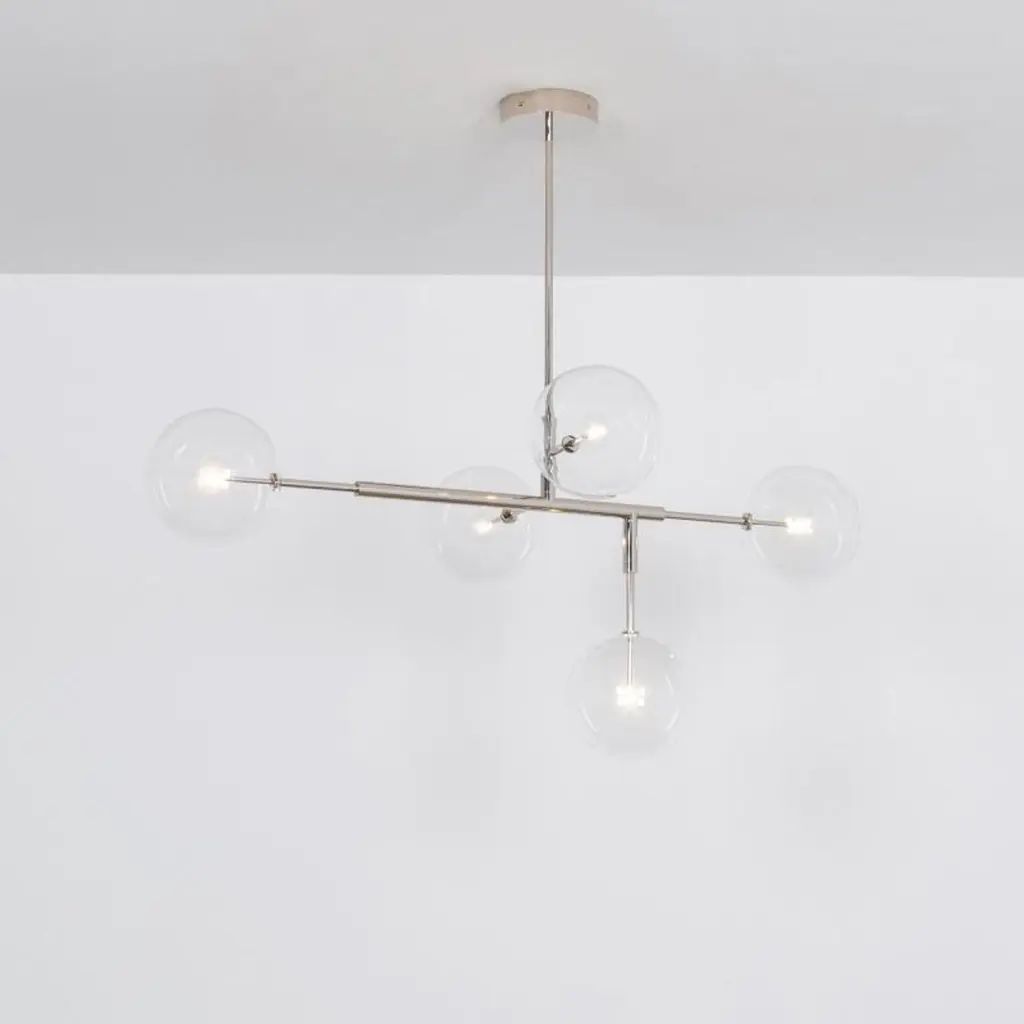 Polished nickel contemporary pendant light by SchwungDimensions: D 72.4 x W 150.6 x H 174.4 cmMaterials: solid brass, hand-blown glass. Finish: polished nickel.Available in finishes: brass or black gunmetal.All our lamps can be wired according to each country. If sold to the USA it will be wired for the USA for instance. Organic improvisation gives way to chic modern order. linear brass branches suspend circular globes of light. Heights are available: 84.4 cm, 99.4 cm, or 129.4 cm. Dimmable with electronic dimmers only. Schwung is a german word, and loosely defined, means energy or momentumm of a positive manner. Synonyms: Verve, zest, panache, momentum.Mission:Developing lighting fixtures through simple and timeless materials, sustainably; we are committed to creating quality products that last. Beginning with the design we are constantly refining aesthetic and function. Both in the lamps themselves and throughout the manufacturing process we pursue a holistic approach to efficiency, and the reduction of environmental impact.Concept:Schwung is a lighting concept, connecting aesthetic and quality through matter. An exploration of history, forms and function, elegantly fulfilling an essential need of modern life, capturing light. Our pieces play with architecture or create spaces of their own. Founded by Dominique sente (Belgium) and rudi nijssen, (Netherlands). What began as a curiosity for objects, a venture in collecting, curating and trading antiques-became a passion to create original designs.Process:From the beginning, schwung home has striven for cutting-edge and quality lighting, handcrafted in Europe. Emphasizing brass and glass, which are not only durable but can be reused indefinitely, our lamps are 98% recyclable. Today the company operates out of an integrated design and manufacturing facility in Poland. This local approach allows us to significantly shorten the product lead time and greatly improve quality standards.All our lamps can be wired according to each country. If sold to the USA it will be wired for the USA for instance.