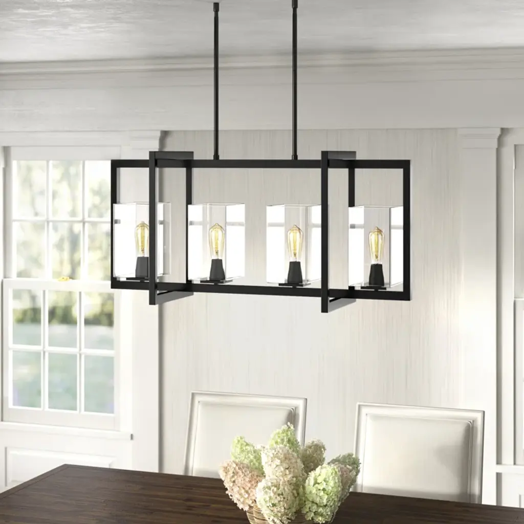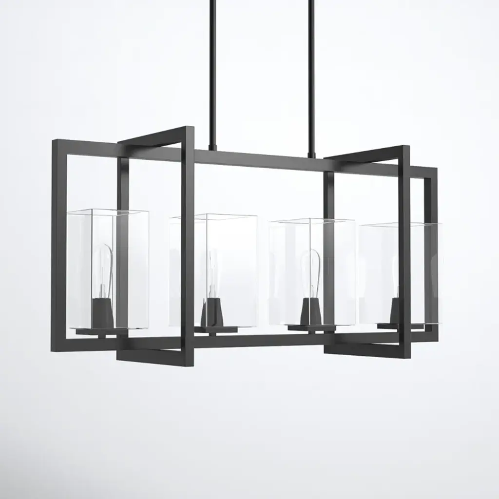 Make a statement with our 4-light rectangular pendant. Crafted from steel and transparent glass, this geometric fixture works with decor styles from modern farmhouse to industrial. It's compatible with sloped ceilings and hangs from adjustable downrods to suit your space. Plus, this light works with a dimmer switch for an effortless transition from day to night. We love how this fixture looks styled solo above a dining table or kitchen island.