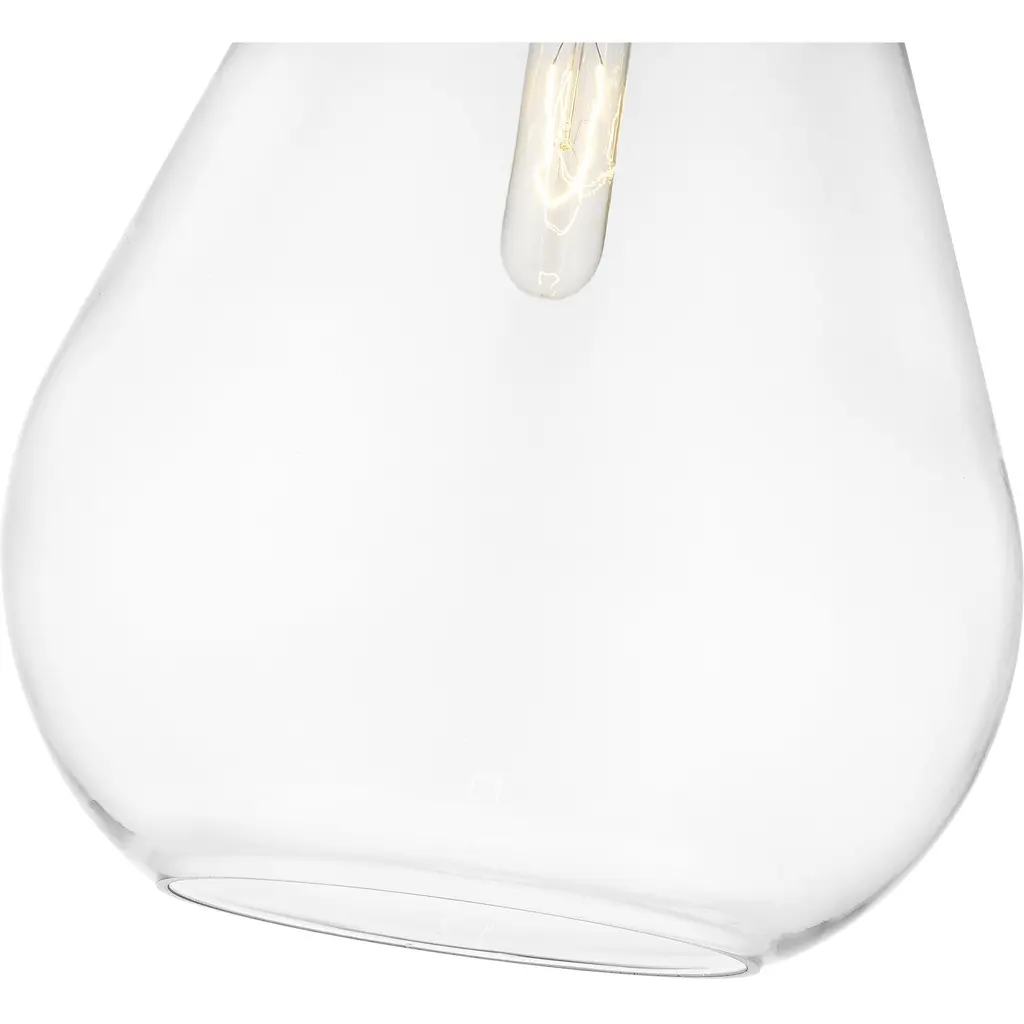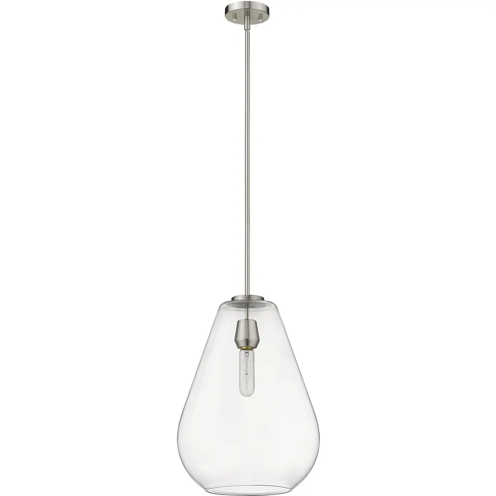 An eye-catching one-light pendant perfectly encapsulates the modern aesthetic. The tapered bell-shaped shade is made from clear glass, suspended from a steel frame with a sleek brushed nickel finish. The fixture brings a chic cutting edge to a contemporary kitchen or dining room.