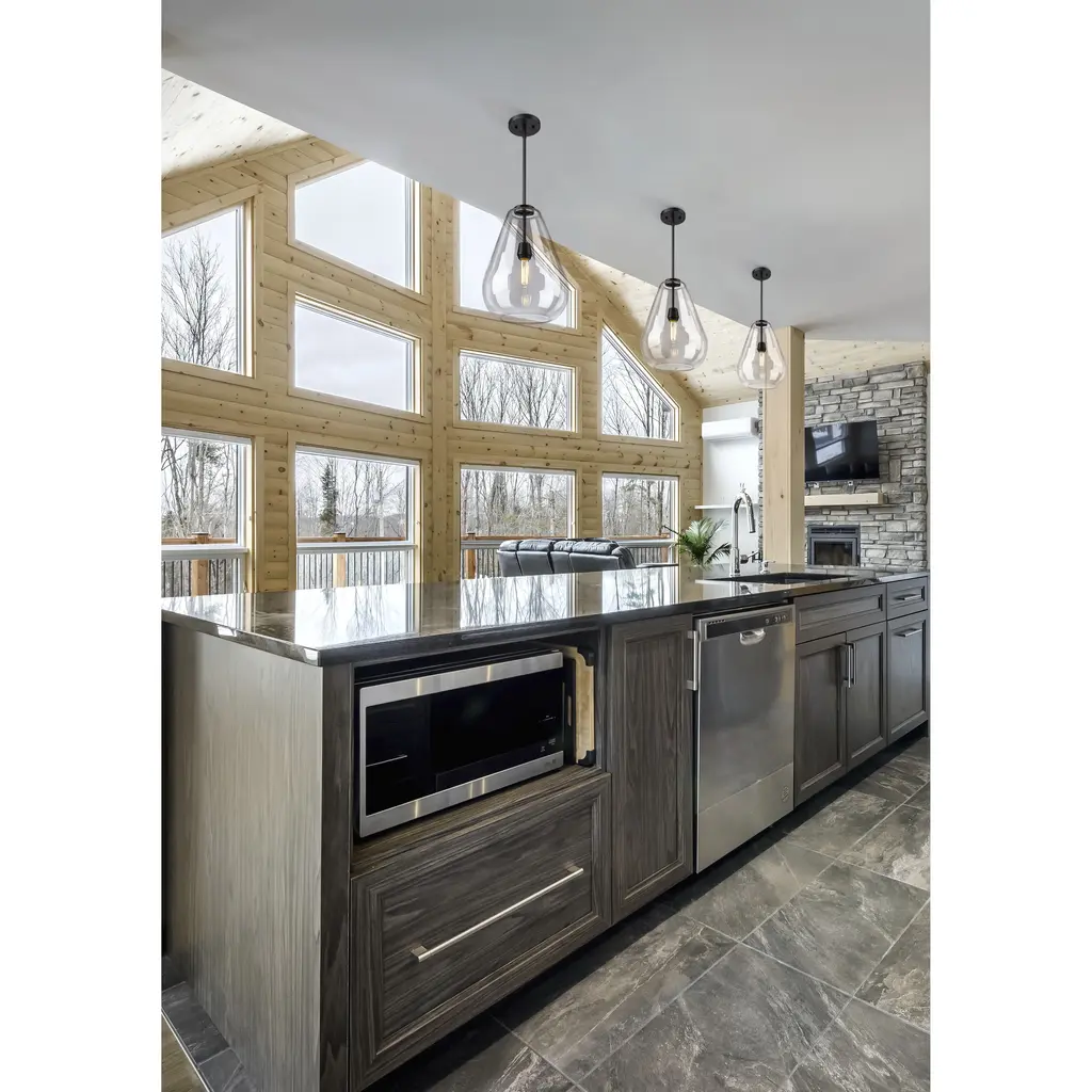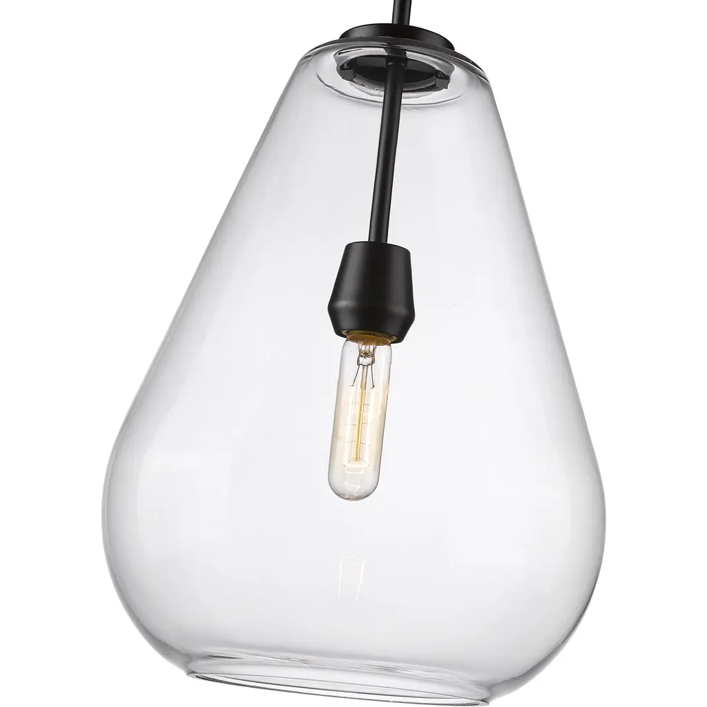 An eye-catching one-light pendant perfectly encapsulates the modern aesthetic. The tapered bell-shaped shade is made from clear glass, suspended from a steel frame with a sleek matte black finish. The fixture brings a chic cutting edge to a contemporary kitchen or dining room.