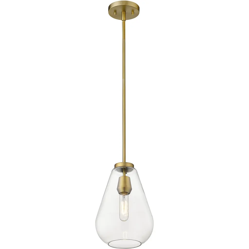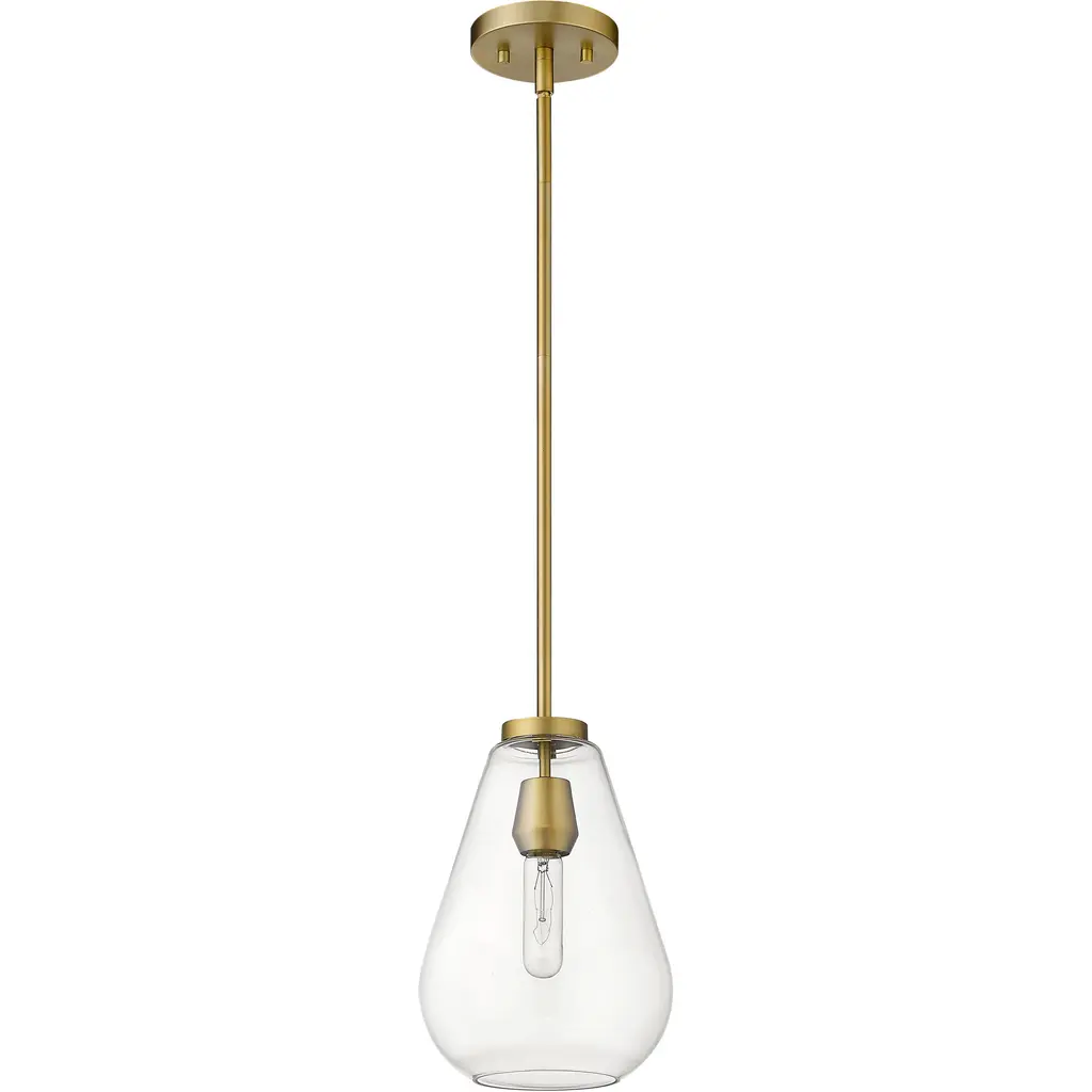 An eye-catching one-light pendant perfectly encapsulates the modern aesthetic. The tapered bell-shaped shade is made from clear glass, suspended from a steel frame with a sleek olde brass finish. The fixture brings a chic cutting edge to a contemporary kitchen or dining room.