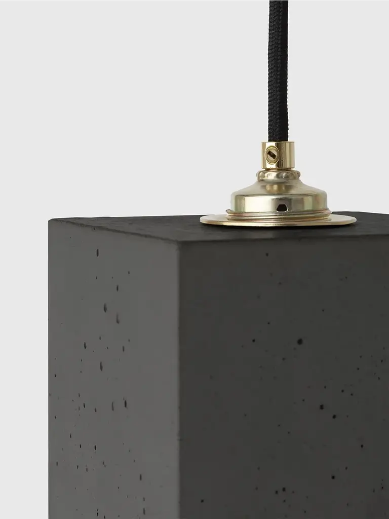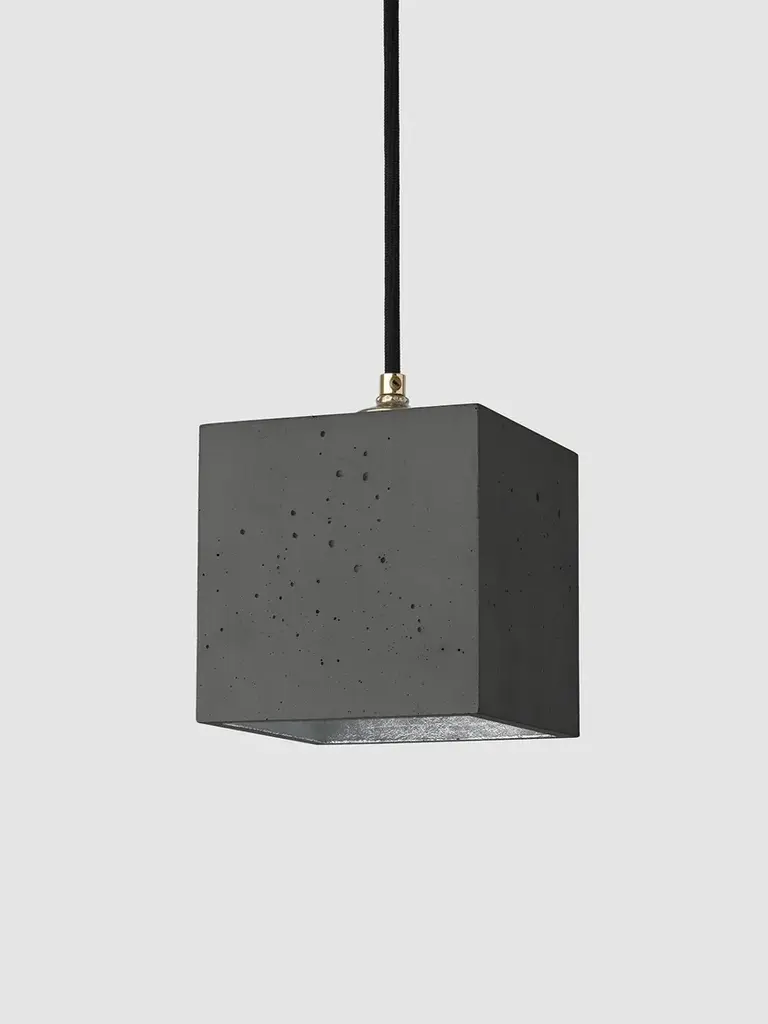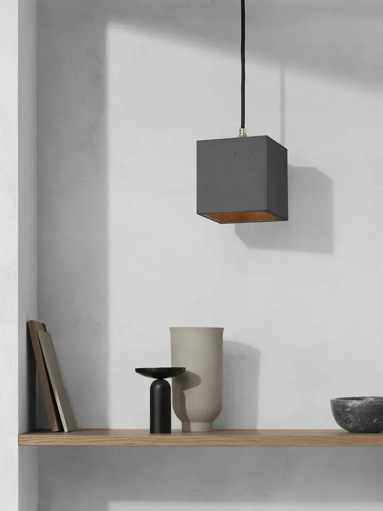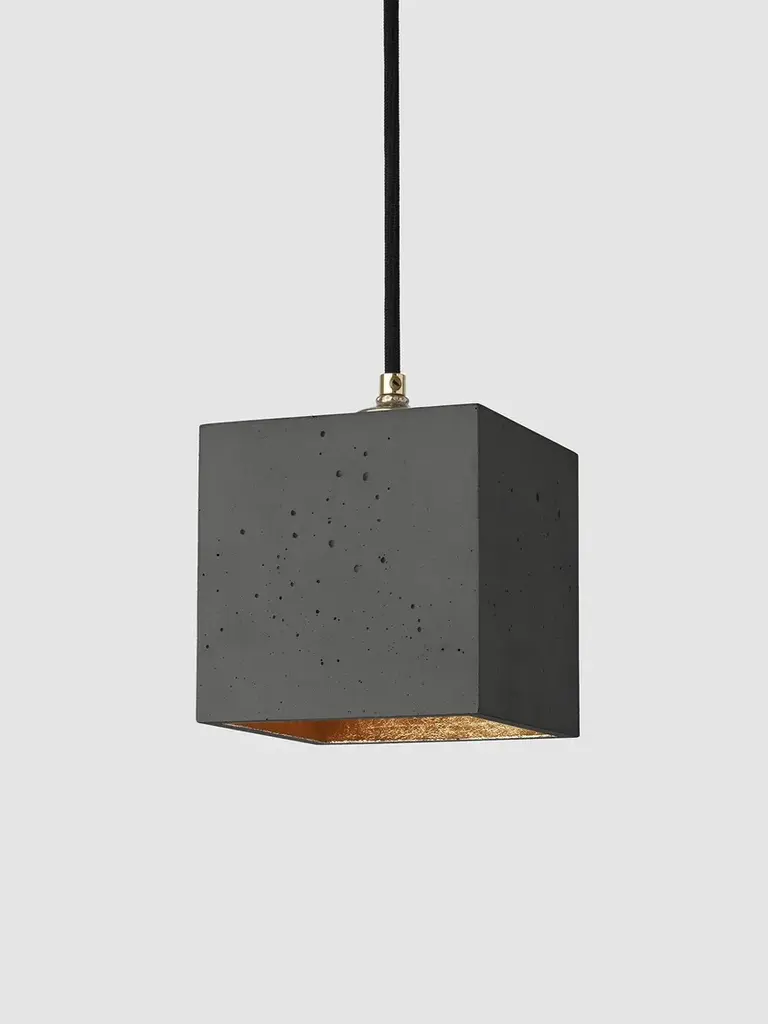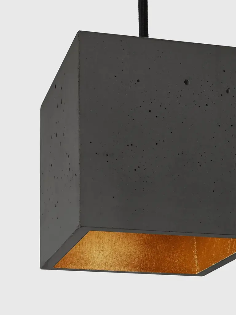 [B1] dark Pendant Light Cubic - dark grey concrete with gold, silver or copper plating on the inside - handmade by GANTlights in Berlin. The lamp can be used solitary as an "eye-catcher" or combined in a series above a dining table, a sideboard, a desk, or a bar for example. Due to its minimalistic design and the contrasting materials, the lamp is modern and timeless at the same time and can therefore be combined with any style.Included: The handmade lamp shade is delivered ready to install with an E27 brass mount, cable restraints, 1.8m / 3m / 5m of black / white / grey textile cable, mounting hardware and black canopy.Watts / beam angle: 40W / 100°The lamp requires an E27 bulb (please note that the bulb is not included).