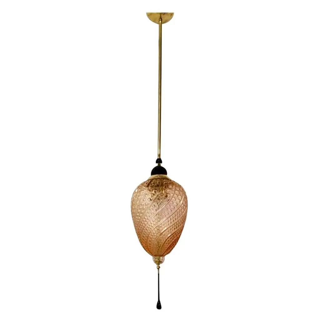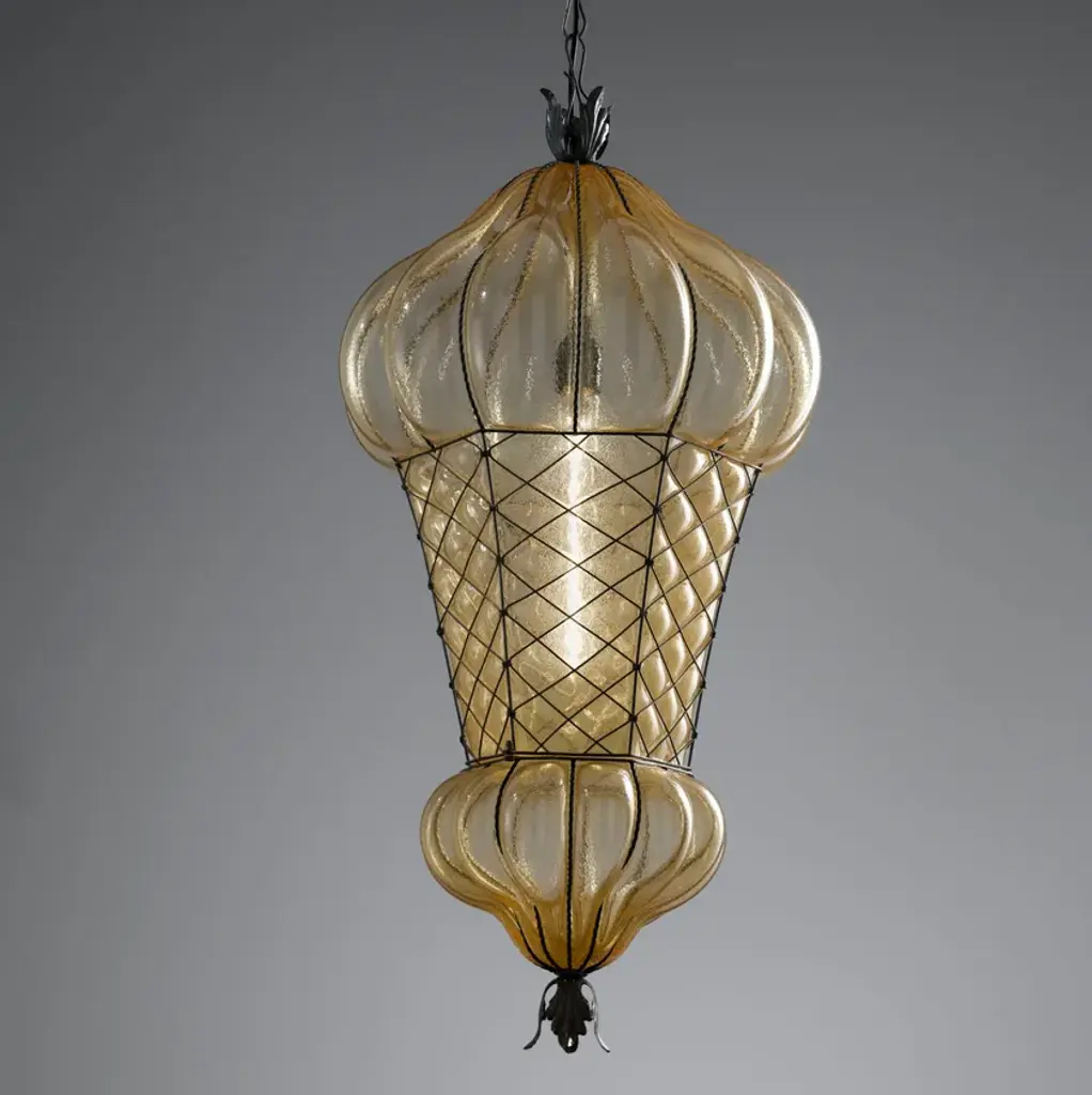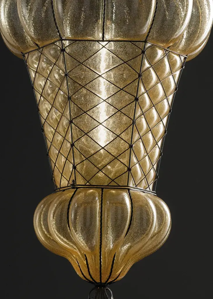 Murano glass pendant lamp.It has an extremely classical Arabic style line.The end pieces are constructed from a braided wire leaving full freedom to the glass to show its roundness.A diameter-2 shaped network imprisons glass forcing it into a regular shape.