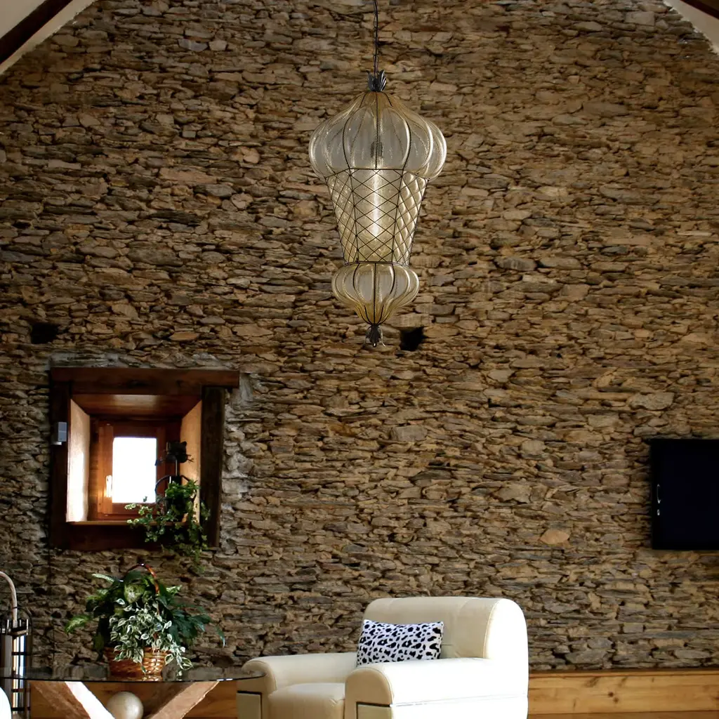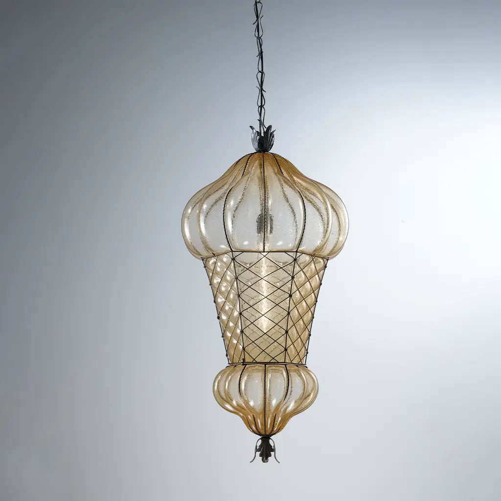 This magnificent lamp will add a touch of opulence to a living room, thanks to the amber color of its Murano glass shade and the sinuous shapes of the bronzed steel structure. The glass is mouth-blown into the structure that encapsulates it, creating its shape and the characteristic curved wedges of its silhouette for a series of unique effects when lit. The lightbulb is E27 max 150W (also available in the version UL E26 max 60W).