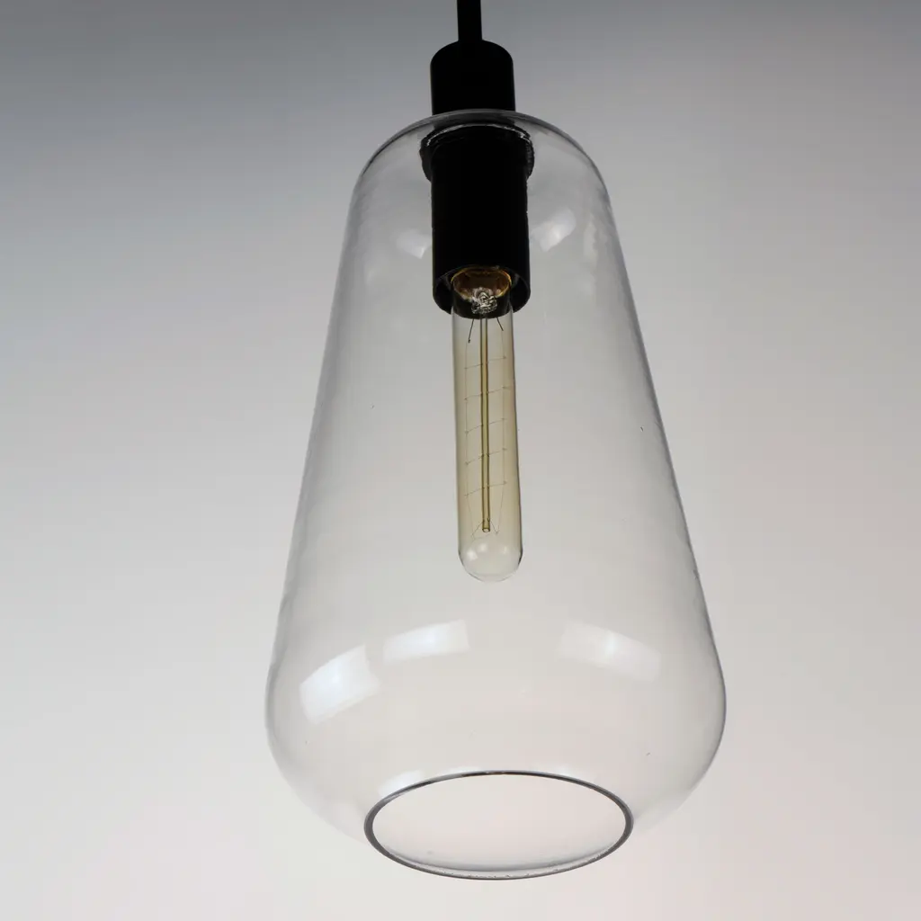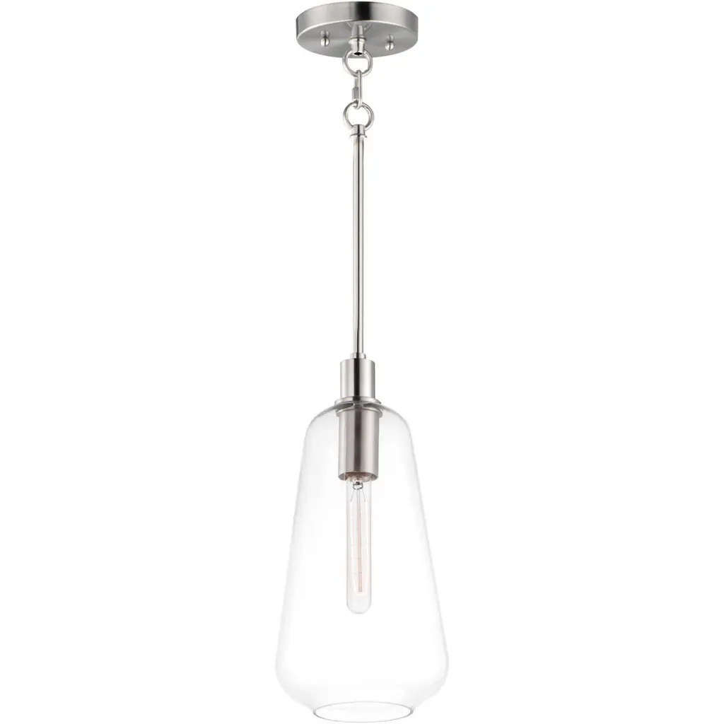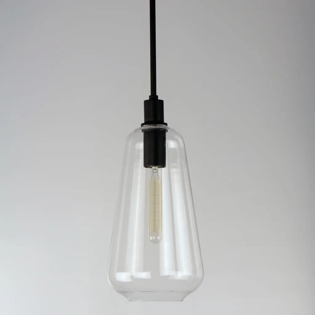 Pendants of Clear glass in unique elongated and undulating shapes with various sizes. This series pairs well with popular finishes in hardware and plumbing, giving you the flexibility to take chances with designer statement pieces. The metalwork is available in your choice of Matte Black, Satin Brass, or Satin Nickel. A coordinating wall sconce pairs well with the collection. Use filament bulbs to complete the look.