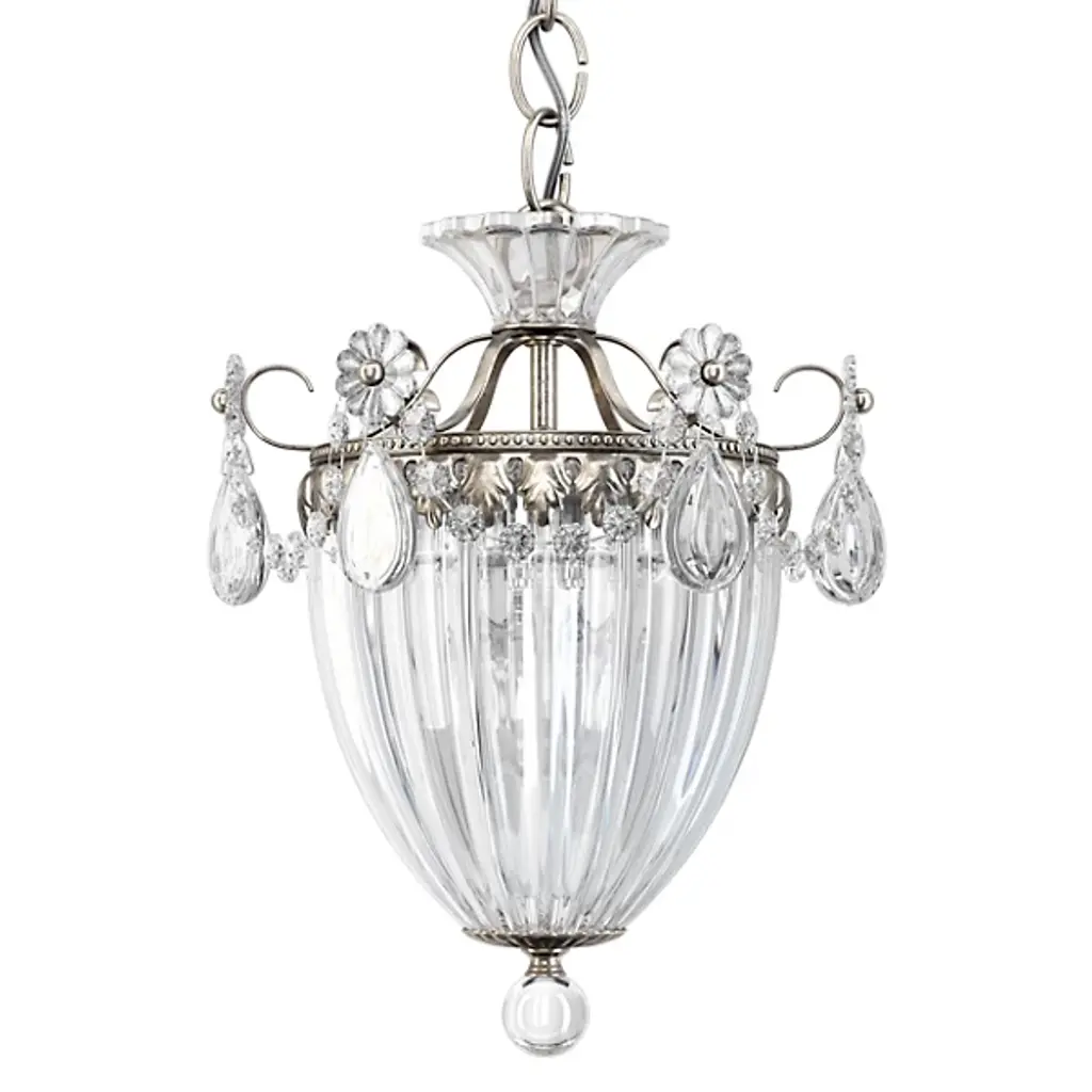 The Schonbek Lighting Bagatelle Pendant reinterprets classic lantern motifs with delicate, sparkling detail. Numerous hand-crafted Heritage Handcut crystals trim the fluted glass shade. The metal frame features complementary curves and is available in a variety of finishes to coordinate seamlessly with any traditional color scheme.