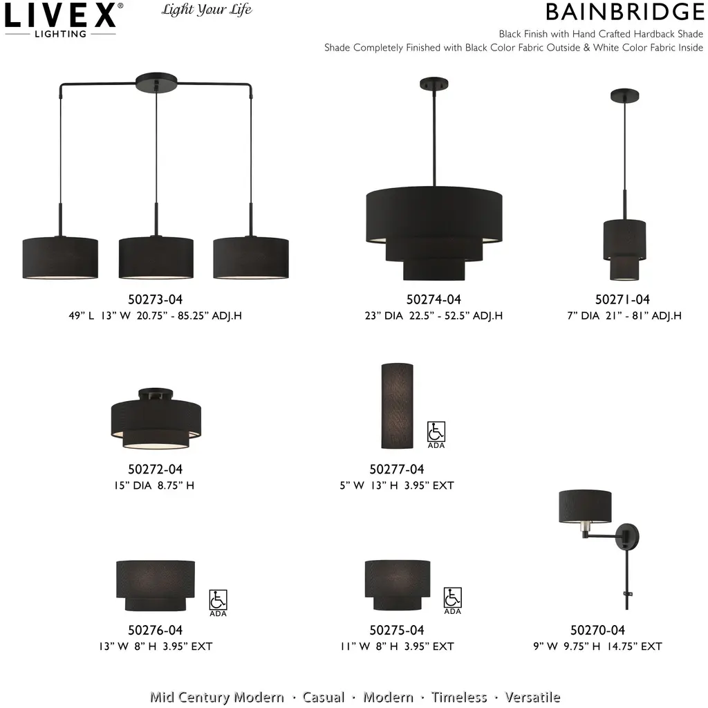 This 1 light Mini Pendant from the Bainbridge collection by Livex Lighting will enhance your home with a perfect mix of form and function. The features include a Black finish applied by experts. This item qualifies for free shipping!