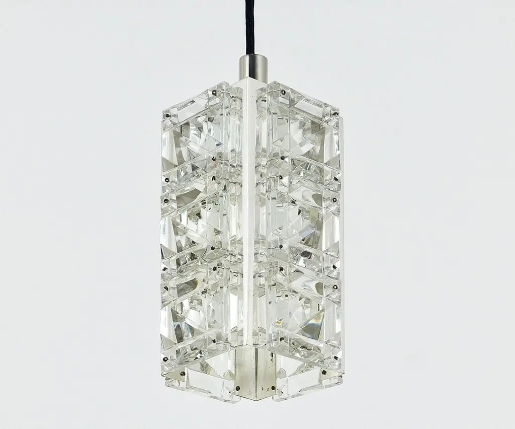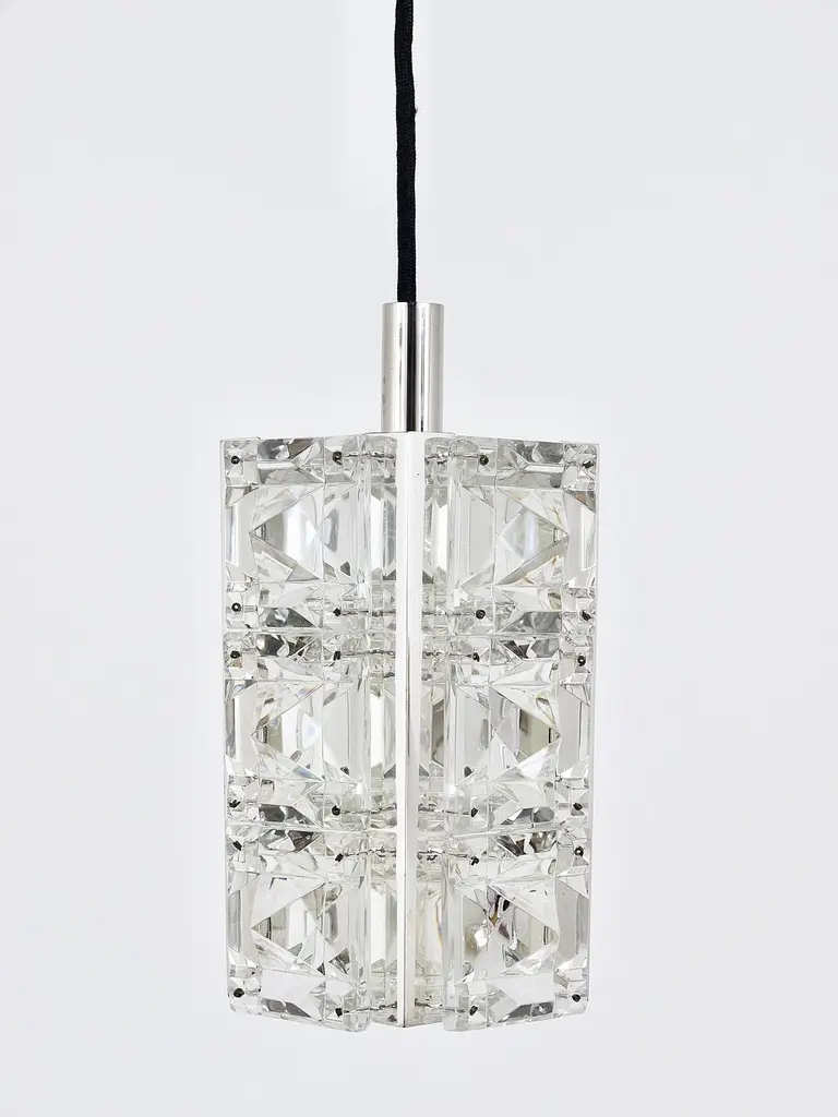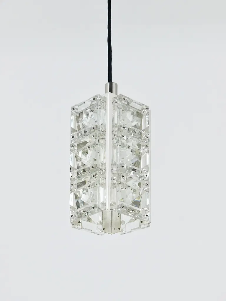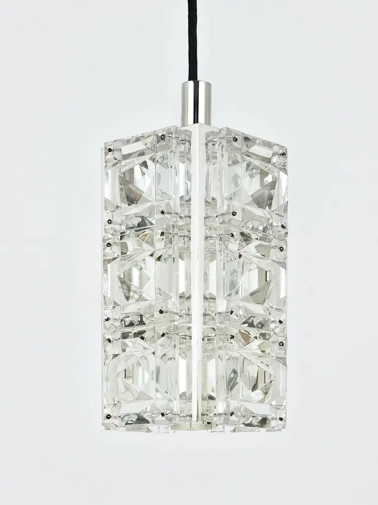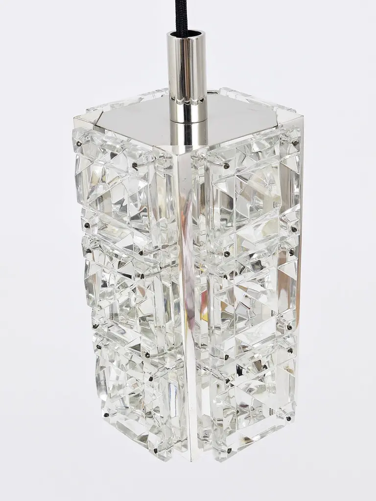 Up to three beautiful square pendant lights from the 1960s, executed by Bakalowits & Söhne in Austria. Square triangular-faceted glass crystals, mounted on a nickel-plated hardware, each lights has one light-source. Rewired on a black fabric cord. In very good condition, with marginal patina on the metal. Sold and priced per piece. Each lamp measures 5 x 5 in and is 9 in high, the wire is 78" long and can be shortened easily.