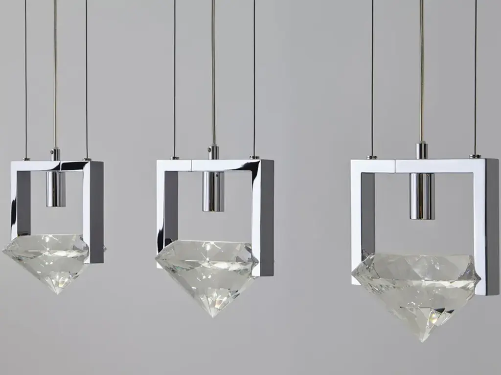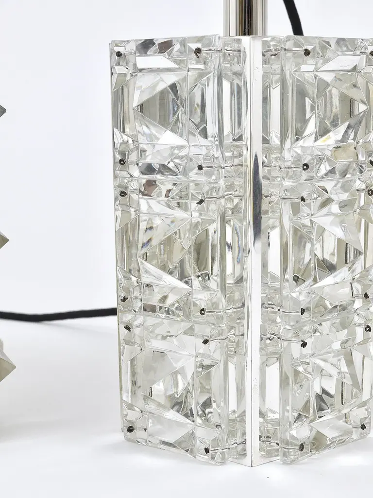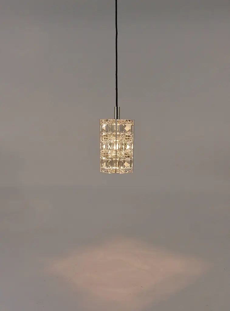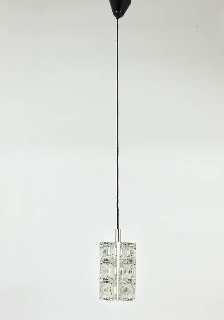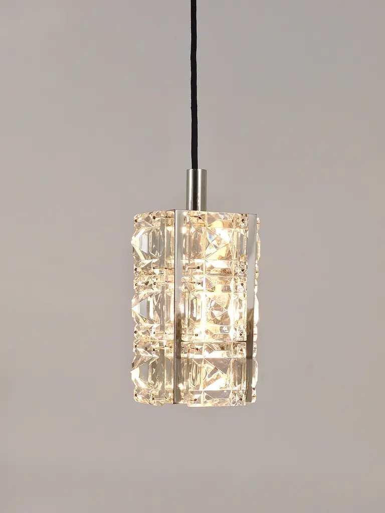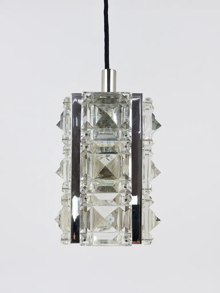 Up to three beautiful square pendant lights from the 1960s, executed by Bakalowits & Söhne in Austria. Square triangular-faceted glass crystals, mounted on a nickel-plated hardware, each lights has one light-source. Rewired on a black fabric cord. In very good condition, with marginal patina on the metal. Sold and priced per piece. Each lamp measures 5 x 5 in and is 9 in high, the wire is 78" long and can be shortened easily.