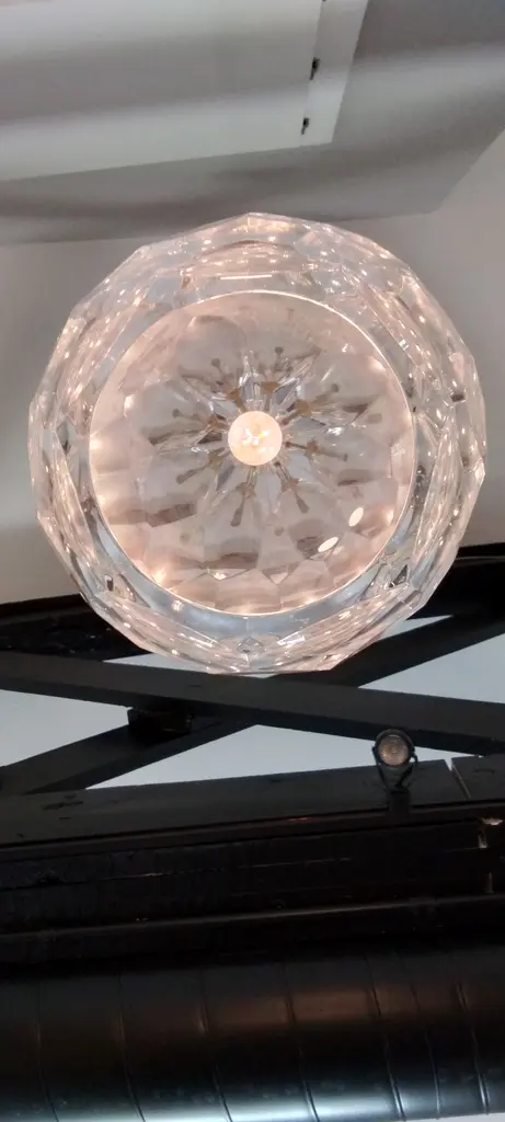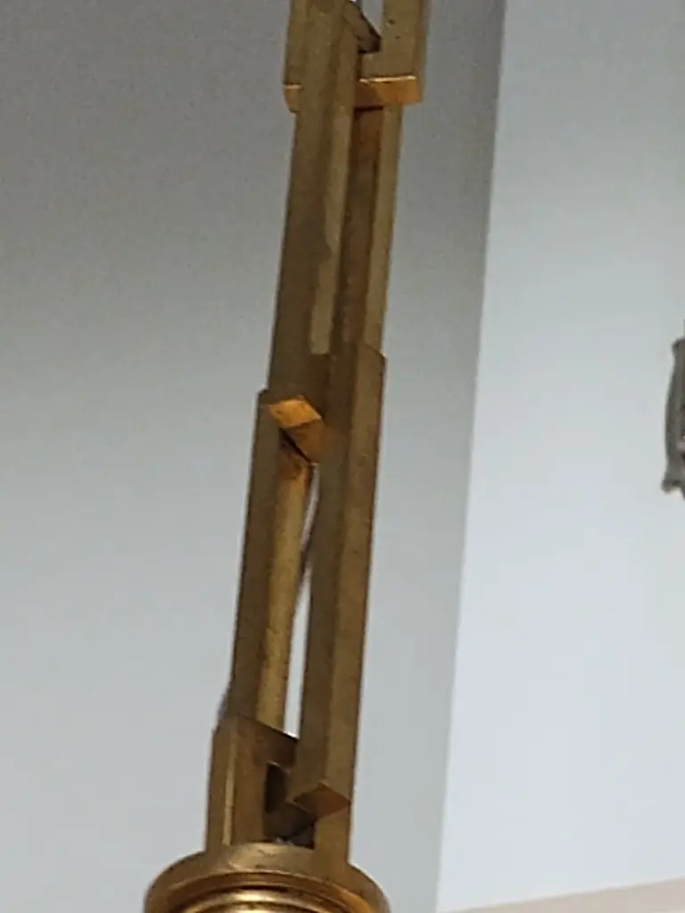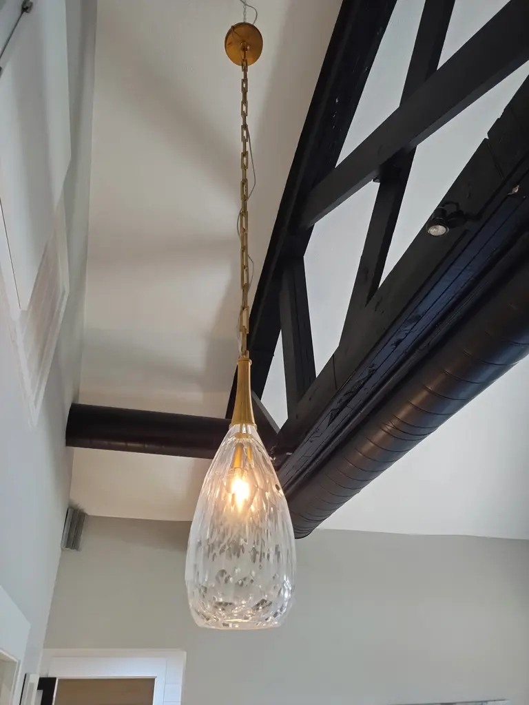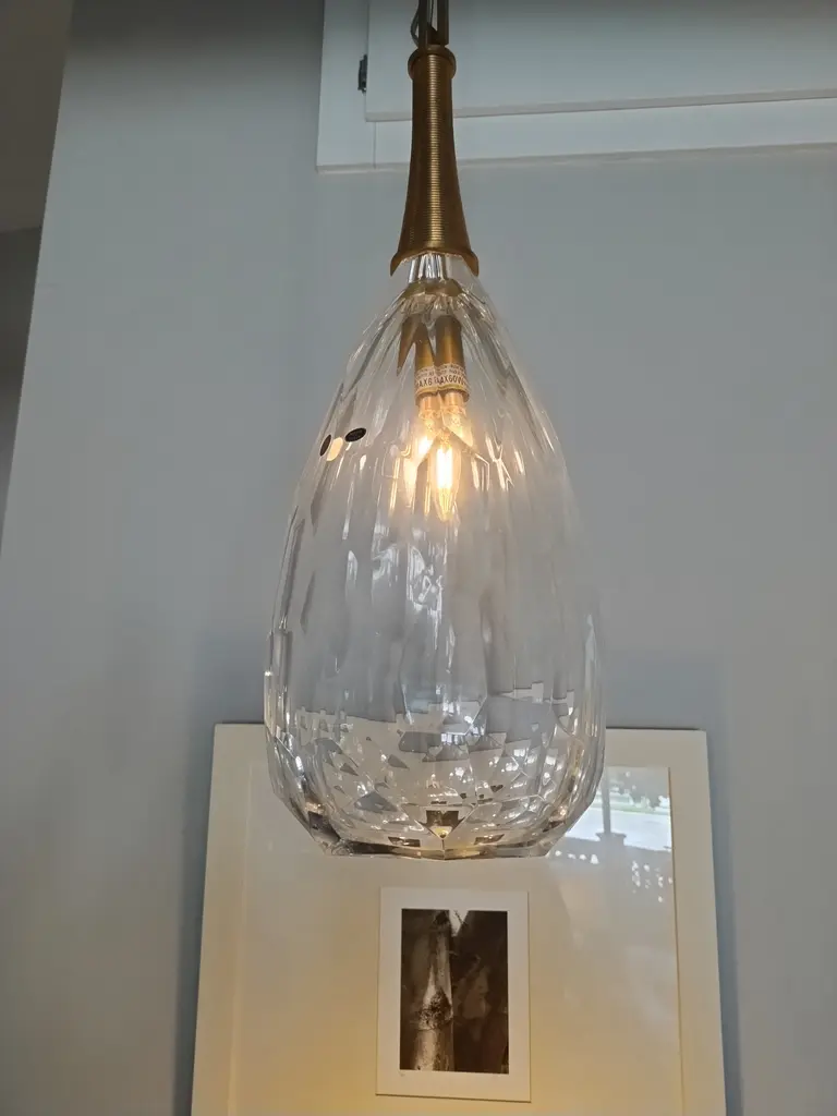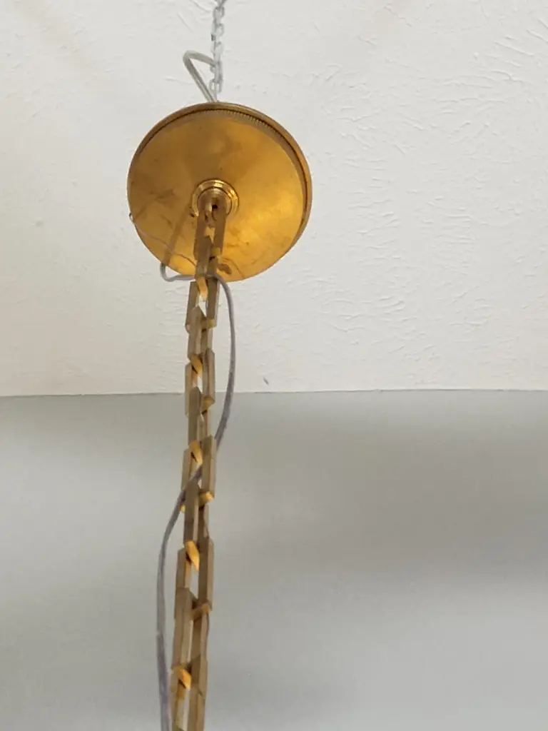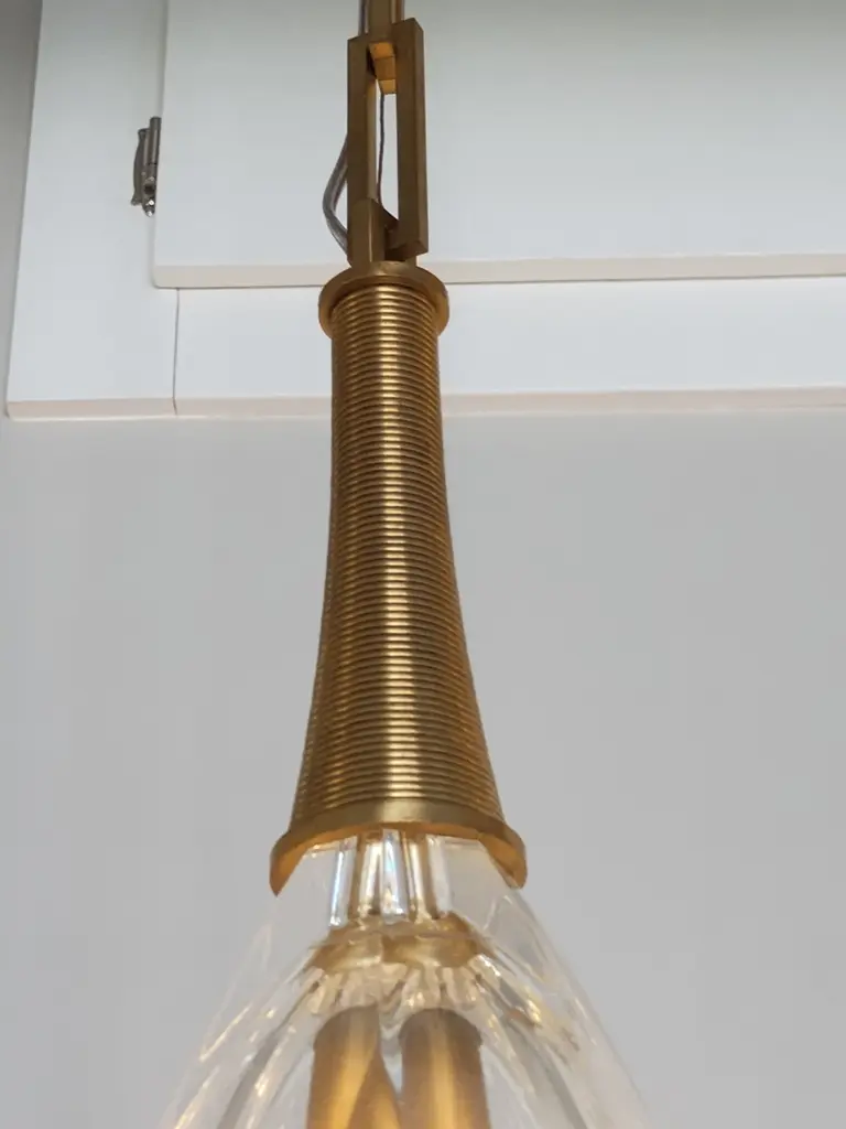 Baker's Amanda Pendant from The Thomas Pheasant Collection. This single light pendant is made of premium materials including cast Bright Bronze and cut crystal. Made in Italy, the pendant is ceiling mount suspended by a long interlocking chain in bright bronze. The individual cast chain links can be removed to adjust the overall 71" height of the pendant if required. Each individual chain link is machined and secured with an inset bronze screw that is removable for pendant height adjustment (again, if required). The piece takes 1 clear candelabra bulb (max 60W) which sits inside the 14" high faceted cut crystal shade. The light, when illuminated, casts multi-faceted light rays throughout the surrounding room creating a dynamic lighting effect. The design of the shade features a 7" high cast bronze tapered ribbed stem that connects the crystal shade to the suspension chain. The interlocking suspension chain meets at the top to a cast bright bronze ceiling plate which has a smooth horizontal surface and a ribbed side surface. This is truly a unique piece that would work well above a dining table, centered in a living room, den, family room, entry foyer or master bedroom. The piece is in pristine, 1st quality, new condition (albeit no longer made) and has had no previous owner.