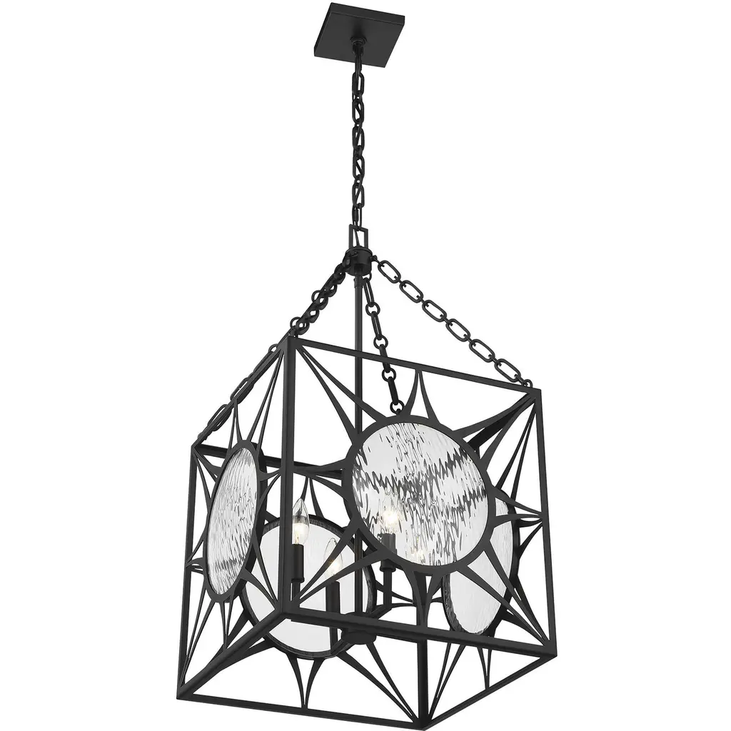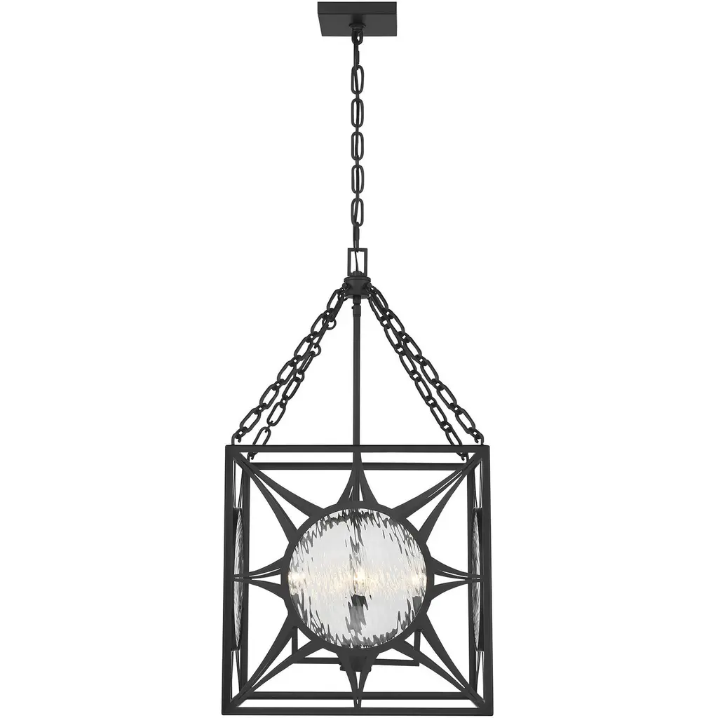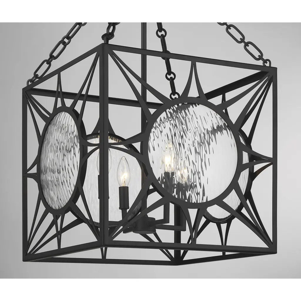 Let your sense of style shine through with the beautiful Balfour 4-light foyer light from Savoy House Its cube-shaped structure wears a Matte Black finish and is decorated with eye-catching starburst patterns that hold circular panes of clear water glass. Balfour is 29.5" in height and 17" in width. It uses four candelabra size bulbs of up to 60 watts per bulb. Bulbs not included. Comes with 120" of chain.