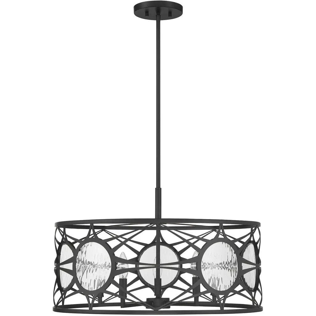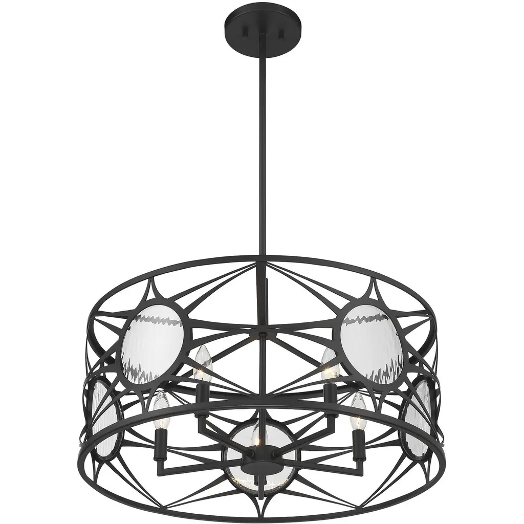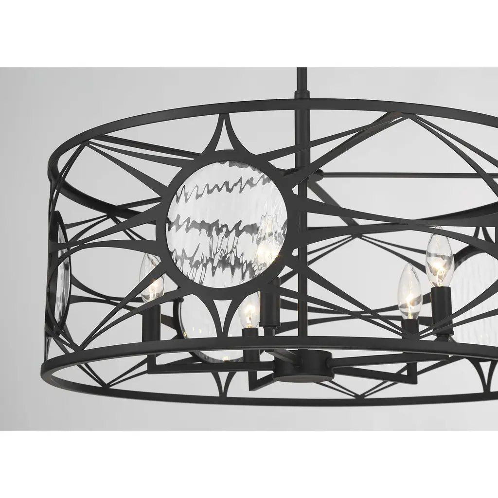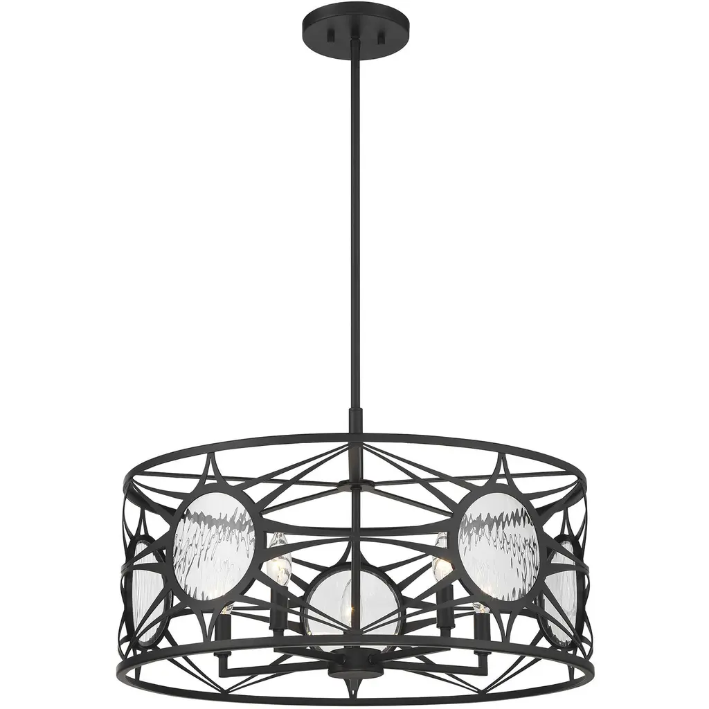 Let your sense of style shine through with the beautiful Balfour 5-light pendant from Savoy House Its drum-shaped structure wears a Matte Black finish and is decorated with eye-catching starburst patterns that hold circular panes of clear water glass. Balfour is 24" in width and has an adjustable height ranging from 14" to 68". It uses five candelabra size bulbs of up to 60 watts per bulb. Bulbs not included. Comes with four 12" downrods and one 6" downrod. Can be converted for use as a ceiling semi-flush mount light.