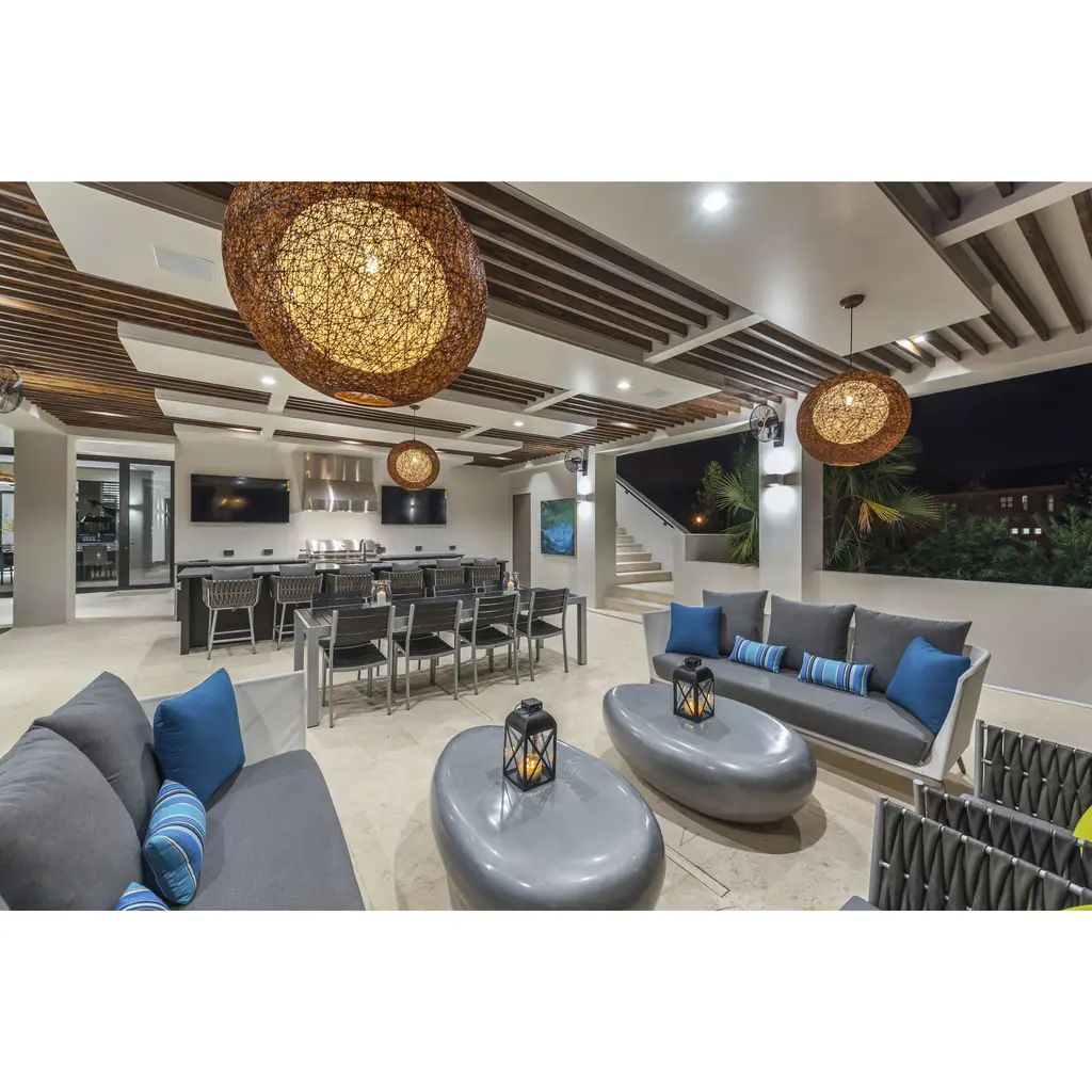 Spherical dual shades constructed of woven string in two tone finish combinations, Natural with White inner and Chocolate with White inner. Shades are treated for weather resistance and are U.L. approved for damp location which make them perfect for outdoor living spaces.