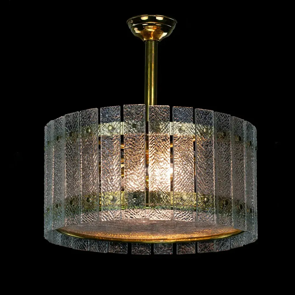 By fusing together herringbone style glass we have created a wonderfully sparkling clean crystal effect with these strips of fused glass on the brushed brass finish. 28 segments of Balik glass 220mm long held onto the brass hoops with clean headed screws.