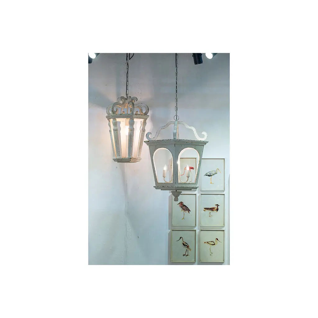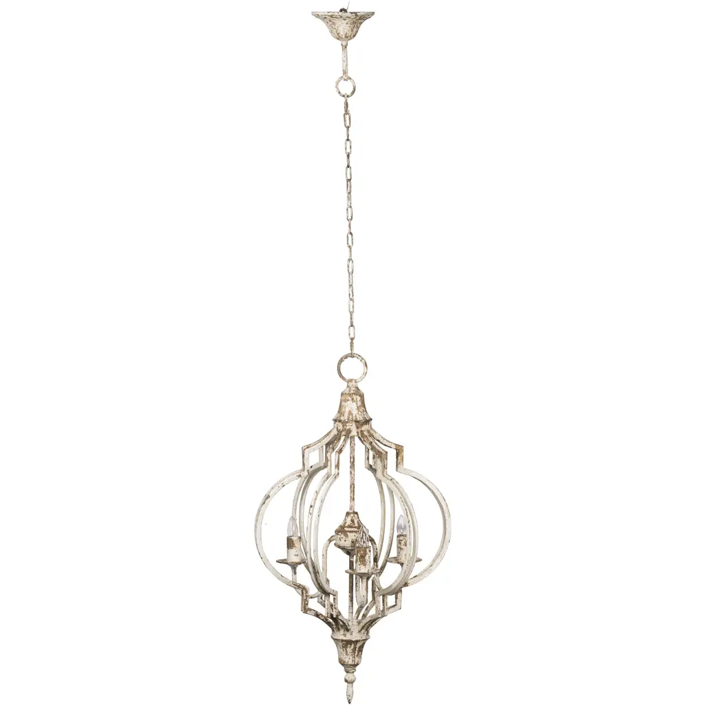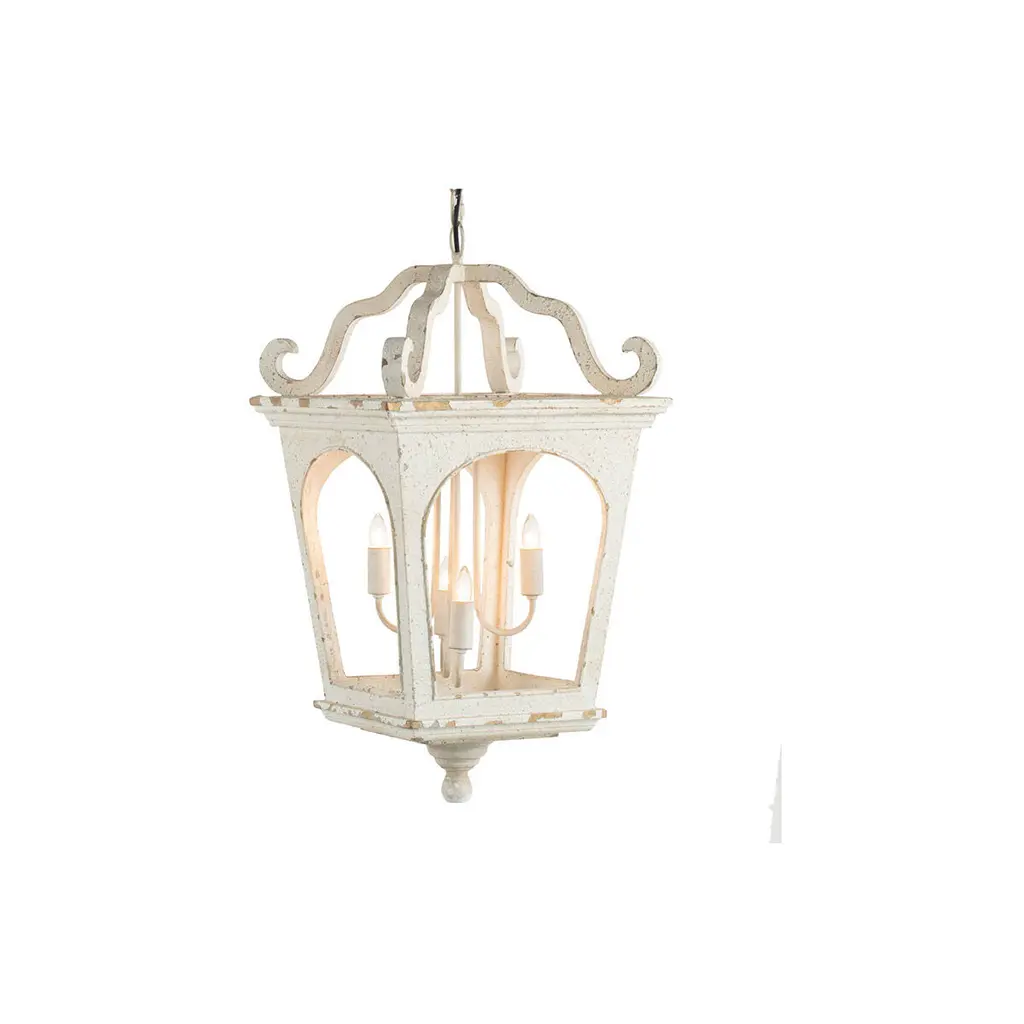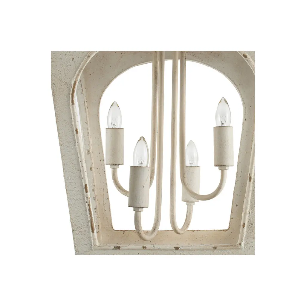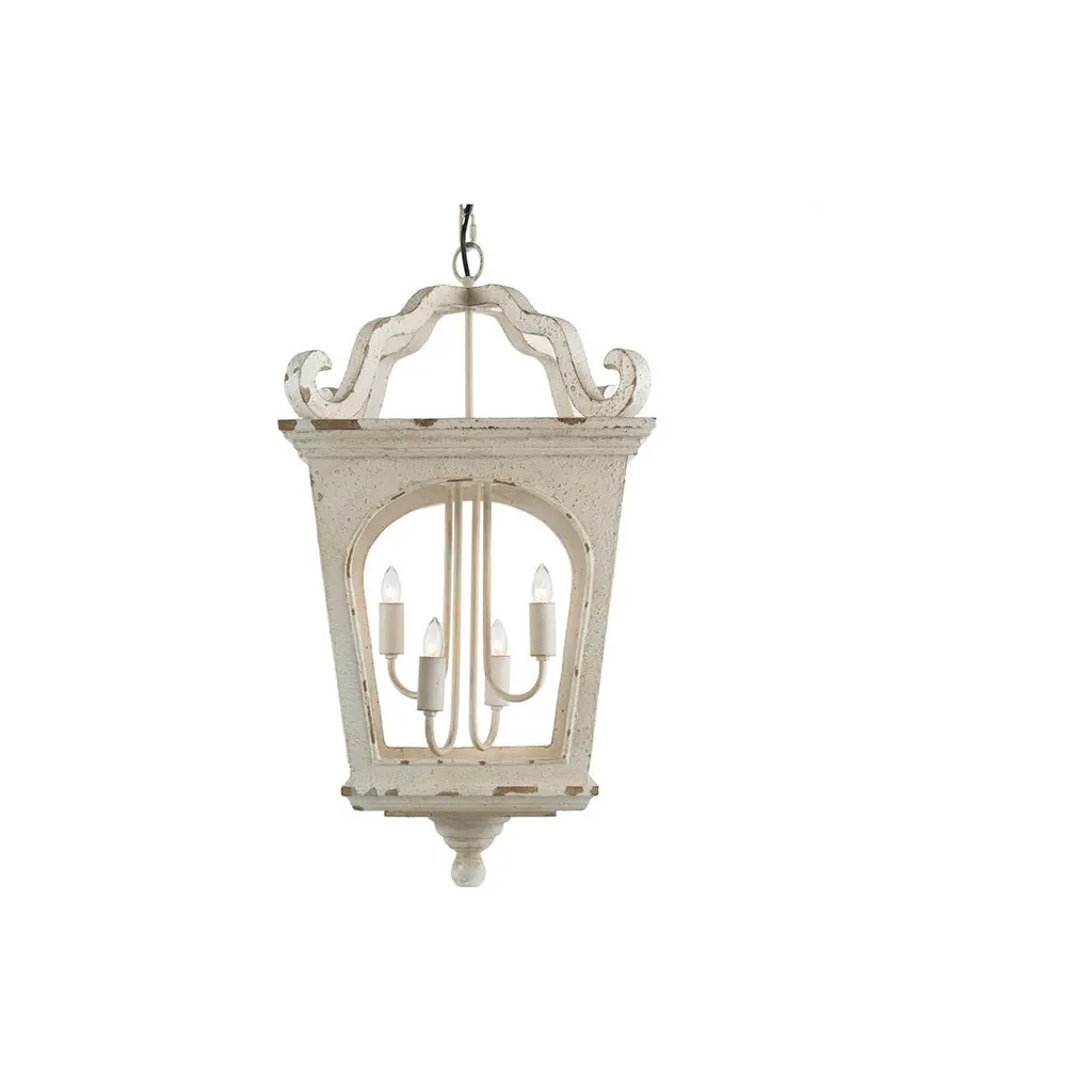 Inspired by the shape of traditional street lights, this piece from the Bellamy Collection evokes memories of bygone town squares and romantic nighttime walks. The frame is constructed from durable fir wood and finished in distressed white for rustic appeal. This accent chandelier takes four candelabra-style bulbs. Use to provide lovely mood lighting anywhere in the home.