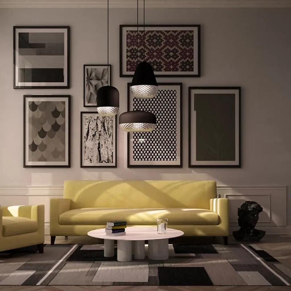 The Balloton Pendant from MM Lampadari drops into one’s room as a beautiful organic form covered on one half with an artisanal pattern inspired by the Venetian technique for glass blowing. This dramatically contrasting piece underscores creator Matteo Zorzenoni’s study of the potential of materials. The pendant appears to float in the air with help from a fine cord suspension. Tapering below, a quiet metal shade pleases with a smooth surface and uniform color. The glass diffuser dazzles with a diamond-shaped pattern that beams with reflected color and light. Like traditional Venetian glass, the diffuser presents a radiant, comfortable glow.