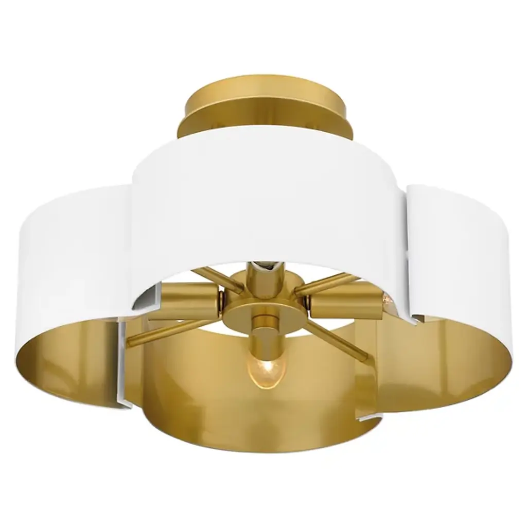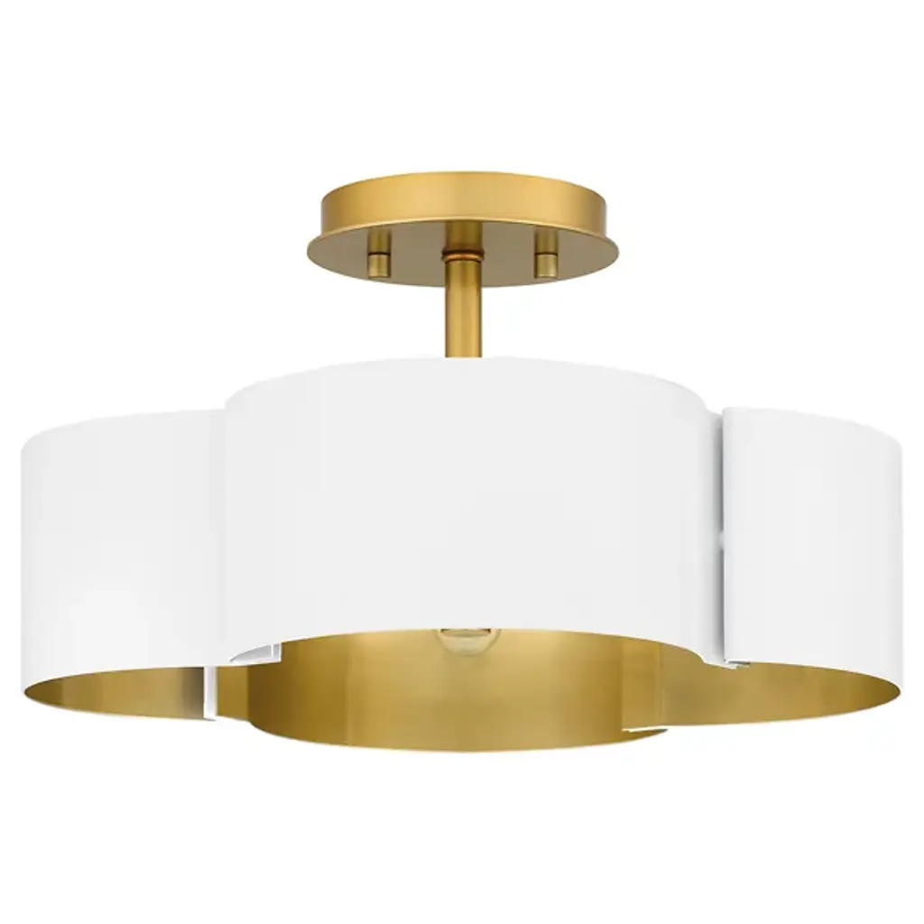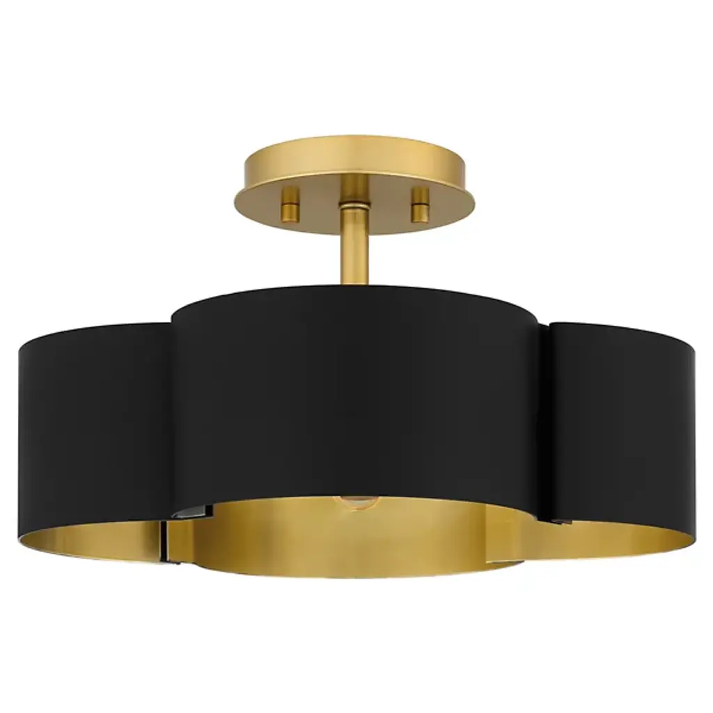 The Balsam Semi-Flushmount from Quoizel gives a nod to Parisian style with a riveting quatrefoil shape covered in bold, contrasting finishes. The simplicity of the piece, mixed with its ornamental quality adds a splash of style where needed. Low-sitting hardware adds to the piece’s durability across the home. The metal shade visually moves rhythmically in a series of curves that help block glare. The shade’s golden interior accentuates the outpouring light’s pleasant warmth.