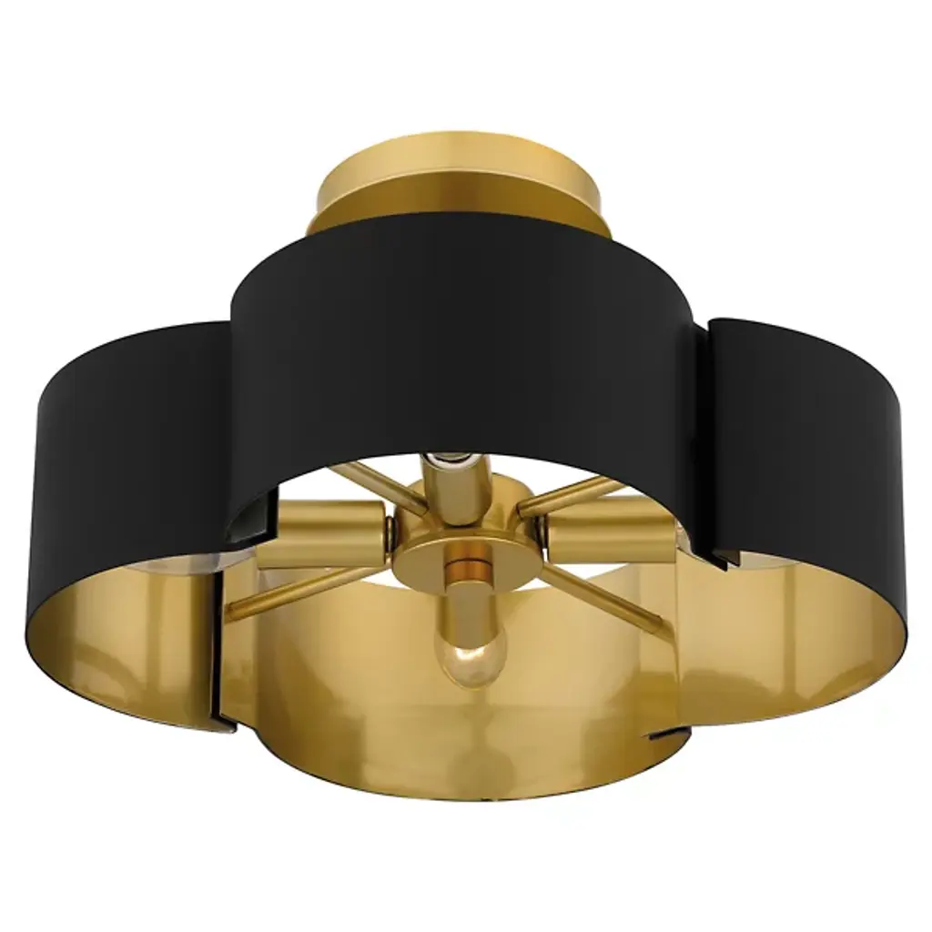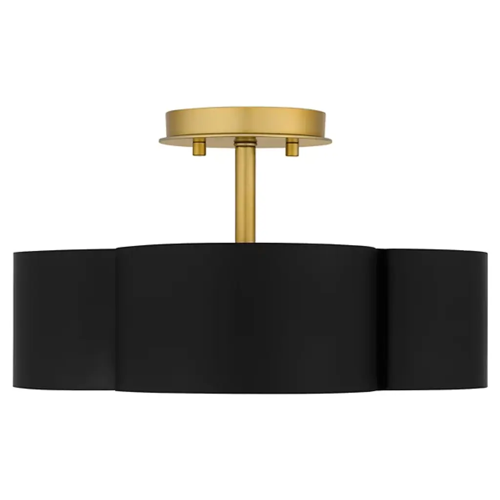 The Balsam Semi-Flushmount from Quoizel gives a nod to Parisian style with a riveting quatrefoil shape covered in bold, contrasting finishes. The simplicity of the piece, mixed with its ornamental quality adds a splash of style where needed. Low-sitting hardware adds to the piece’s durability across the home. The metal shade visually moves rhythmically in a series of curves that help block glare. The shade’s golden interior accentuates the outpouring light’s pleasant warmth.