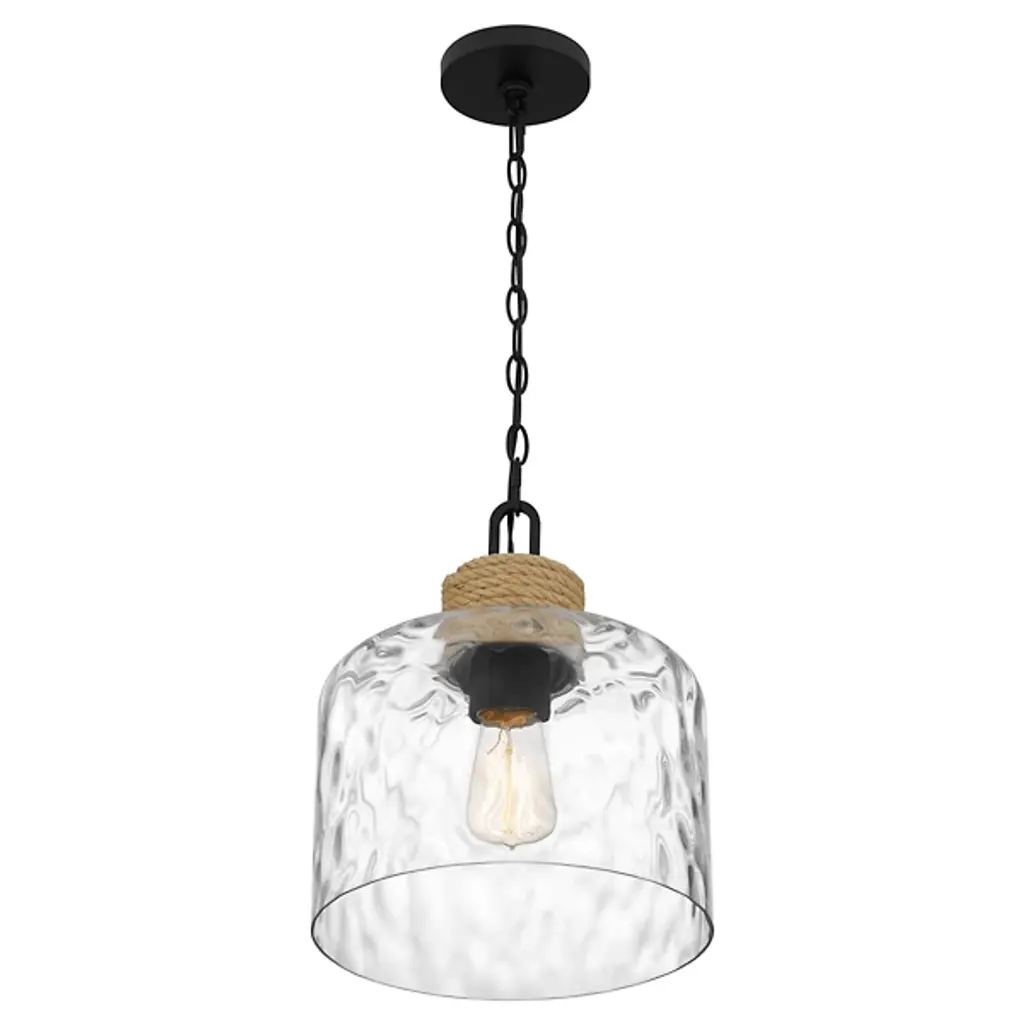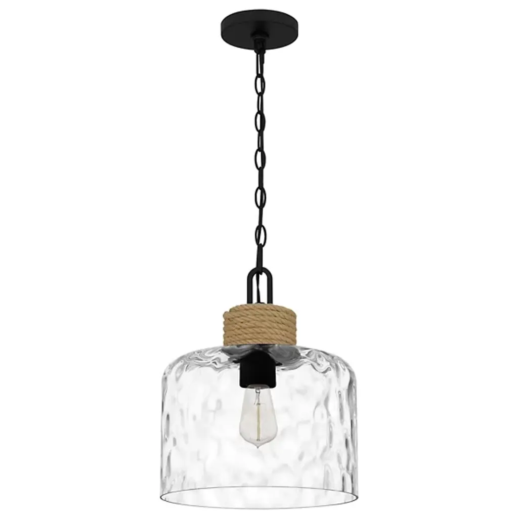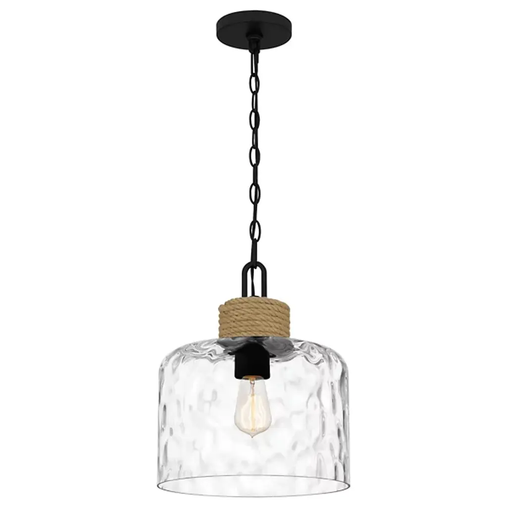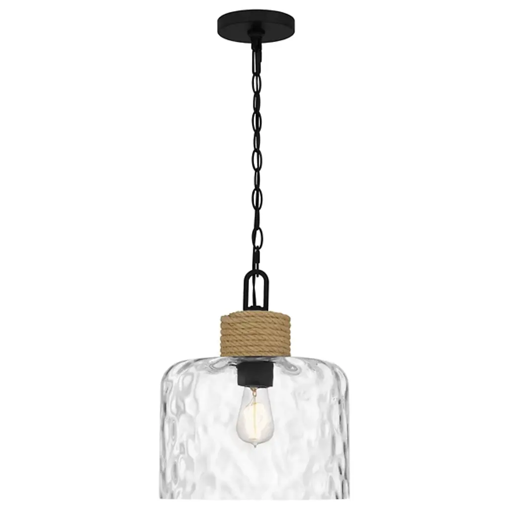 Give a nod to your room’s organic décor with the light-glazed, textured accents of the Baltic Pendant from Quoizel. The pendant gives a nod to nautical motifs, as its sea-inspired name suggests. It starts with a bold chain-link suspension that looks great on its own or in a series. The lamp holder below receives rope detailing that sets a warm tone. Clear water glass mesmerizes in silhouette. The textured shape presents a downlight that’s easy on glare.