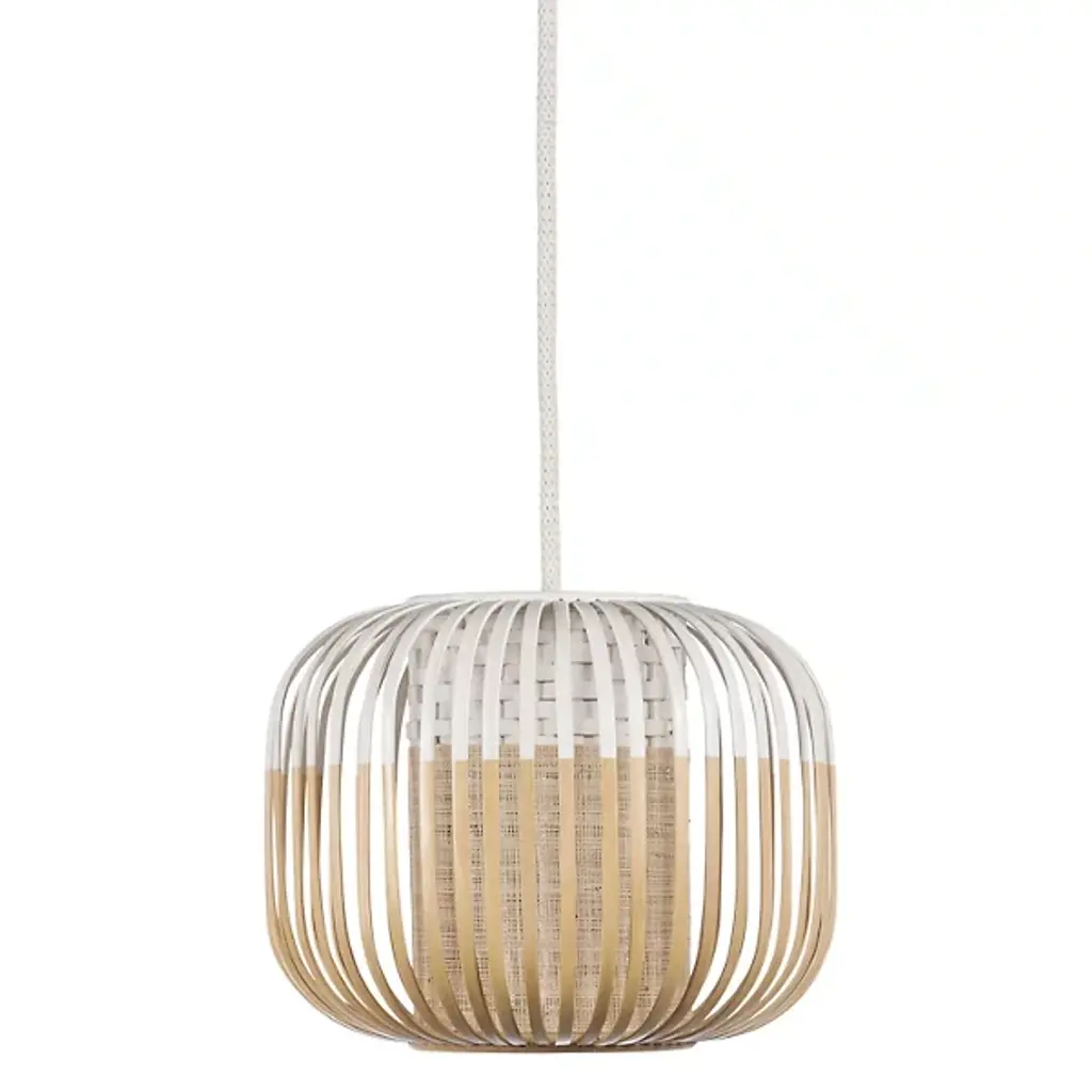 The Bamboo Pendant by Forestier is a fun and festive piece that brings handcrafted warmth to décor. Designed by Israeli artist Arik Levy, this fixture is constructed from slender bands of bamboo that are softly curved into a drum-shaped shade. Reminiscent of an outdoor lantern, the bamboo surrounds a cylindrical woven diffuser at its center. The outer shade is hand-painted at its upper end to add a pop of color, while its inner lamping permeates its bamboo cage to brighten a room with its soft glow.