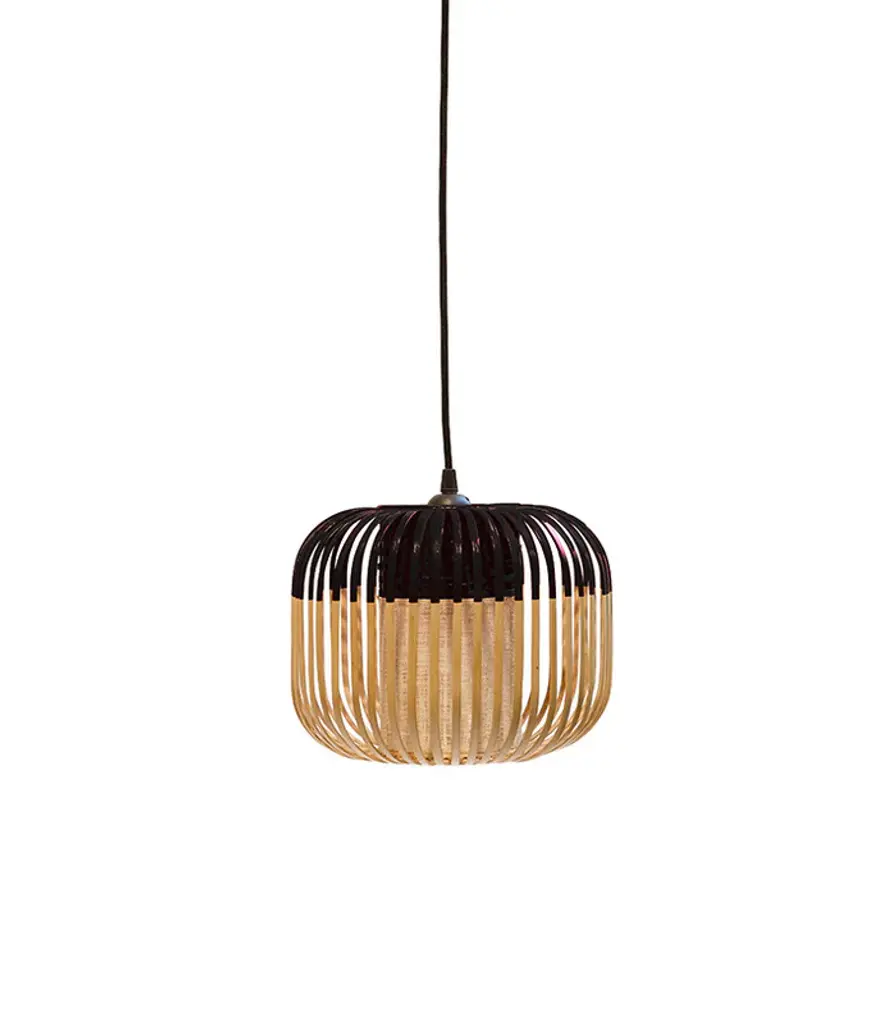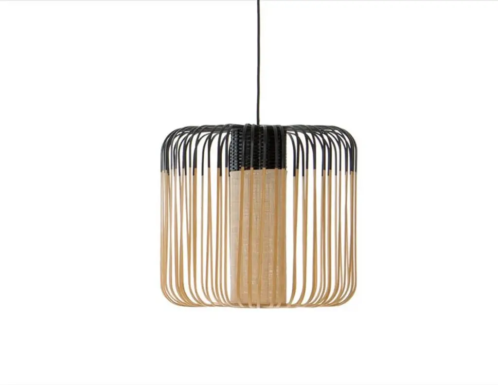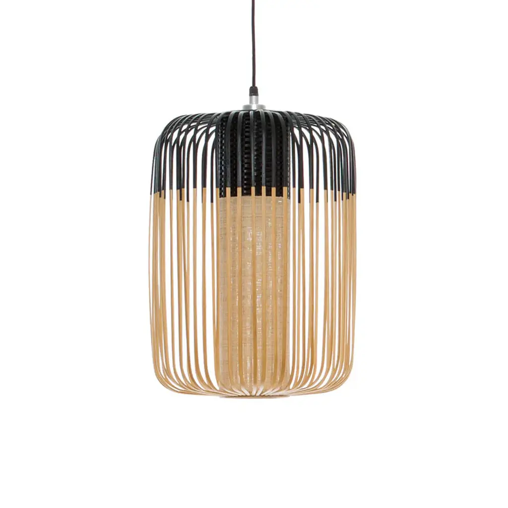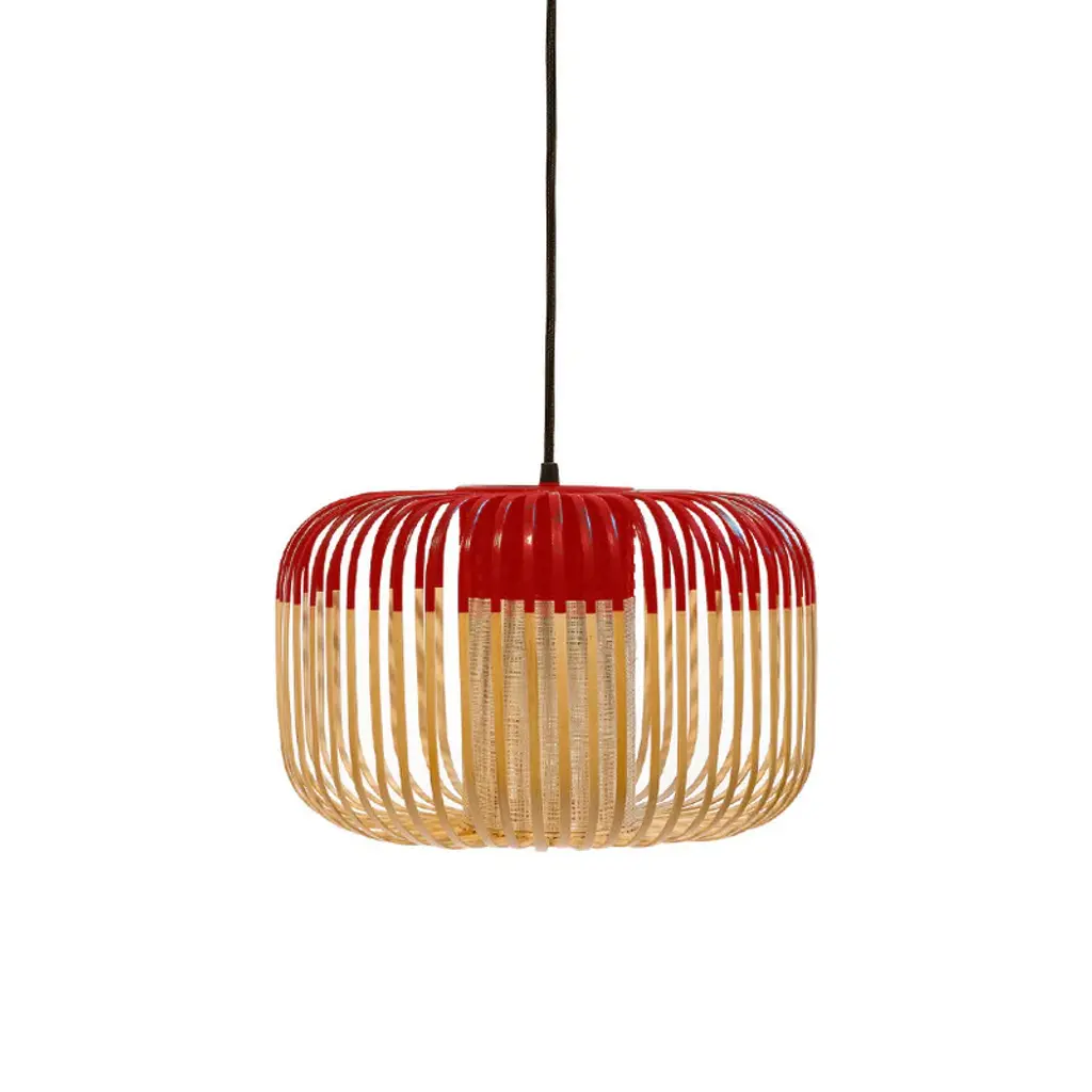 Designed by Arik Levy for Forestier, the Bamboo Pendant Light brings the festive feel of a picnic indoors with its natural lantern-like appeal. Surrounding a woven diffuser is a striated shade that creates textural shadows when lit. Capped in flourishes of Black, Green, Red or White, and available in a variety of sizes, this pendant light is a whimsical, yet well-structured lighting design perfect for bringing brightness to a kitchen island countertop, casual dining space, or as an unexpected design for a bedside lamp. Features