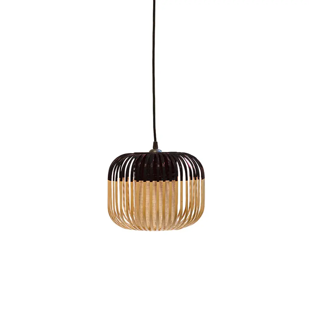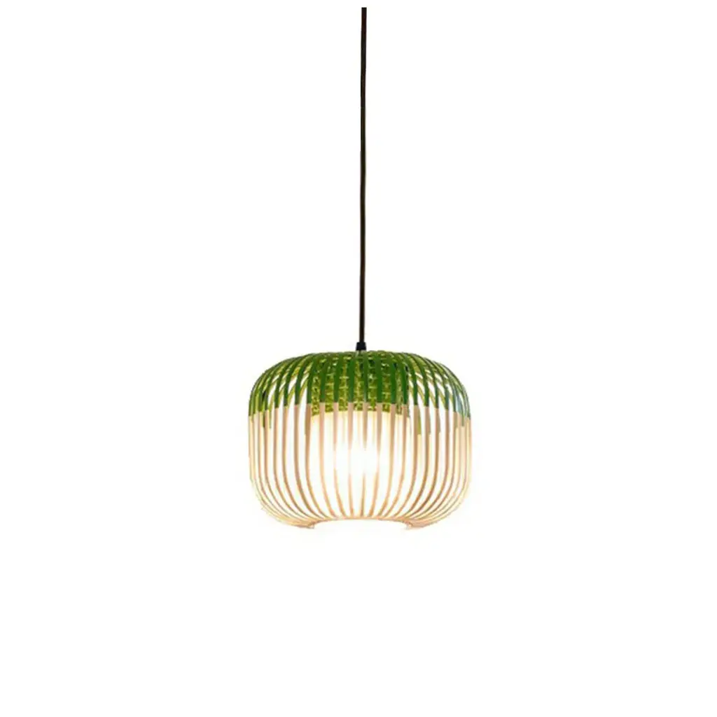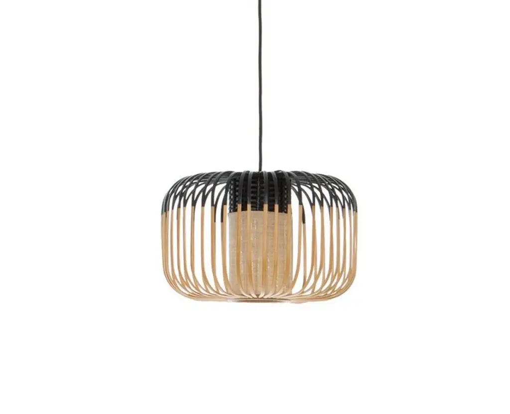 Designed by Arik Levy for Forestier, the Bamboo Pendant Light brings the festive feel of a picnic indoors with its natural lantern-like appeal. Surrounding a woven diffuser is a striated shade that creates textural shadows when lit. Capped in flourishes of Black, Green, Red or White, and available in a variety of sizes, this pendant light is a whimsical, yet well-structured lighting design perfect for bringing brightness to a kitchen island countertop, casual dining space, or as an unexpected design for a bedside lamp. Features