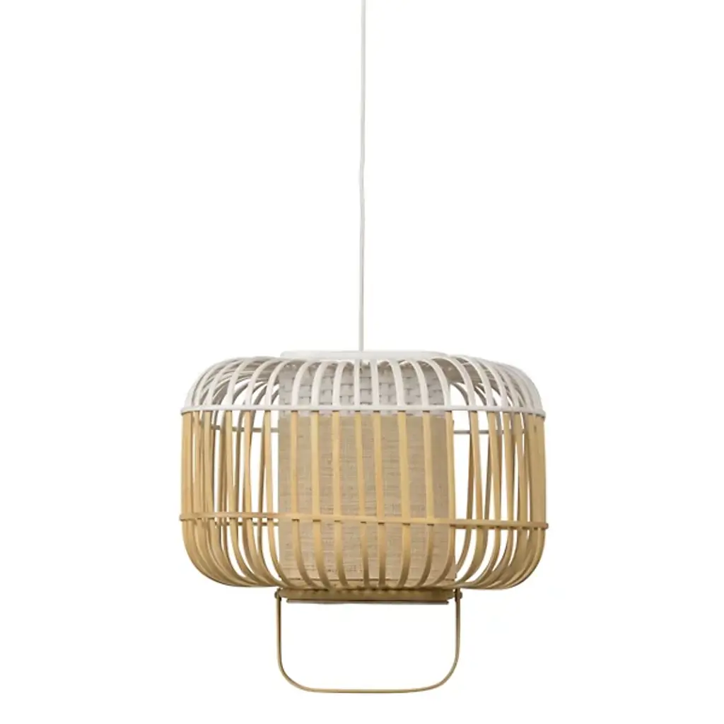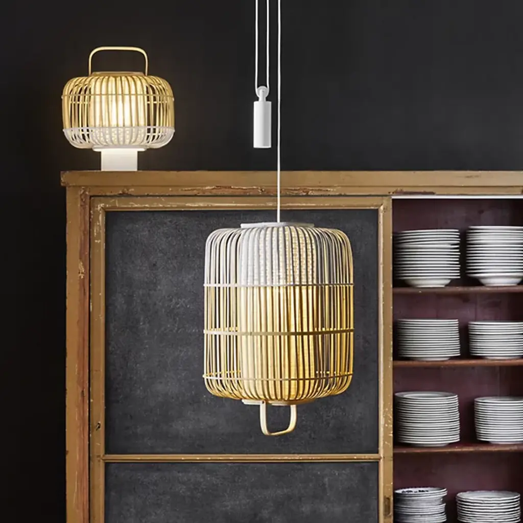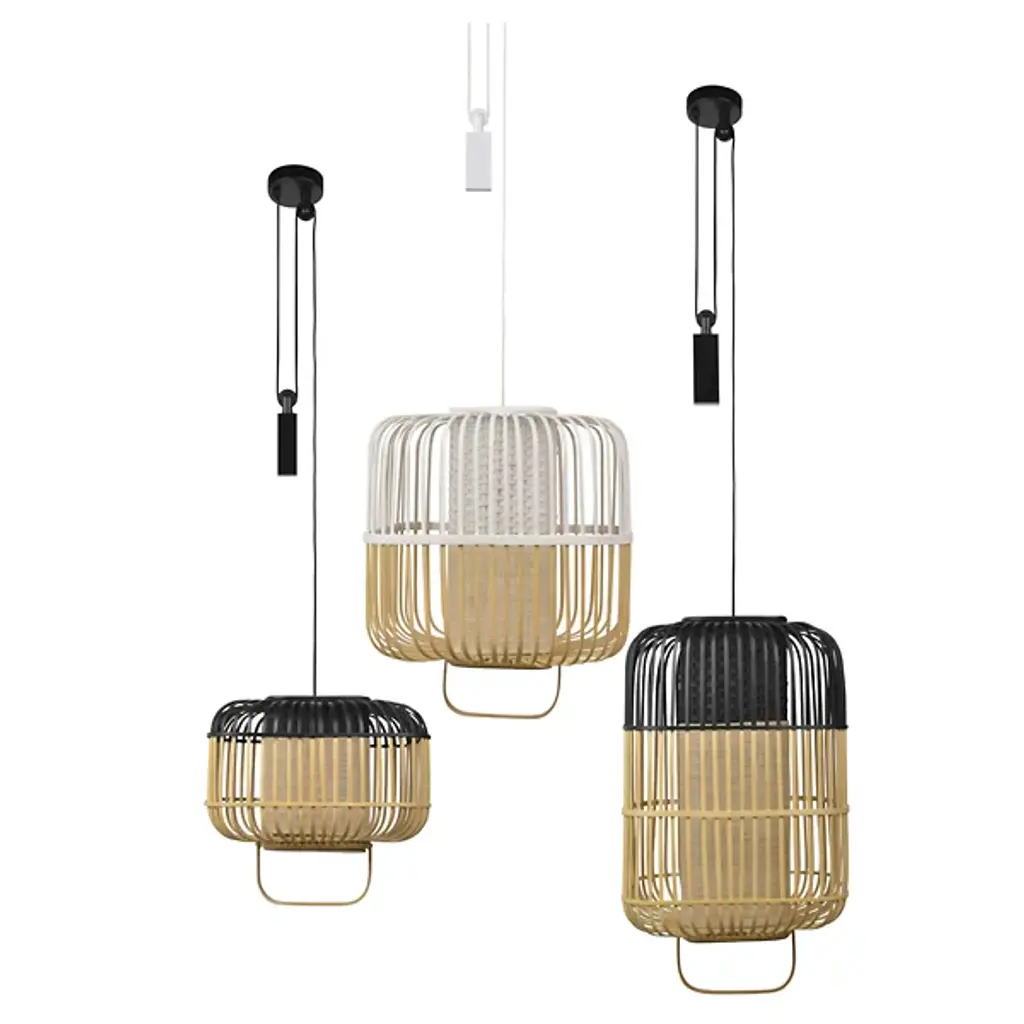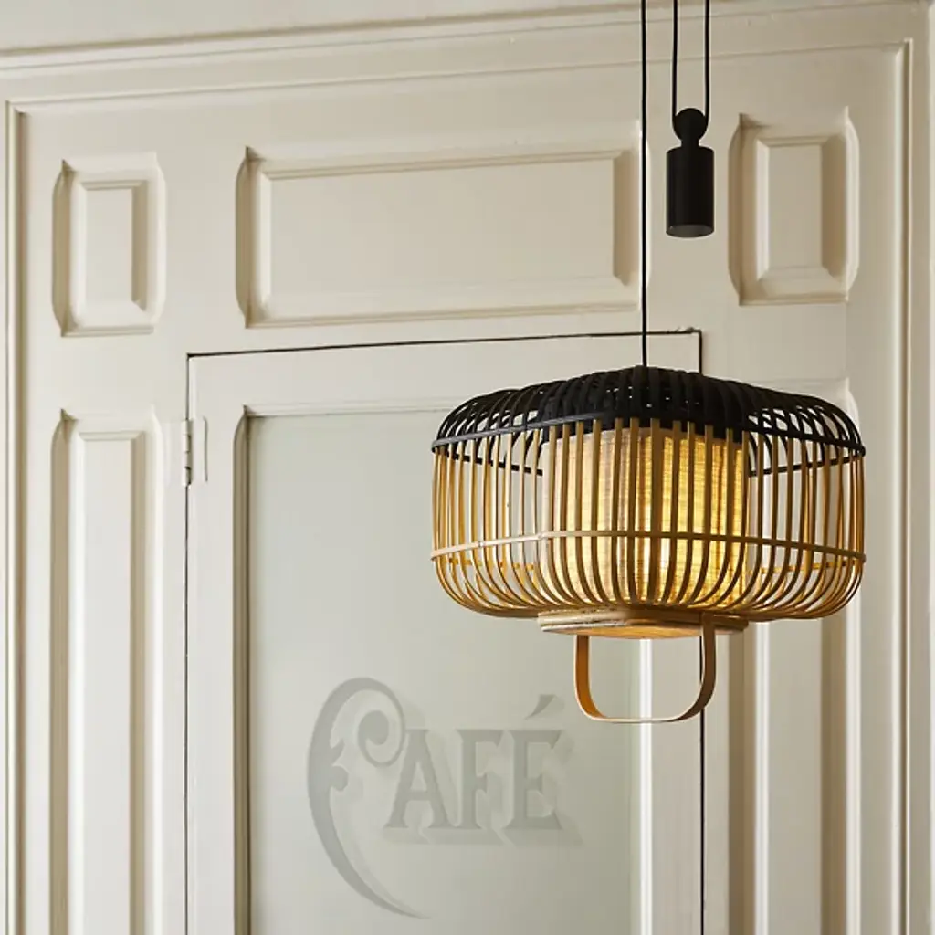 The Bamboo Square Pendant from Forestier evokes festive lantern lights while offering a functional lighting solution for any space. Designed by Arik Levy, its bamboo-crafted cage presents a gently curved cube silhouette, while hand-painted accenting tops the piece. A woven fabric diffuser is set inside, with a painted textural weave at its top. A slender handle allows the pendant to be pulled down as needed, while an elegantly designed counterweight keeps it in place.
