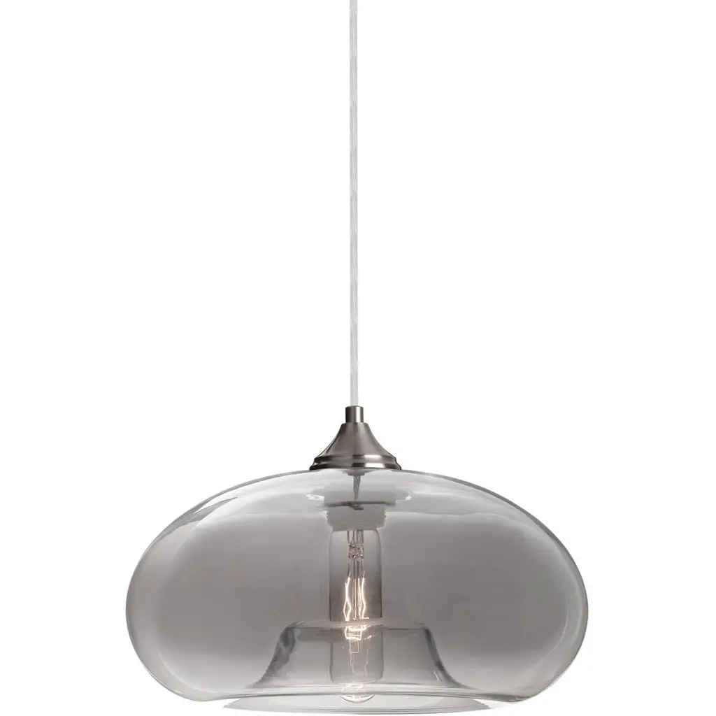 Our Bana is a modern and unique compact torus shape, with an interesting inverted open bottom, its retro styling will gracefully blend into today's environments. Our Smoke Trans glass is a colored semi-transparent glass. The seductive glow has a low key harmonious display that exudes a warm mood. When lit the glass is vitalizing as well as stylish. This handcrafted glass uses a process where every glass is consistently produced using a press mold, keeping variations to a minimum. The cord pendant fixture is equipped with a 10' SVT cordset and an low profile flat monopoint canopy. These stylish and functional luminaries are offered in a beautiful brushed Bronze finish.