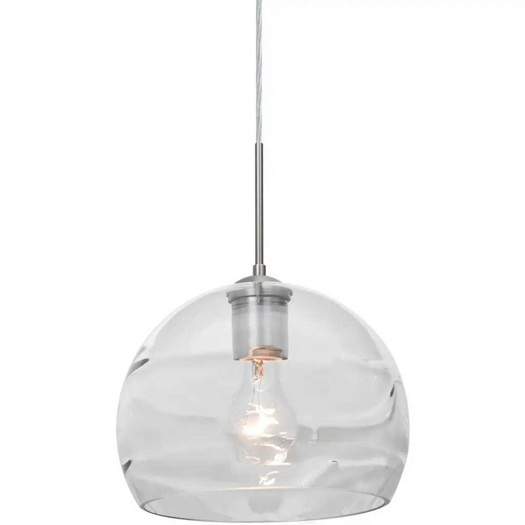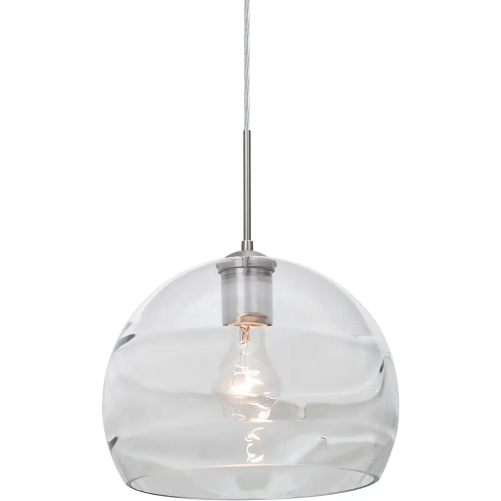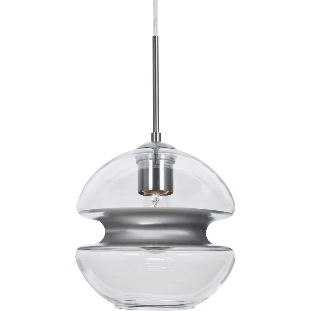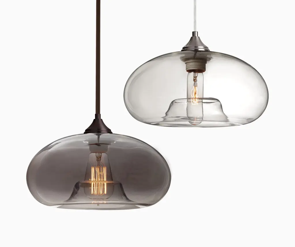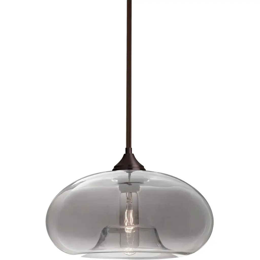 Our Bana is a modern and unique compact torus shape, with an interesting inverted open bottom, its retro styling will gracefully blend into today's environments. Our Smoke Trans glass is a colored semi-transparent glass. The seductive glow has a low key harmonious display that exudes a warm mood. When lit the glass is vitalizing as well as stylish. This handcrafted glass uses a process where every glass is consistently produced using a press mold, keeping variations to a minimum. The cord pendant fixture is equipped with a 10' SVT cordset and an low profile flat monopoint canopy. These stylish and functional luminaries are offered in a beautiful Satin Nickel finish.