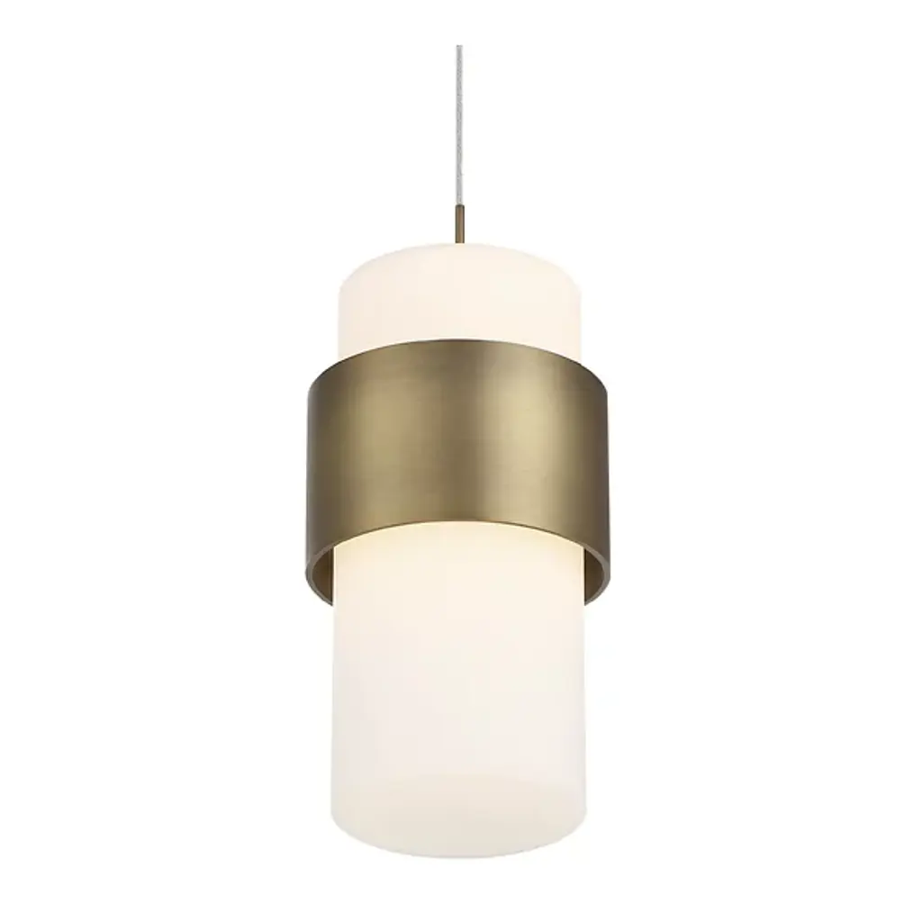 Perfect for the minimalist, traditional, and contemporary décor styles, the Banded LED Mini Pendant from dweLED combines form and function. Made of a frosted etched white acrylic diffuser that houses a 20W LED module, this pendant provides powerful task lighting in spaces like kitchens, dining rooms, and offices. Also, damp rated, this fixture can be used locations regularly exposed to moisture. Each unit ships with adjustable suspension cables and finishes include aged brass, black, and brushed nickel.