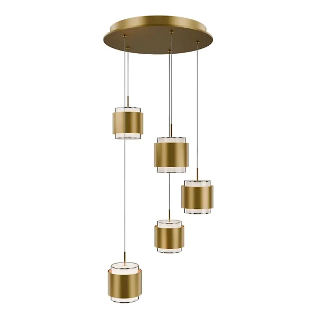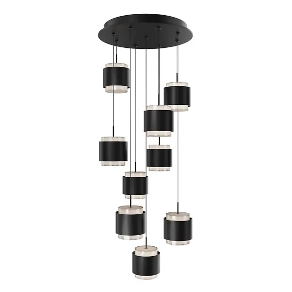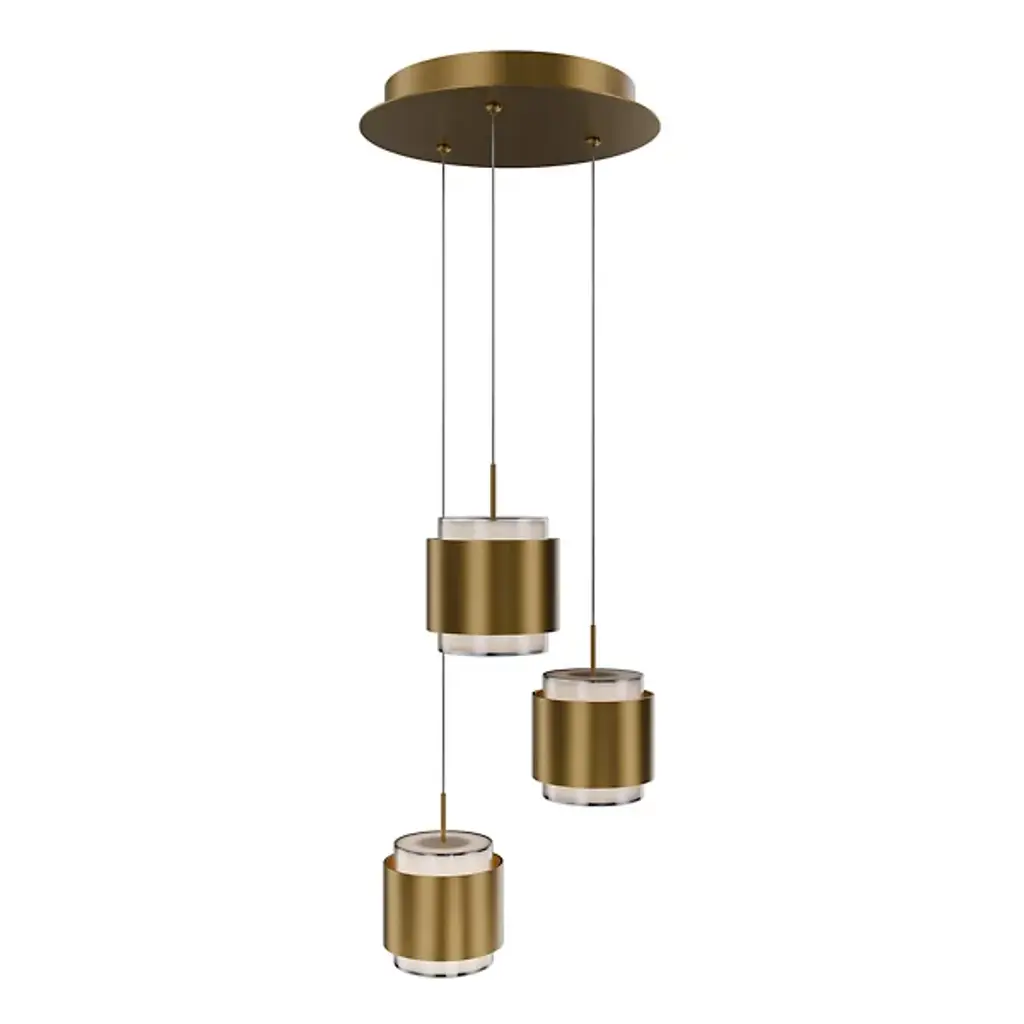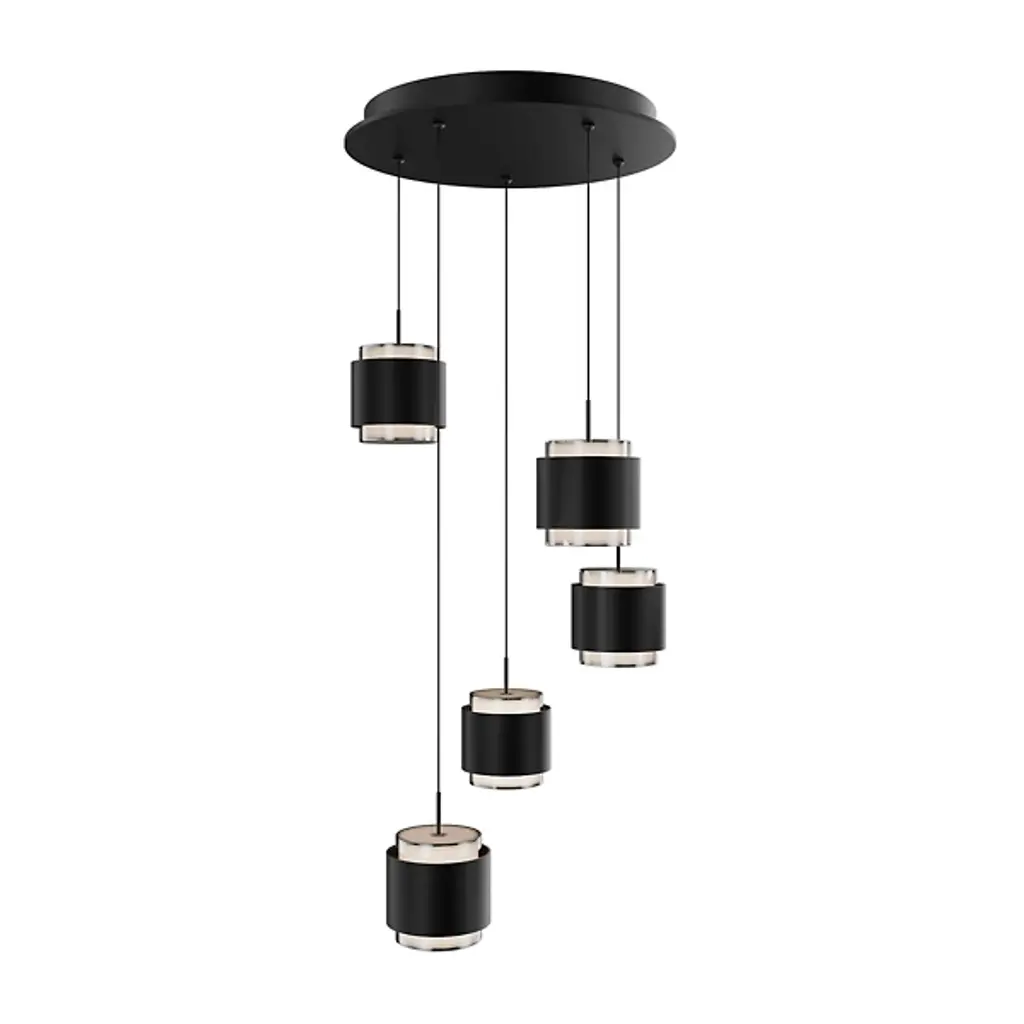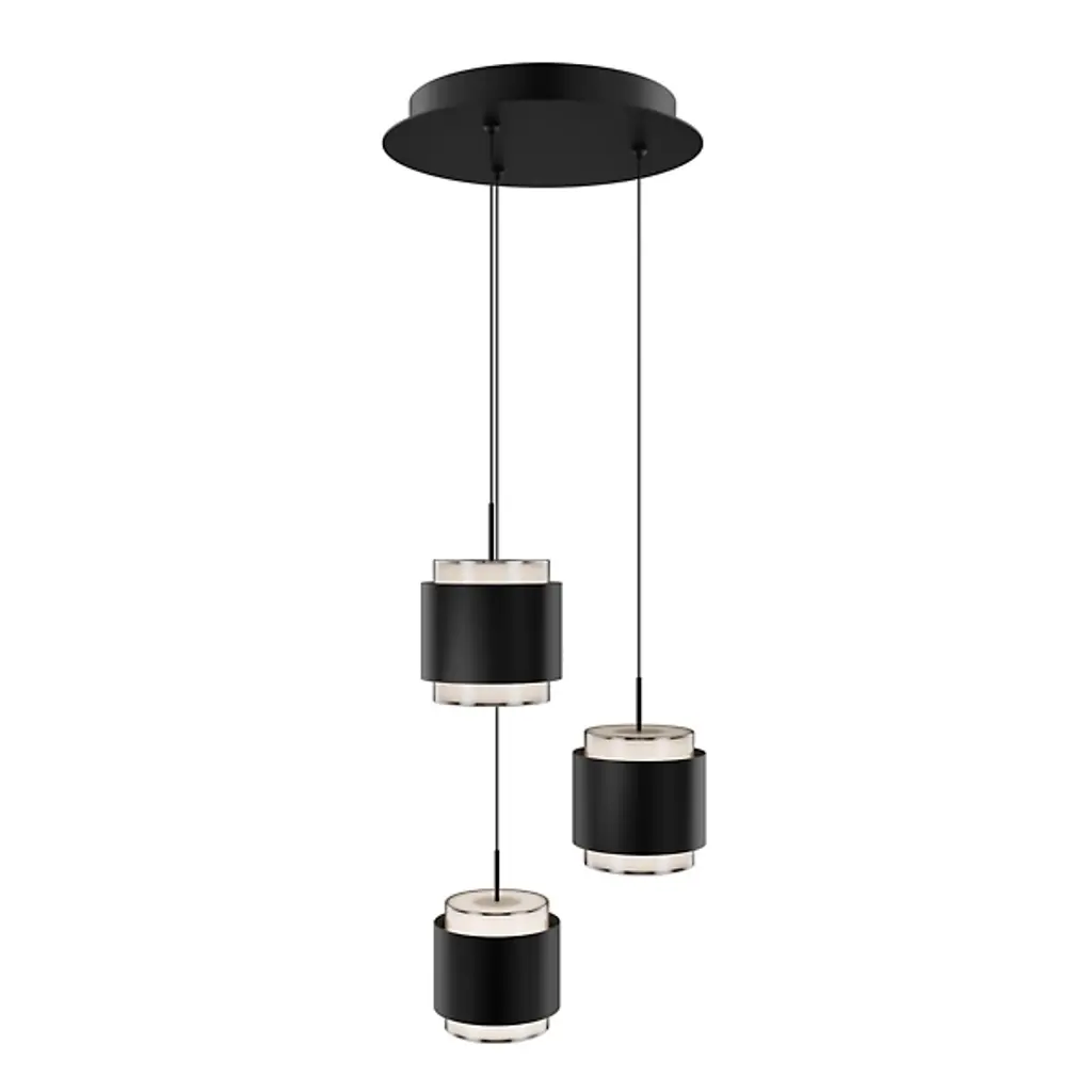 The Banded LED Multi-Light Pendant from dweLED clusters cylindrical forms beneath a round canopy to create depth through repetition. Each pendant features a metallic band surrounding a white diffuser, with light escaping from the exposed top and bottom edges. The round canopy organizes the arrangement while housing the concealed driver, and electrified cables integrate power into the suspension system. Aluminum construction supports each pendant, which can be adjusted independently using push pin connectors. The composition gains dimension as the identical cylinders hang at varying heights throughout the installation.