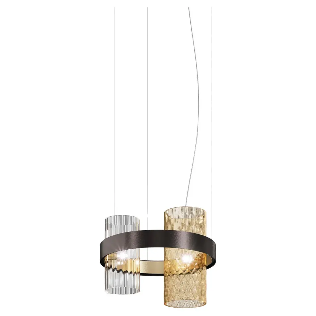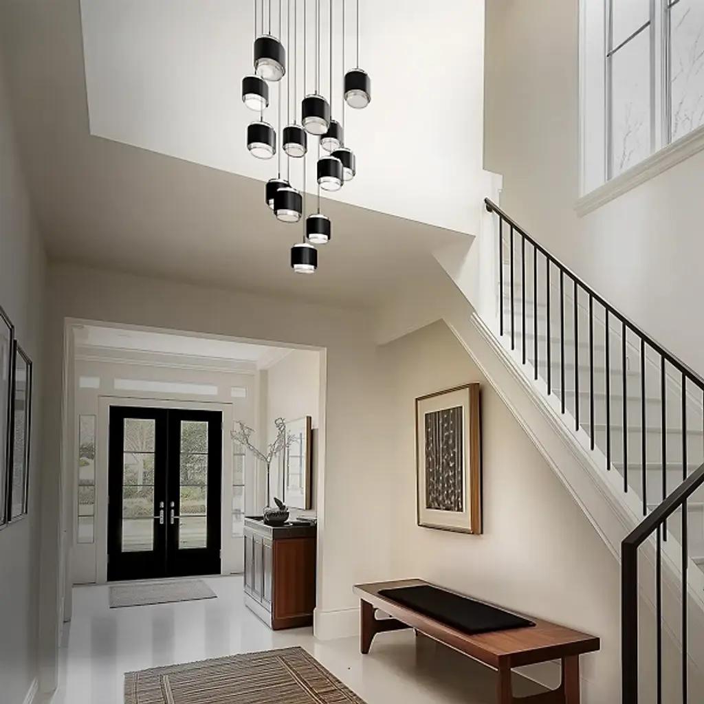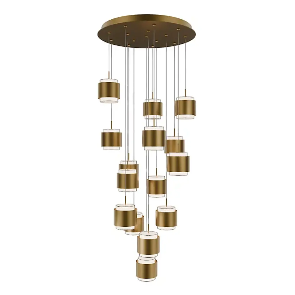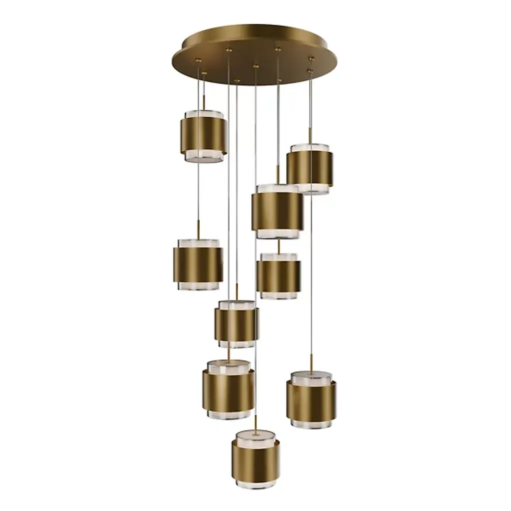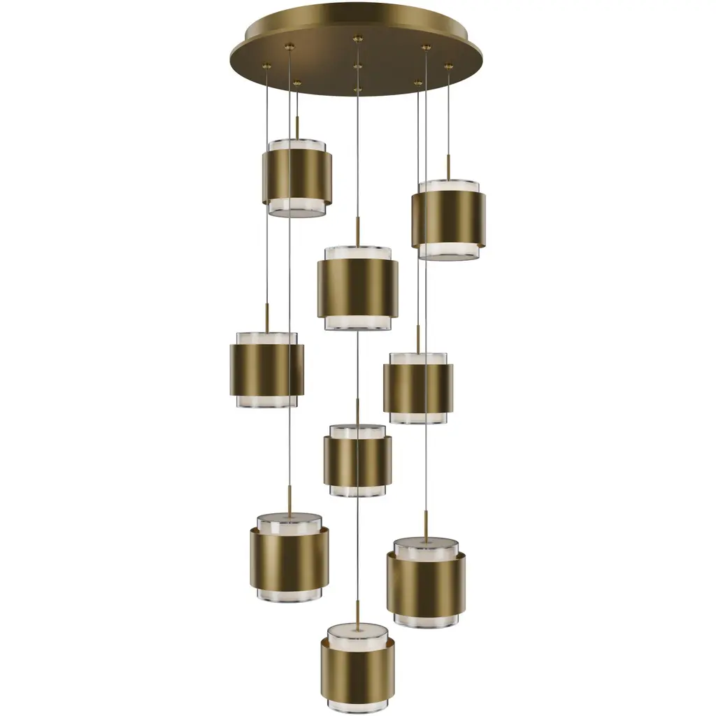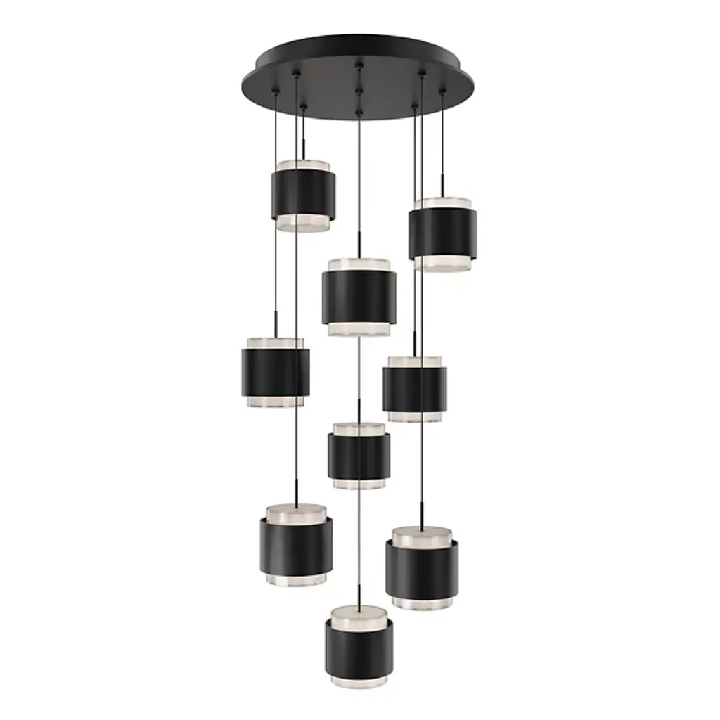 The Banded LED Multi-Light Pendant from dweLED clusters cylindrical forms beneath a round canopy to create depth through repetition. Each pendant features a metallic band surrounding a white diffuser, with light escaping from the exposed top and bottom edges. The round canopy organizes the arrangement while housing the concealed driver, and electrified cables integrate power into the suspension system. Aluminum construction supports each pendant, which can be adjusted independently using push pin connectors. The composition gains dimension as the identical cylinders hang at varying heights throughout the installation.