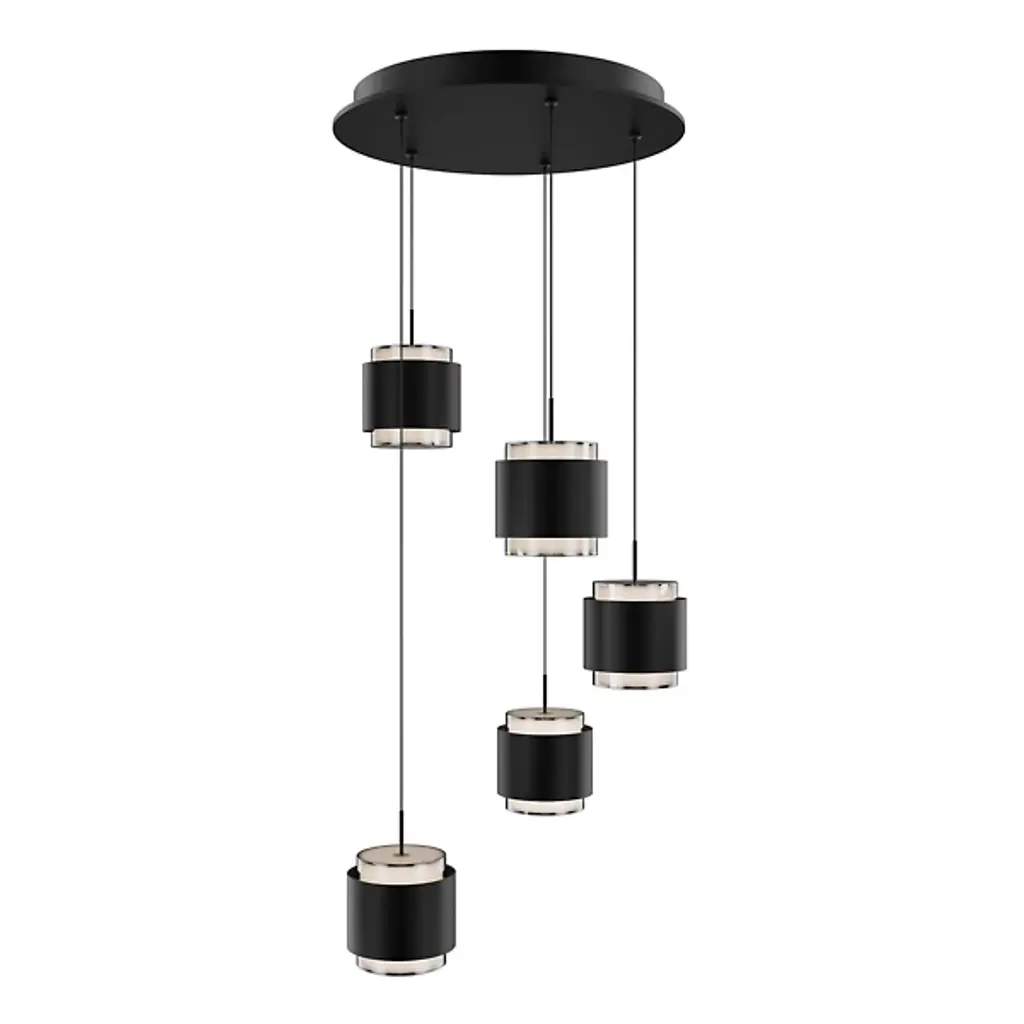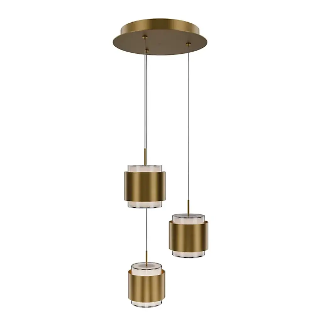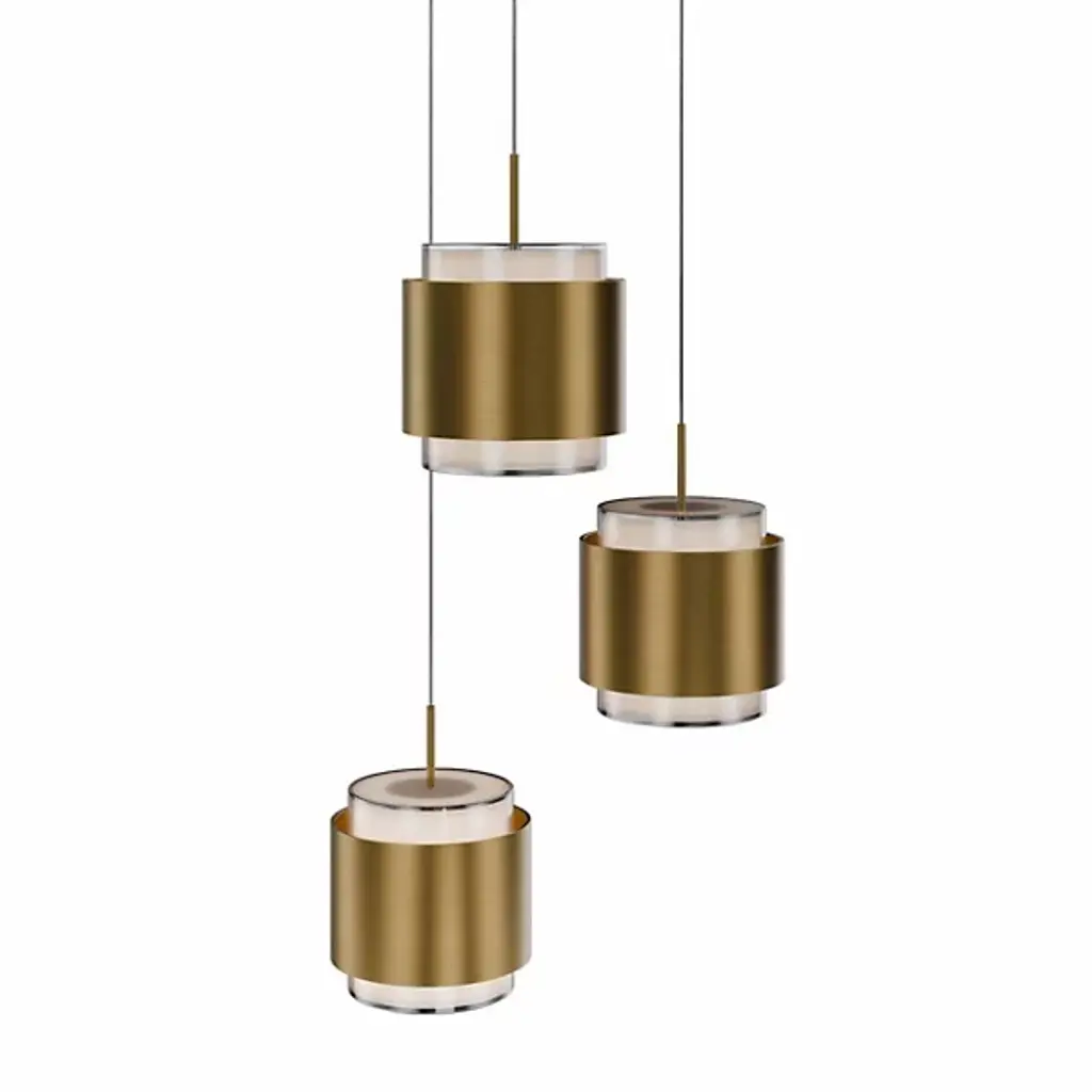 The Banded LED Multi-Light Pendant from dweLED clusters cylindrical forms beneath a round canopy to create depth through repetition. Each pendant features a metallic band surrounding a white diffuser, with light escaping from the exposed top and bottom edges. The round canopy organizes the arrangement while housing the concealed driver, and electrified cables integrate power into the suspension system. Aluminum construction supports each pendant, which can be adjusted independently using push pin connectors. The composition gains dimension as the identical cylinders hang at varying heights throughout the installation.