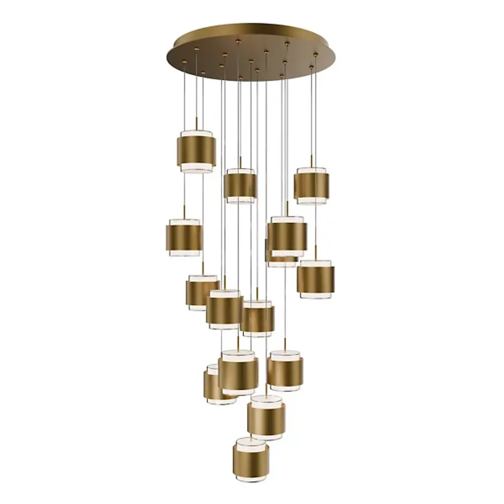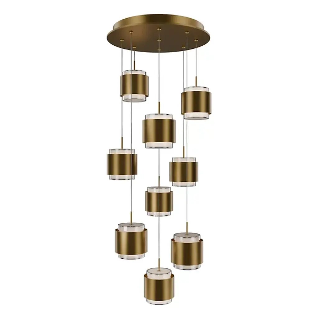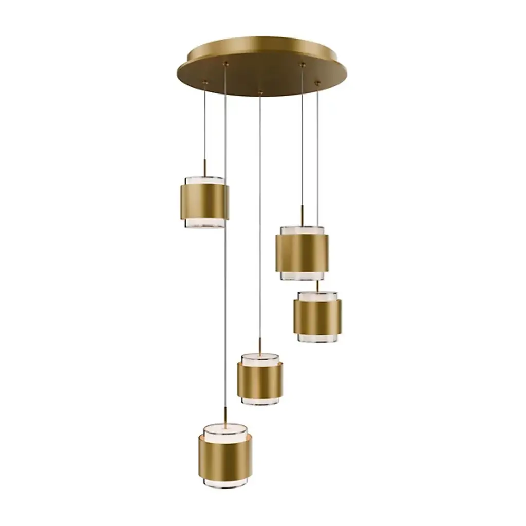 The Banded LED Multi-Light Pendant from dweLED clusters cylindrical forms beneath a round canopy to create depth through repetition. Each pendant features a metallic band surrounding a white diffuser, with light escaping from the exposed top and bottom edges. The round canopy organizes the arrangement while housing the concealed driver, and electrified cables integrate power into the suspension system. Aluminum construction supports each pendant, which can be adjusted independently using push pin connectors. The composition gains dimension as the identical cylinders hang at varying heights throughout the installation.
