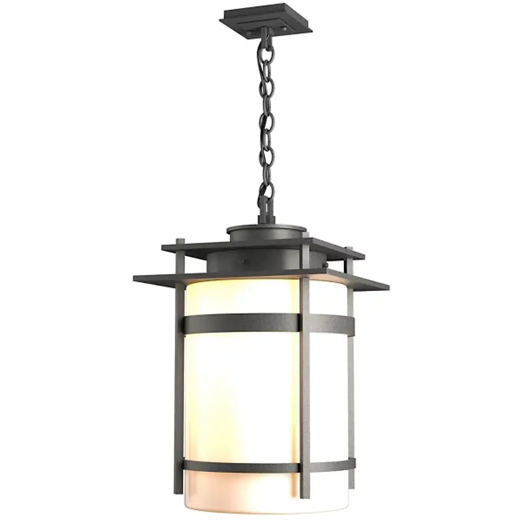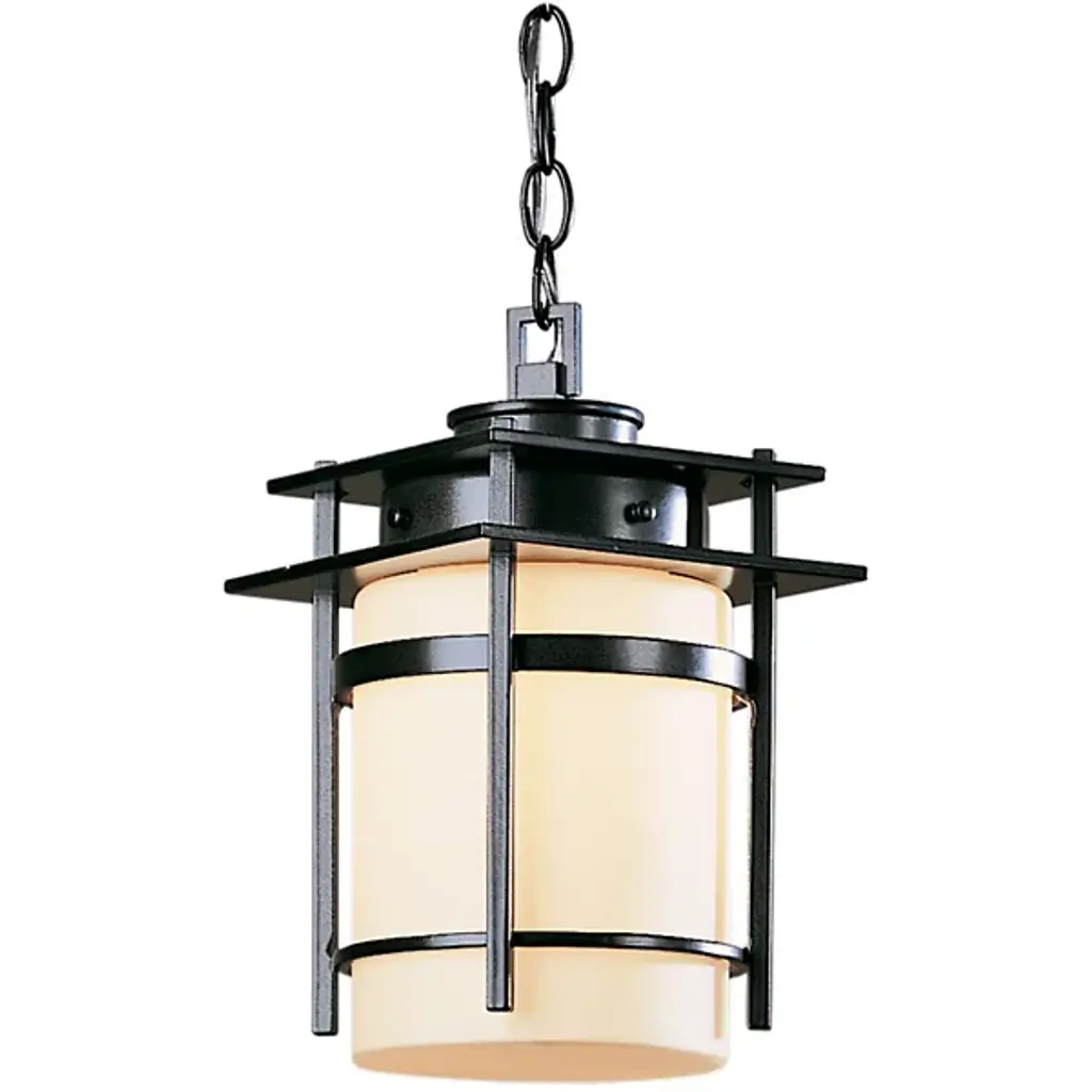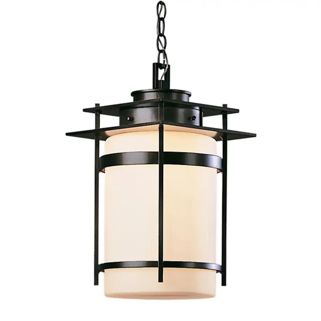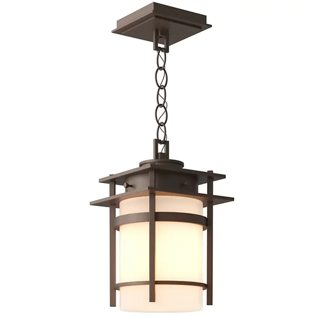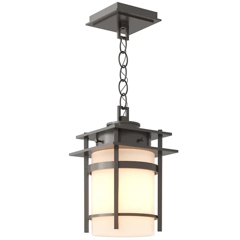 Adorn your favorite outdoor space with the Banded Outdoor Pendant from Hubbardton Forge, a clean and expressive piece that is at once familiar, reminiscent of the art style of Eastern cultures. An open, square finial connects to a simple chainlink and upholds two flat, square metal plates that act as the roof of the piece. Four metal bars drop down, gently enclosing the central, cylindrical shade alongside two metal bands. A single bulb rests at the center of the piece, bringing a warm and thoughtful illumination to the space, one that instantly relaxes the senses.