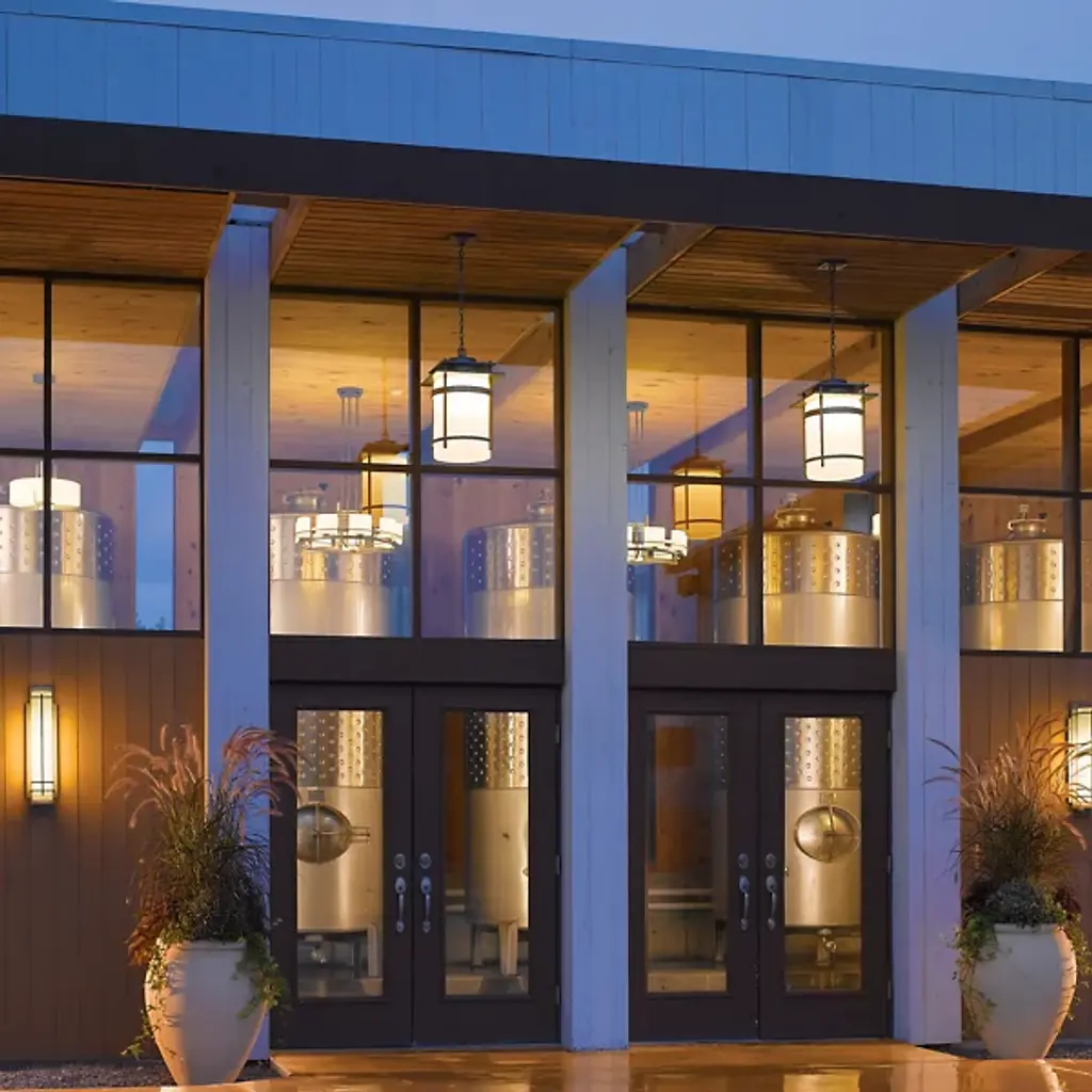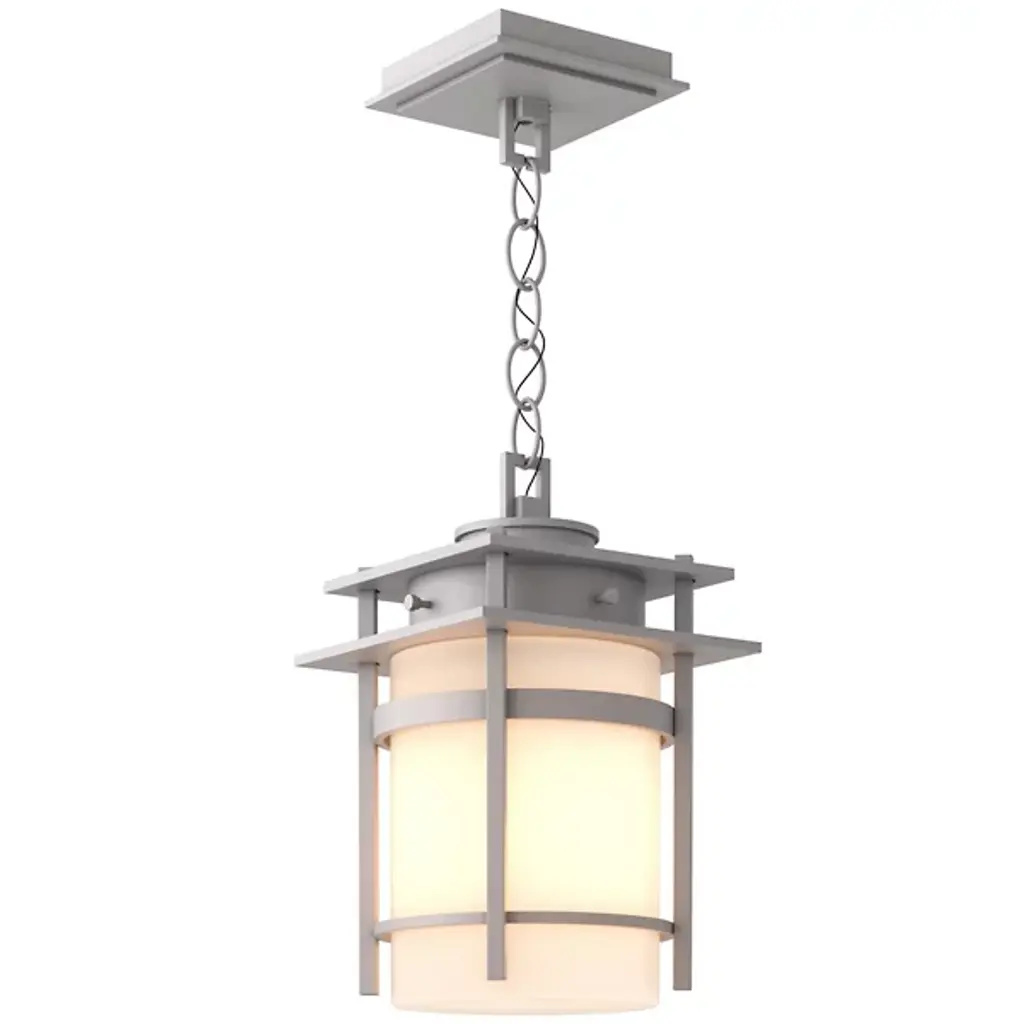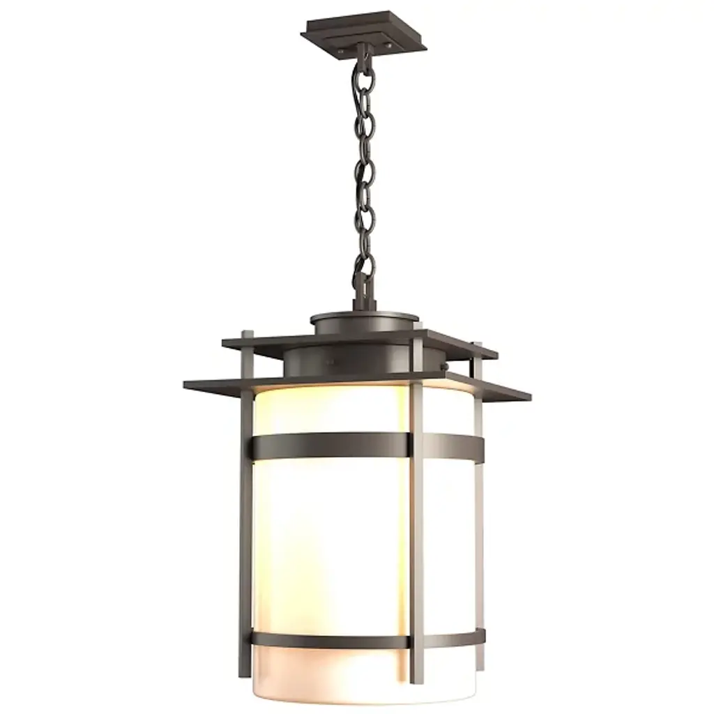 Adorn your favorite outdoor space with the Banded Outdoor Pendant from Hubbardton Forge, a clean and expressive piece that is at once familiar, reminiscent of the art style of Eastern cultures. An open, square finial connects to a simple chainlink and upholds two flat, square metal plates that act as the roof of the piece. Four metal bars drop down, gently enclosing the central, cylindrical shade alongside two metal bands. A single bulb rests at the center of the piece, bringing a warm and thoughtful illumination to the space, one that instantly relaxes the senses.
