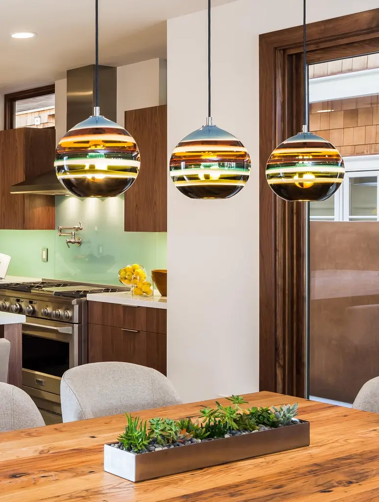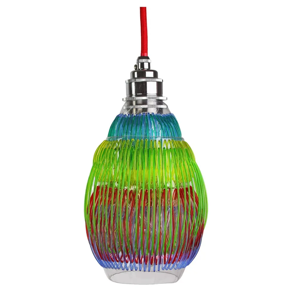Born from a love of color, these striking pieces draw inspiration from the rich hues and undulating topography of Southern California. Alternating layers of opaque and transparent colors are applied to clear glass. Overlaps create opportunities for new colors to be formed, which adds to the depth of the pieces. The intense color is then complemented by the simple shape. Hand blown and shaped in lead free crystal. No molds are used, and each glass shape is unique. Designed and made by Siemon & Salazar in California. Signed and dated.SPECSDimensions: 9.0” Ø, 7.0” HMaterials: glass, metalProduct weight: 5.5 lbsLight source: medium base E26 socketLamping: E26 base, G25 lamp, 40 W max250 V AC MaxRound canopy with cloth covered SJT-3 CableCanopy dimensions: 5” Ø, 0.3” Field adjustable drop length: 0’6” min - 6’0” maxCanopy finish matches Metal Finish.Suitable for sloped ceilingsUL listed for damp locationsC-UL-USLAMPINGG25 LED bulb included - 2700 K, 90 CRI, 3.8 W, 350 lumens, 120 V AC