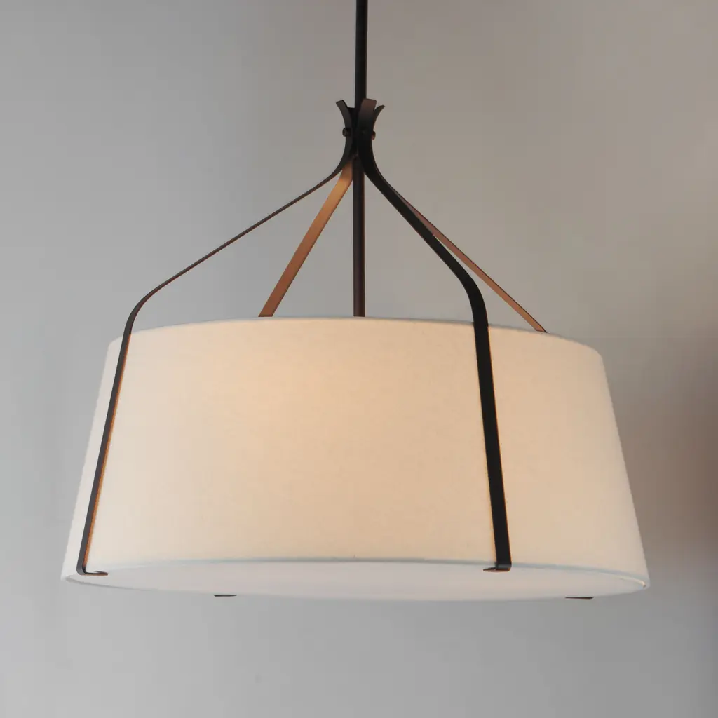 Inspired by timeless tailoring and architectural form, the Bandera collection reimagines the classic fabric shade pendant with refined, sculptural detail. A gracefully flared metal yoke suspends an elegant linen shade--offered in either Oatmeal with Dark Bronze or crisp White with Natural Aged Brass. A matching fabric diffuser on the larger pendants creates a soft, ambient glow ideal for dining areas, bedrooms, and entry spaces. The coordinating wall sconce extends the tailored aesthetic to more intimate settings, perfect for bedside or hallway installations. Balancing crisp geometry with warm texture, Bandera brings an elevated, transitional presence to interiors.