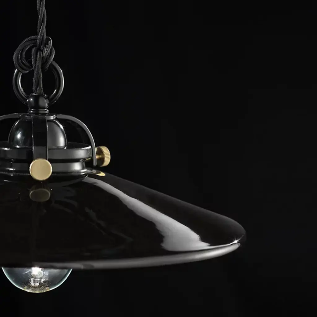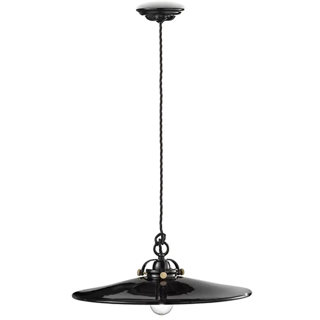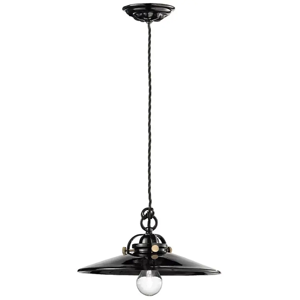 The B&W Pendant by Ferroluce gives your home a dashing look with an industrial character. This handmade pendant is secured by a braided cord attached to a compact canopy at your ceiling. A dome-shaped crown sits atop a brim-style ceramic shade, sporting industrial accents. Within this shade rests a bare bulb that vibrantly illuminates your living space with a comfortable down glow. Adjust your light's brightness level by pairing the B&W Pendant with a standard dimmer.