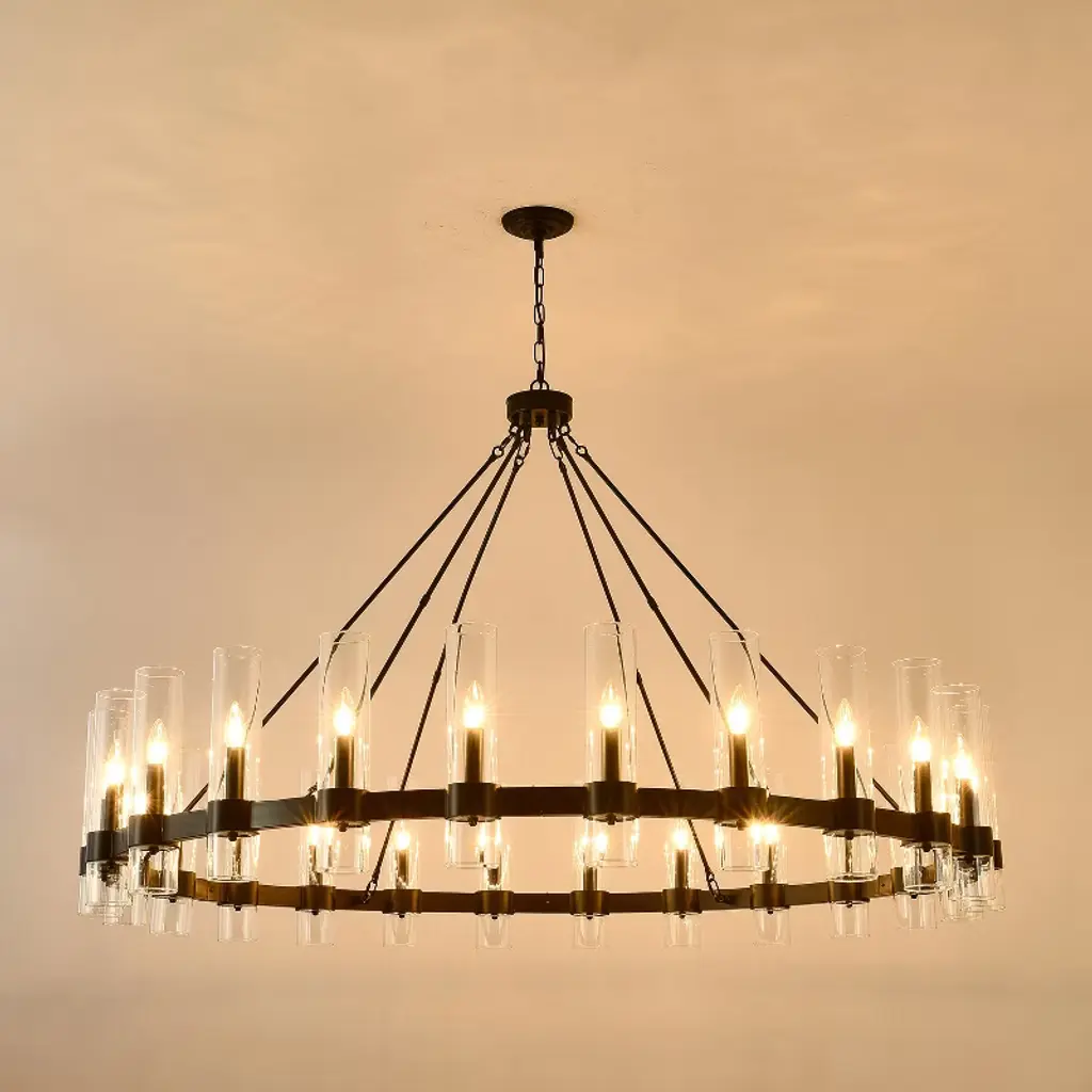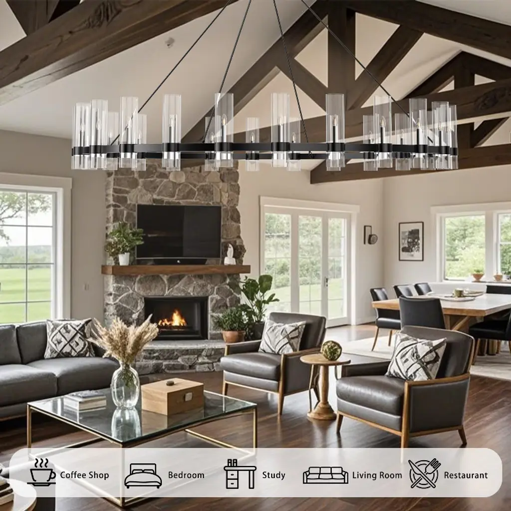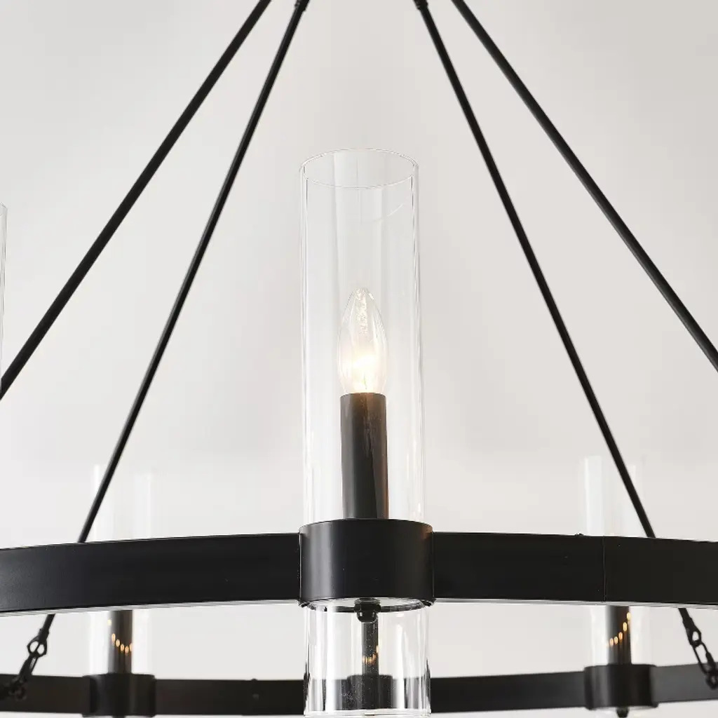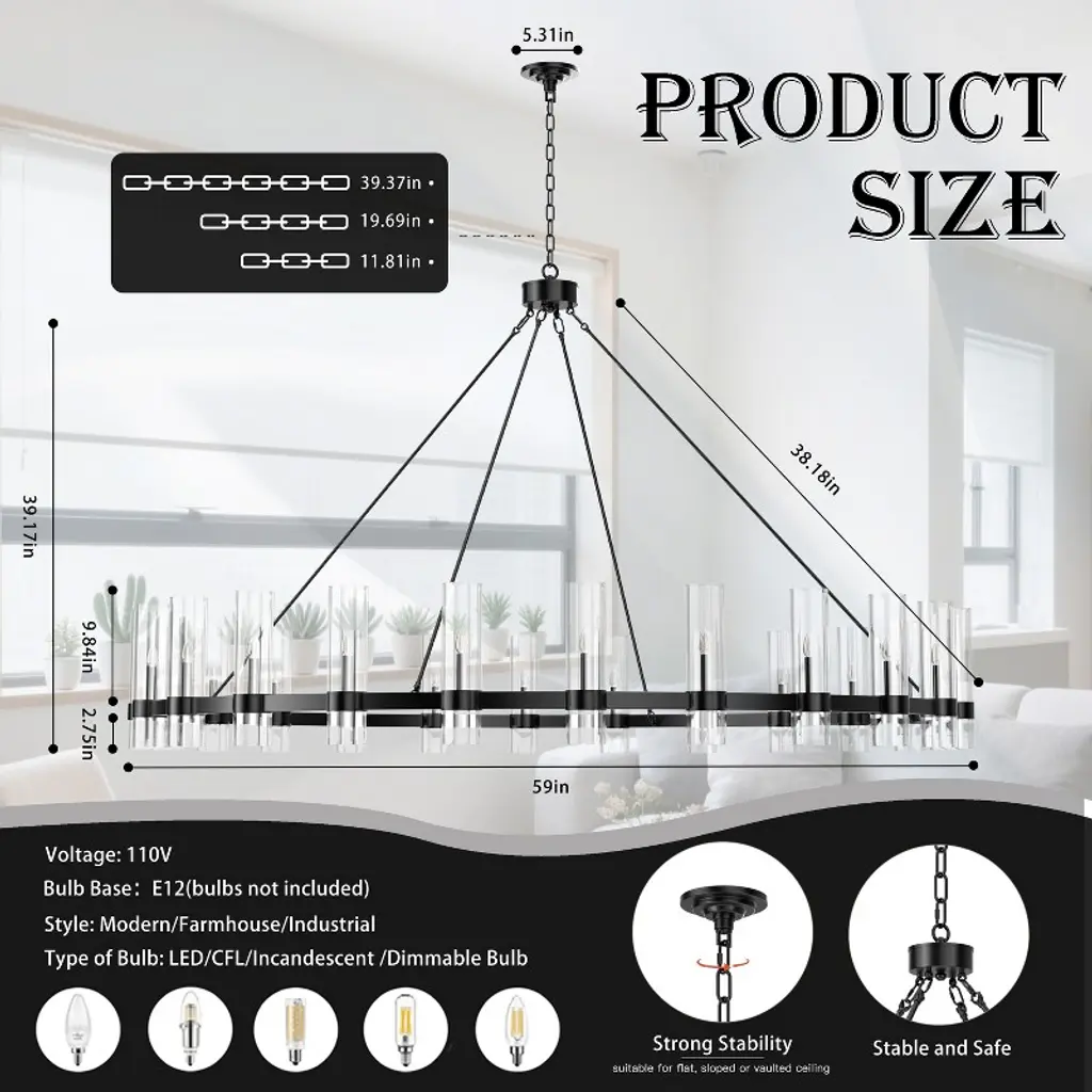 Elevate Your Space with a 24-Light Black Wagon Wheel Chandelier – Modern Farmhouse Elegance Meets Versatile LightingAdd rustic charm and contemporary flair to high ceilings or spacious rooms with this 59-inch Black Wagon Wheel Chandelier. Featuring a sleek glass shade and adjustable height, this fixture blends vintage wagon wheel design with modern functionality. Perfect for dining rooms, foyers, entryways, or farmhouse-inspired interiors, it delivers soft, natural illumination while making a bold decorative statement.SpecificationsDimensions: 59” diameterCeiling Compatibility: Flat, sloped, angled, or vaultedBulb Requirements: 24 x E12 base (max 40W per bulb)Adjustable Chains: 11.81”, 19.69”, 39.37” (mix and match for custom heights)Materials: Metal frame, high-clarity glass shadeIncluded: Mounting hardware, installation guide, glass shadeWhy Choose This Wagon Wheel ChandelierThis glass shade chandelier merges practicality with eye-catching design. The adjustable chains and dimmable compatibility let you tailor lighting for any occasion, while the expansive 59” size ensures it commands attention in grand entryways or cozy dining nooks. Built for durability and ease, it’s a perfect blend of form and function for homeowners and businesses alike.