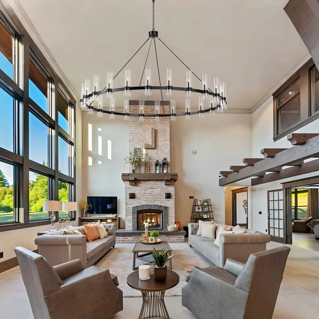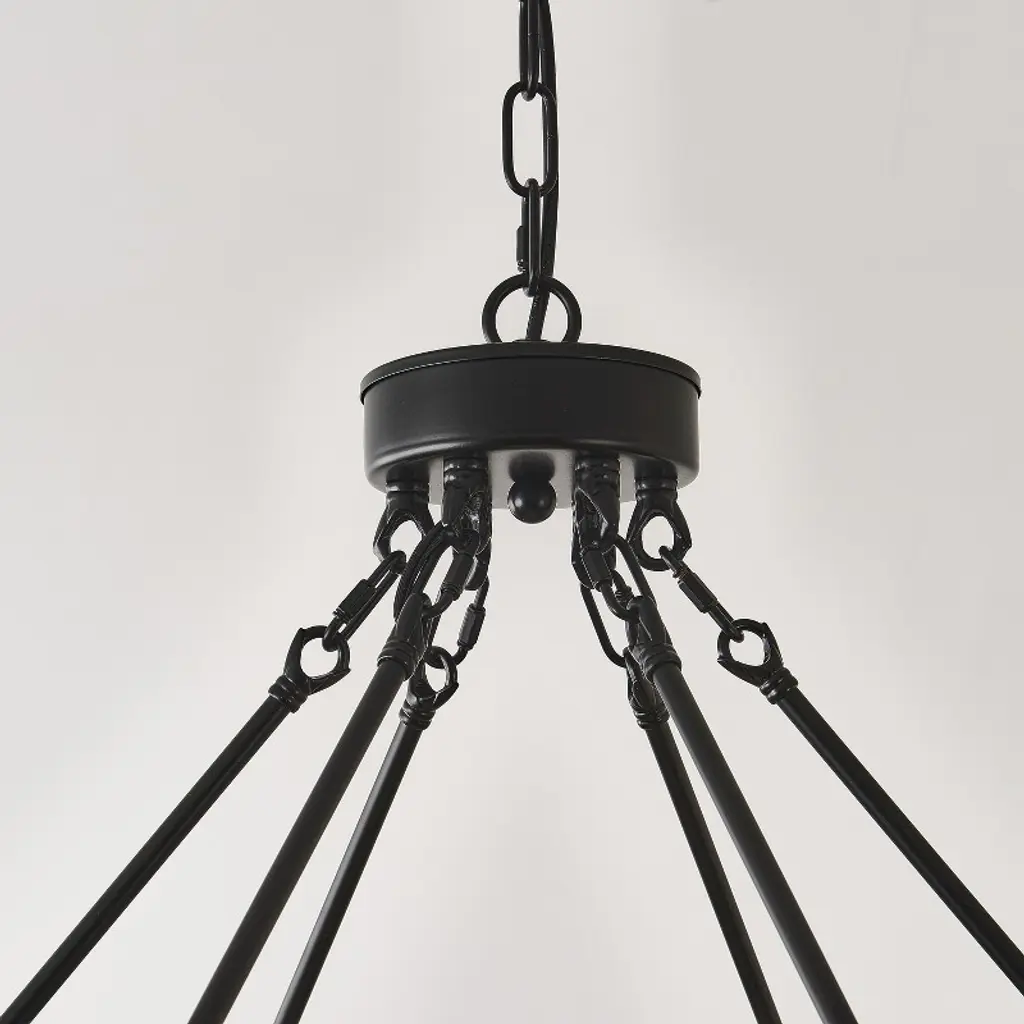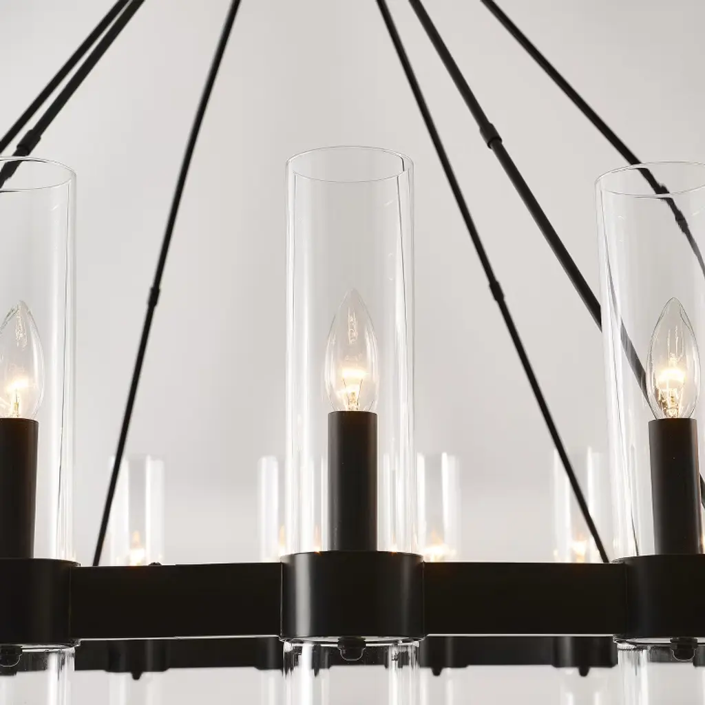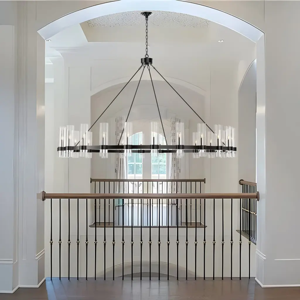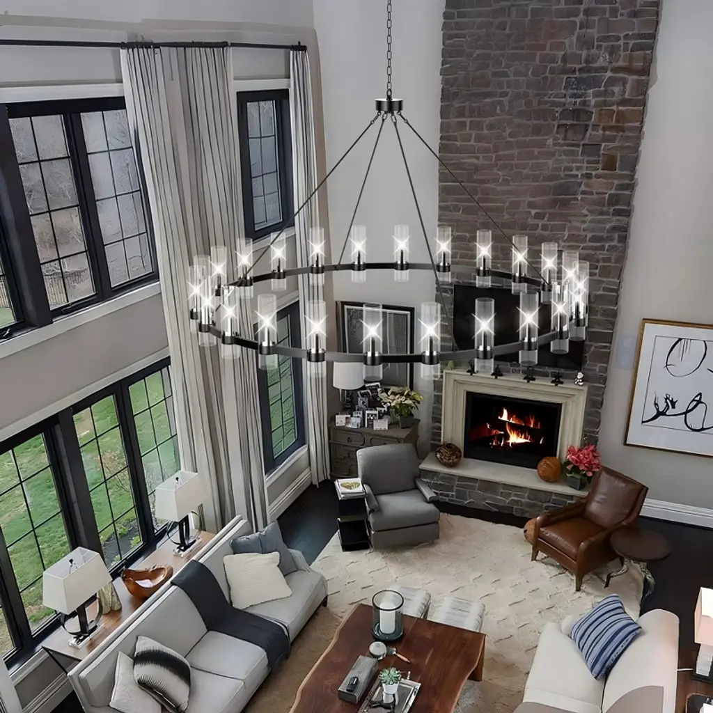 Elevate Your Space with a 24-Light Black Wagon Wheel Chandelier – Modern Farmhouse Elegance Meets Versatile LightingAdd rustic charm and contemporary flair to high ceilings or spacious rooms with this 59-inch Black Wagon Wheel Chandelier. Featuring a sleek glass shade and adjustable height, this fixture blends vintage wagon wheel design with modern functionality. Perfect for dining rooms, foyers, entryways, or farmhouse-inspired interiors, it delivers soft, natural illumination while making a bold decorative statement.SpecificationsDimensions: 59” diameterCeiling Compatibility: Flat, sloped, angled, or vaultedBulb Requirements: 24 x E12 base (max 40W per bulb)Adjustable Chains: 11.81”, 19.69”, 39.37” (mix and match for custom heights)Materials: Metal frame, high-clarity glass shadeIncluded: Mounting hardware, installation guide, glass shadeWhy Choose This Wagon Wheel ChandelierThis glass shade chandelier merges practicality with eye-catching design. The adjustable chains and dimmable compatibility let you tailor lighting for any occasion, while the expansive 59” size ensures it commands attention in grand entryways or cozy dining nooks. Built for durability and ease, it’s a perfect blend of form and function for homeowners and businesses alike.