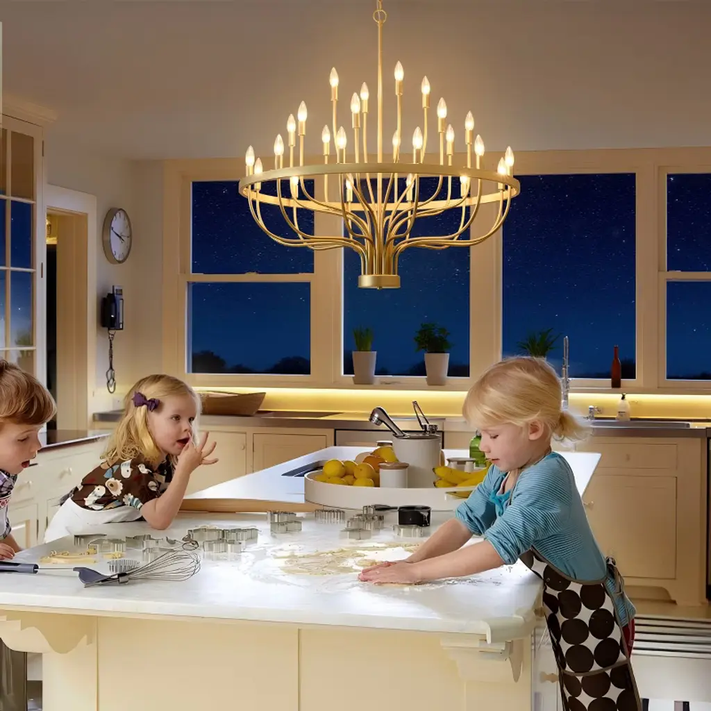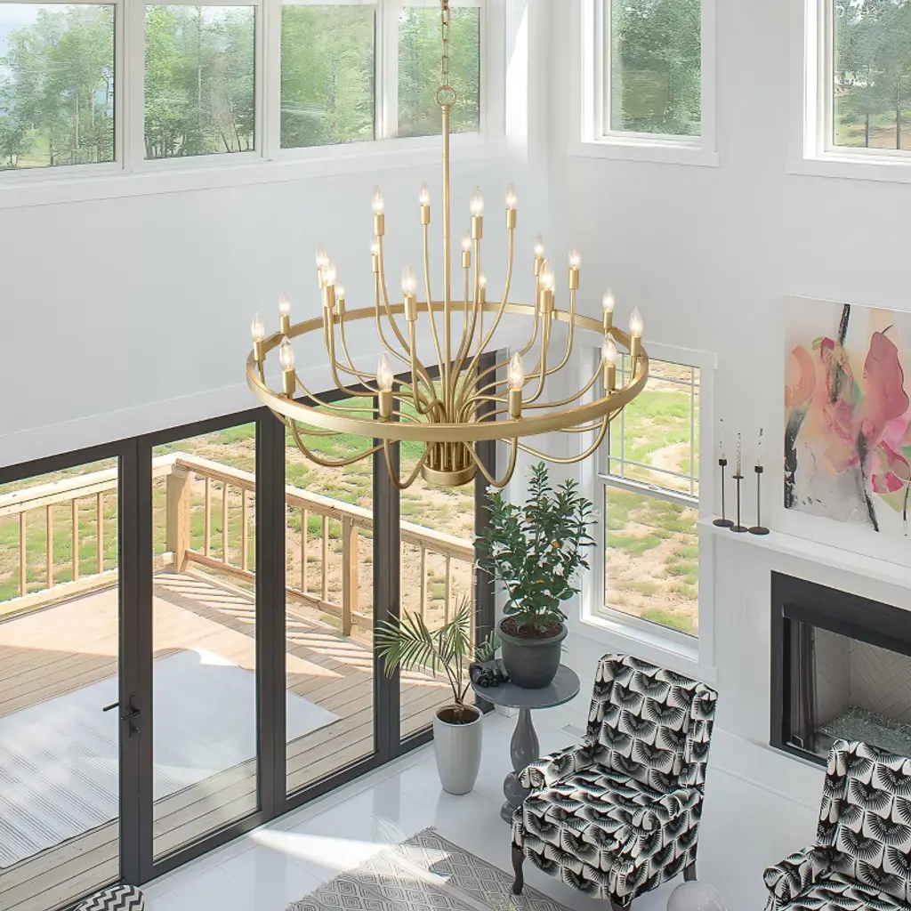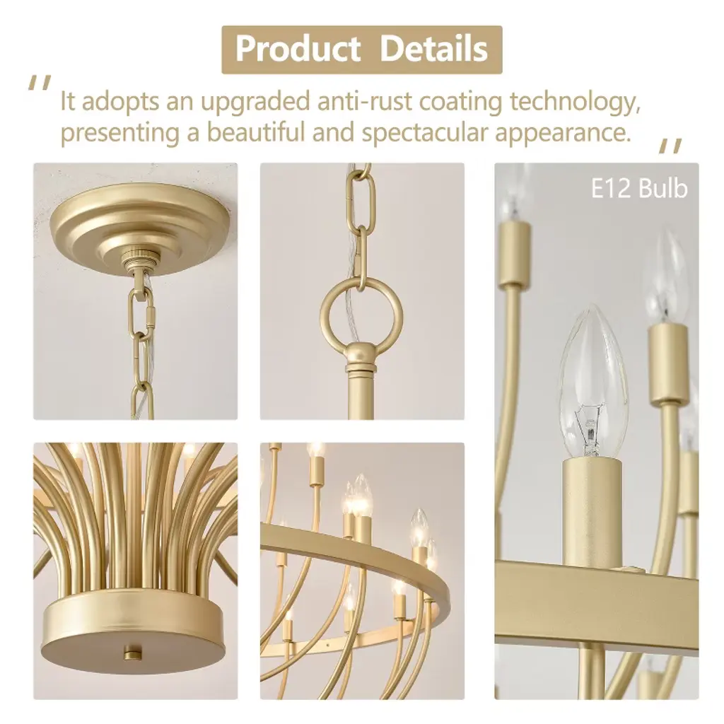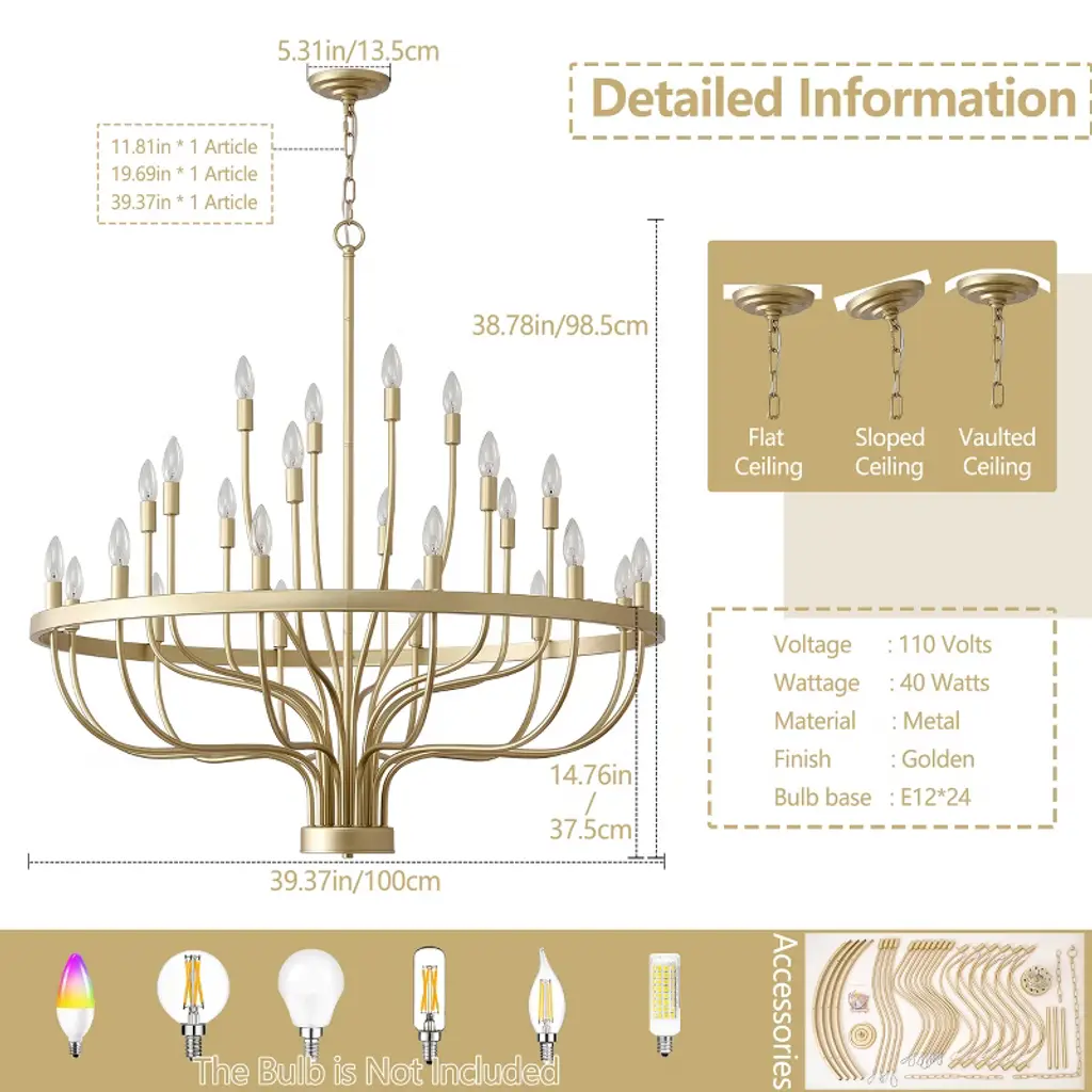Bring Warmth & Character to Every Gathering – A Chandelier Designed for Modern Farmhouse LivingPicture your dining room bathed in soft, inviting light that highlights rustic charm while keeping your space effortlessly stylish.This industrial farmhouse gold chandelier isn’t just a light fixture – it’s the centerpiece your high-ceilinged room deserves. Feature a classic wagon wheel design, this large gold chandelier reminiscent of vintage country charm.With 24 candle-style lights radiating 360° cozy illumination, it effortlessly bridges vintage inspiration and contemporary practicality. Whether hosting holiday dinners or enjoying quiet evenings, its adjustable design adapts to your lifestyle, making it perfect for dining areas, grand foyers, or even covered porches. Crafted with durable metal and timeless details, it’s the upgrade your home has been waiting for.▶Ideal For:•Homeowners seeking a statement piece for large rooms.•Upgrading builder-grade lighting in dining or living areas.•Adding farmhouse charm to modern or transitional interiors.▶Specifications:•Style:Modern, Farmhouse, Rustic, Industrial•Material: Metal•Light Source: E12 (Bulb Not Included)•Number of Lights: 24 Lights•Dimmable: Compatible dimmer switch and dimmable bulbs(Not Included)▶PRODUCT DIMENSION•The whole fixtures: D39.3" x H38.7"•Canopy: Dia 5.31" x H 0.98"•Max hanging height: 109.55"•Min hanging heigh: 38.7"▶Note:•For optimal safety, consult an electrician during installation.