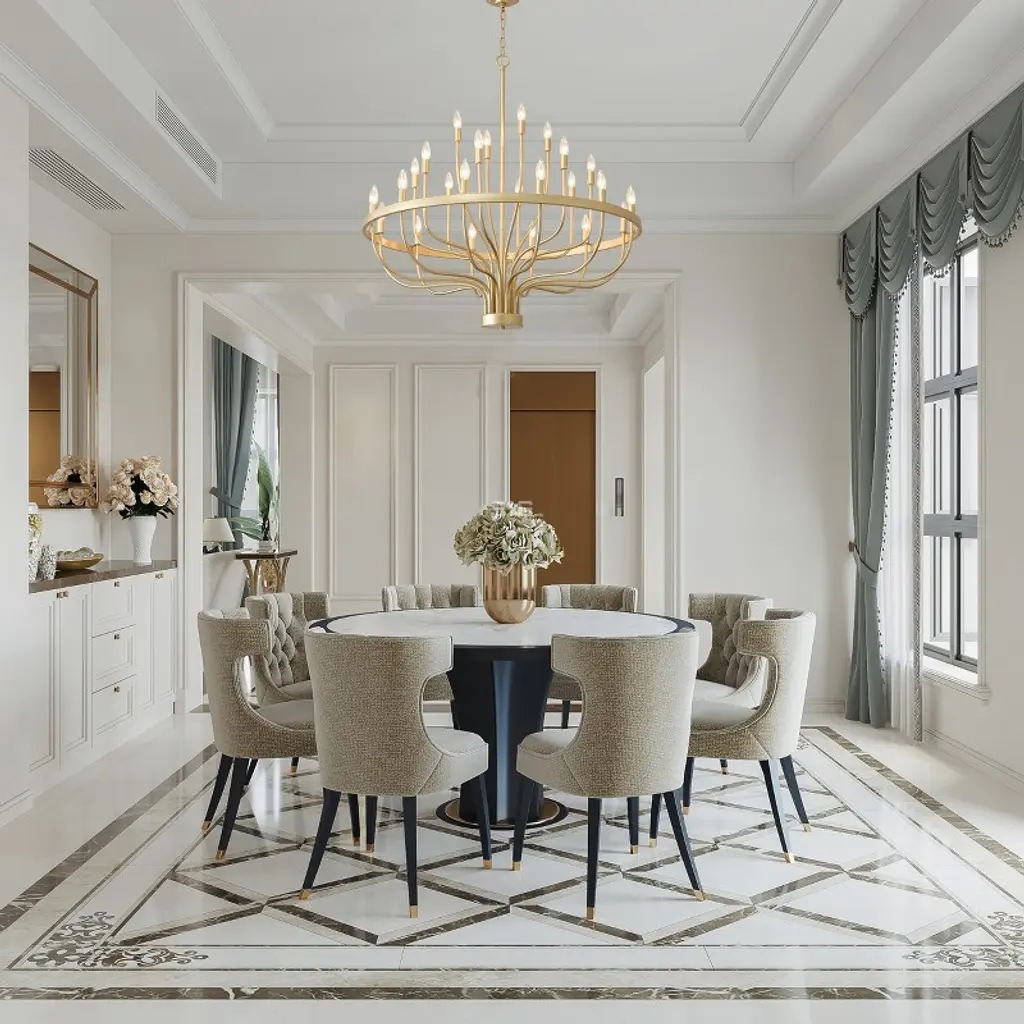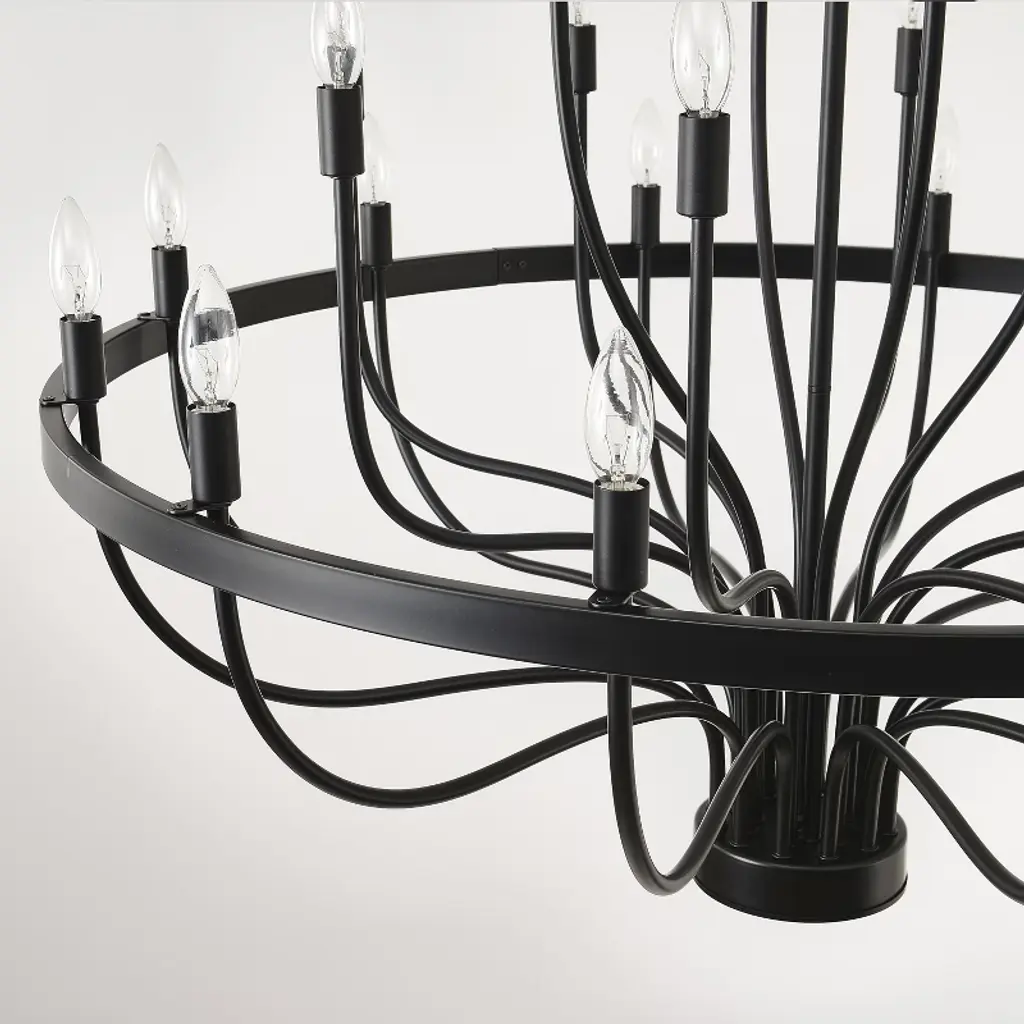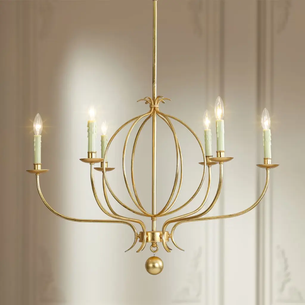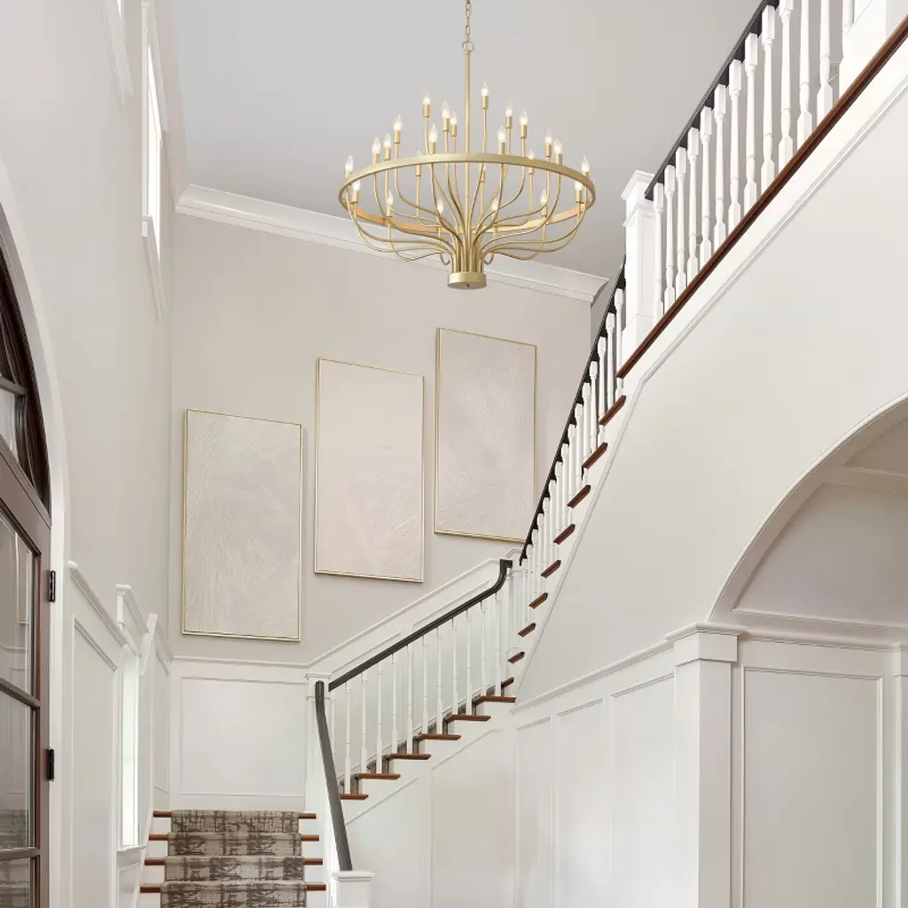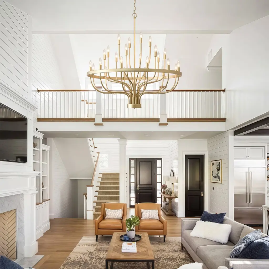 Bring Warmth & Character to Every Gathering – A Chandelier Designed for Modern Farmhouse LivingPicture your dining room bathed in soft, inviting light that highlights rustic charm while keeping your space effortlessly stylish.This industrial farmhouse gold chandelier isn’t just a light fixture – it’s the centerpiece your high-ceilinged room deserves. Feature a classic wagon wheel design, this large gold chandelier reminiscent of vintage country charm.With 24 candle-style lights radiating 360° cozy illumination, it effortlessly bridges vintage inspiration and contemporary practicality. Whether hosting holiday dinners or enjoying quiet evenings, its adjustable design adapts to your lifestyle, making it perfect for dining areas, grand foyers, or even covered porches. Crafted with durable metal and timeless details, it’s the upgrade your home has been waiting for.▶Ideal For:•Homeowners seeking a statement piece for large rooms.•Upgrading builder-grade lighting in dining or living areas.•Adding farmhouse charm to modern or transitional interiors.▶Specifications:•Style:Modern, Farmhouse, Rustic, Industrial•Material: Metal•Light Source: E12 (Bulb Not Included)•Number of Lights: 24 Lights•Dimmable: Compatible dimmer switch and dimmable bulbs(Not Included)▶PRODUCT DIMENSION•The whole fixtures: D39.3" x H38.7"•Canopy: Dia 5.31" x H 0.98"•Max hanging height: 109.55"•Min hanging heigh: 38.7"▶Note:•For optimal safety, consult an electrician during installation.