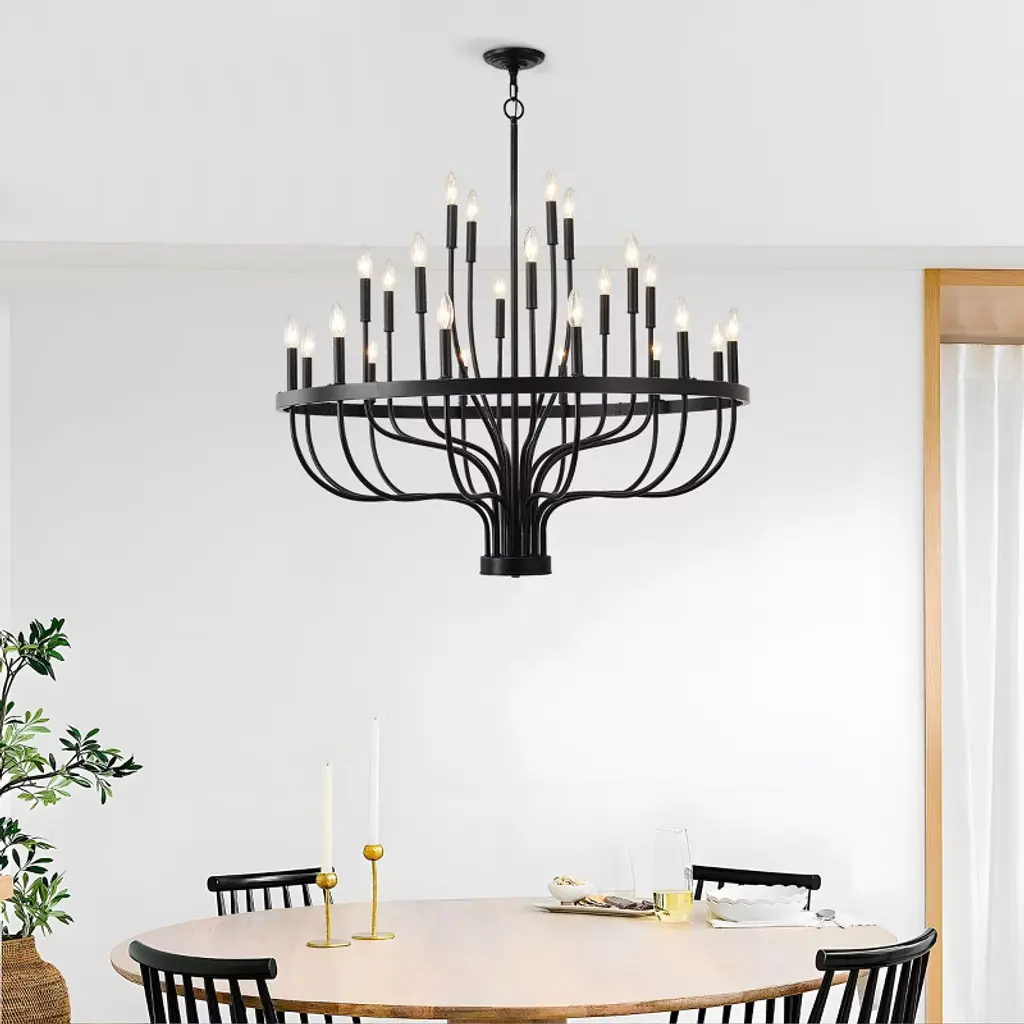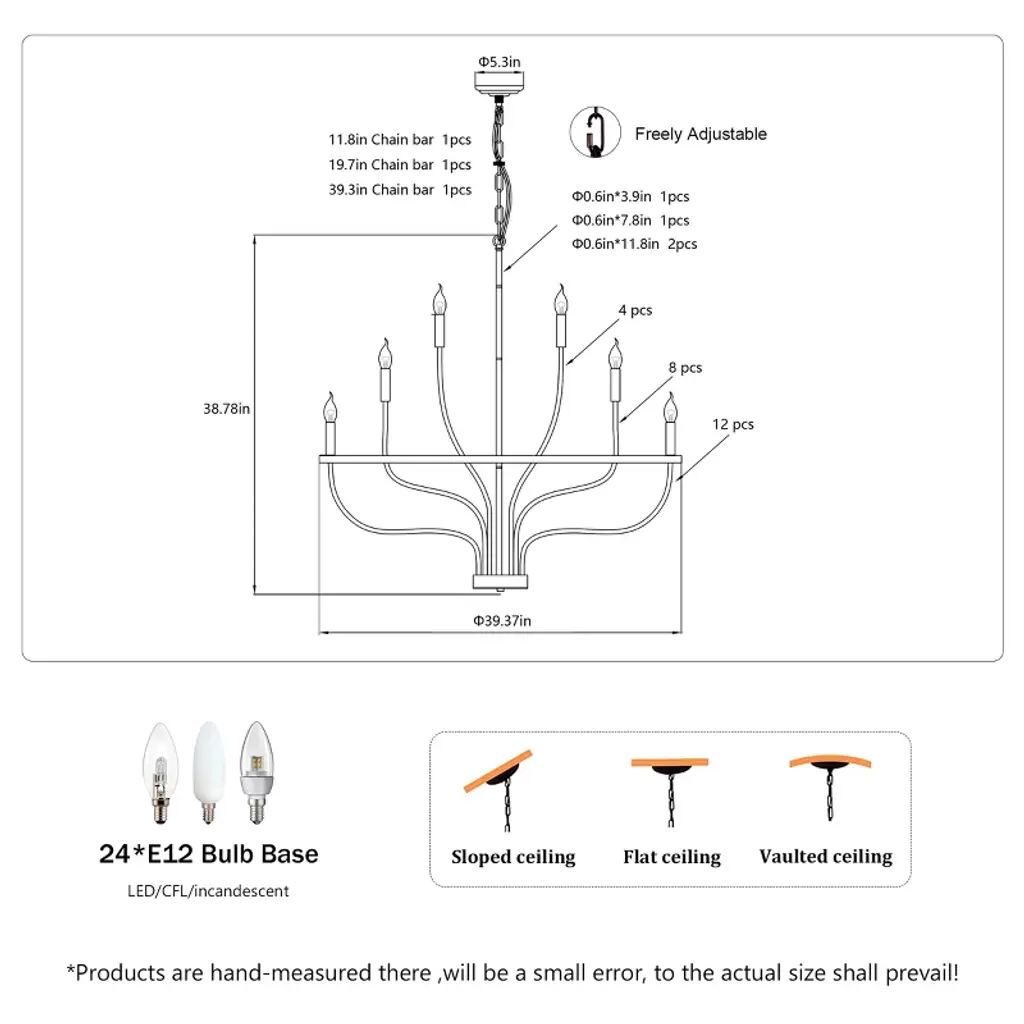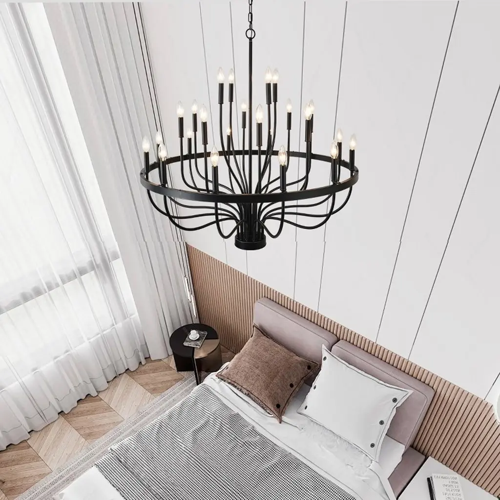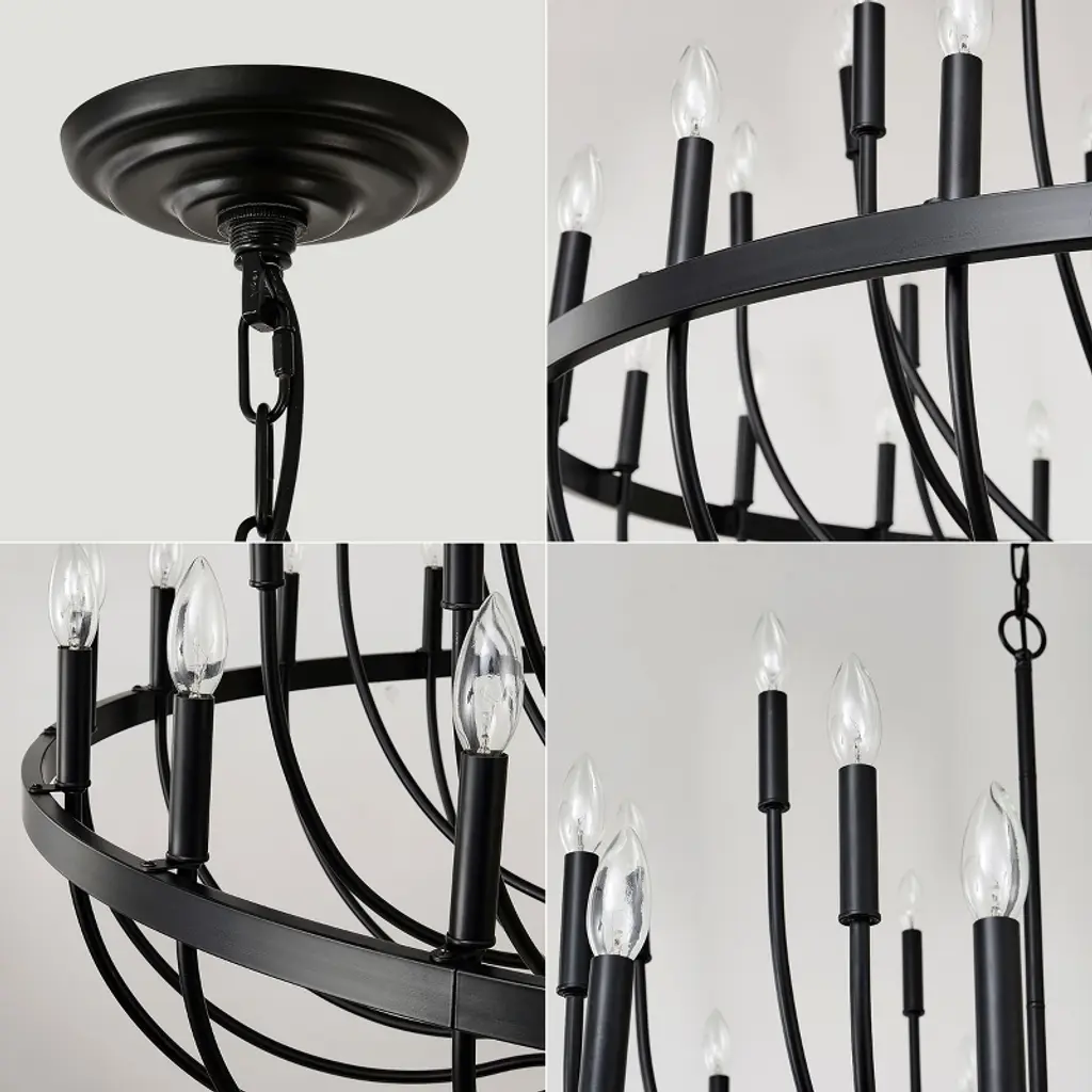 This black farmhouse chandelier provides 360° light coverage and exquisite lighting effects bring warm and pleasant texture, great lighting choice for dining room, entry, staircase, living room. We are committed to providing high-quality modern farmhouse chandelier to each customer please feel free to buy our wagon wheel chandelier ! Style : farmhouse,rustic,industrialMaterial : metal Finish : black paintedVoltage : 110vWattage : 25w ( each bulb)Light: 24*E12 ( bulb NOT included)